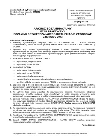 Zawód: technik cyfrowych procesów graficznych Symbol cyfrowy zawodu: 311[51] Numer zadania: 1 Arkusz zawiera informacje prawnie chronione do momentu rozpoczCcia egzaminu 311[51]-01-132 Czas trwania egzaminu: 240 minut ARKUSZ EGZAMINACYJNY ETAP PRAKTYCZNY EGZAMINU POTWIERDZAJ=CEGO KWALIFIKACJE ZAWODOWE CZERWIEC 2013 Informacje dla zdaj>cego: 1. MateriaŽy egzaminacyjne obejmuj>: ARKUSZ EGZAMINACYJNY z treWci> zadania i dokumentacj>, zeszyt ze stron> tytuŽow> KARTA PRACY EGZAMINACYJNEJ oraz KARTB OCENY. 2. Sprawda, czy arkusz egzaminacyjny zawiera 5 stron. Sprawda, czy materiaŽy egzaminacyjne s> czytelne i nie zawieraj> bŽCdnie wydrukowanych stron. Ewentualny brak stron lub inne usterki w materiaŽach egzaminacyjnych zgŽoW przewodnicz>cemu zespoŽu nadzoruj>cego etap praktyczny. 3. Na KARCIE PRACY EGZAMINACYJNEJ: / wpisz swoj> datC urodzenia, / wpisz swój numer PESEL*. 4. Na KARCIE OCENY: / wpisz swoj> datC urodzenia, / wpisz swój numer PESEL*, / wpisz symbol cyfrowy zawodu, / zamaluj kratkC z numerem odpowiadaj>cym numerowi zadania, / przyklej naklejkC ze swoim numerem PESEL w oznaczonym miejscu na karcie. 5. Zapoznaj siC z treWci> zadania egzaminacyjnego, dokumentacj> zaŽ>czon> do zadania, stanowiskiem egzaminacyjnym i jego wyposaceniem. Masz na to 20 minut. Czas ten nie jest wliczany do czasu trwania egzaminu. 6. Po upŽywie tego czasu przyst>p do rozwi>zywania zadania. Rozwi>zanie obejmuje opracowanie projektu realizacji prac okreWlonych w treWci zadania, wykonanie prac zwi>zanych z opracowywanym projektem i sporz>dzenie dokumentacji z ich wykonania. 7. Zadanie rozwi>zuj tylko w zeszycie KARTA PRACY EGZAMINACYJNEJ od razu na czysto, nie otrzymasz dodatkowych kartek. Notatki, pomocnicze obliczenia itp., jeceli nie nalec> do pracy, obwieda lini> i oznacz sŽowem BRUDNOPIS. Zapisy oznaczone BRUDNOPIS nie bCd> oceniane. 8. Po rozwi>zaniu zadania ponumeruj strony pracy egzaminacyjnej. Numerowanie rozpocznij od strony, na której jest miejsce do zapisania tytuŽu pracy. Wszystkie materiaŽy, które zaŽ>czasz do pracy, opisz swoim numerem PESEL* w prawym górnym rogu. 9. Na stronie tytuŽowej zeszytu KARTA PRACY EGZAMINACYJNEJ, wpisz liczbC stron swojej pracy i liczbC sztuk zaŽ>czonych materiaŽów. 10. Zeszyt KARTA PRACY EGZAMINACYJNEJ i KARTB OCENY przekac zespoŽowi nadzoruj>cemu etap praktyczny. Powodzenia! * w przypadku braku numeru PESEL - seria i numer paszportu lub innego dokumentu potwierdzaj>cego tocsamoW5. Zadanie egzaminacyjne Stowarzyszenie Miło ników redniowiecza zleciło firmie poligraficznej wykonanie 18 000 pocztówek z serii „Polskie Zamki”. Opracuj projekt realizacji prac zwi zanych z wykonaniem pocztówki, obejmuj cy przygotowalni poligraficzn , procesy drukowania oraz procesy introligatorskie i wyko czeniowe. Naddatek technologiczny dotycz cy podło a przyjmij równy 10%. Wykonaj projekt graficzny obydwóch stron pocztówki zgodnie z wymaganiami zamawiaj cego (Zał cznik 1) przy zastosowaniu oprogramowania dost pnego w Zał czniku 2. Sporz d pliki PDF, o standardzie drukarskim (spady 3 mm z ka dej strony, rozdzielczo ć zdj ć 300 dpi, fonty osadzone w pliku lub zamienione na krzywe, kolorystyka w standardzie CMYK, wstawione punktury ci cia, pasery kolorów, skale densytometryczne, metryczka pracy). Pliki PDF nazwij odpowiednio pocztowka_zamki_a, pocztowka_zamki_r oraz zapisz w utworzonym na pulpicie komputera folderze PESEL_pocztowka. Wykonaj wydruki obu stron pocztówki. Projekt realizacji prac powinien zawierać: 1. 2. 3. 4. 5. Tytuł pracy egzaminacyjnej. Zało enia technologiczne wynikaj ce z tre ci zadania oraz zał czników. Dobór techniki drukowania pocztówek wraz z uzasadnieniem. Projekt procesów wytwarzania pocztówki w postaci schematu blokowego. Wypełnion Kart Zamówienia. Dokumentacja z wykonanych prac powinna zawierać: 6. Opisany zrzut z ekranu, zawieraj cy otwarty program graficzny wykorzystany do opracowania pocztówki, z uwidocznion nazw programu. 7. Opisane zrzuty z ekranu, ilustruj ce czynno ci wykonywane w programie graficznym, zwi zane z opracowywaniem: − szablonu pierwszej i drugiej strony pocztówki (awersu i rewersu) z uwidocznieniem formatu, marginesów wewn trznych, spadów, − projektu graficznego pierwszej i drugiej strony pocztówki (awersu i rewersu) z uwidocznieniem tła, kolorystyki, rozdzielczo ci, − pliku PDF pierwszej i drugiej strony pocztówki (awersu i rewersu) zgodnie ze standardem drukarskim. 8. Kolorowy wydruk pierwszej strony pocztówki w rzeczywistym formacie (skala 1:1) wykonany z gotowego pliku PDF. 9. Jednokolorowy wydruk drugiej strony pocztówki w rzeczywistym formacie (skala 1:1) wykonany z gotowego pliku PDF. Zrzuty z ekranu wklej do dokumentu Microsoft Word. Na jednej stronie o rozmiarze A4, orientacji pionowej, umie ć dwa zrzuty, ka d stron podpisz numerem PESEL. Utworzony dokument zapisz pod nazw zrzuty_ekranowe w folderze PESEL_pocztowka i wydrukuj. Strona 2 z 5 Do wykonania zadania wykorzystaj: Wymagania dotycz ce projektu pocztówki.............................................................................. Zał cznik 1. Wykaz maszyn, urz dze i oprogramowania dost pnych w firmie poligraficznej .....Zał cznik 2. Wykaz materiałów dost pnych w firmie poligraficznej ..............................................Zał cznik 3. oraz − zlokalizowany na pulpicie komputera folder o nazwie 311[51]-01-132, zawieraj cy pliki: zdj cia zamków (bedzin1.jpg, malbork.jpg, mirow.jpg, niedzica.jpg, pieskowa.jpg), szkic odr czny drugiej strony pocztówki (rewers_odreczny.jpg), − zamieszczony w KARCIE PRACY EGZAMINACYJNEJ druk Karta zamówienia. Do wykonania zadania przygotowano: − stanowisko komputerowe z pakietem programów do obróbki grafiki, − drukark . Czas przeznaczony na wykonanie zadania wynosi 240 minut. Zał cznik 1. Wymagania dotycz ce projektu pocztówki Pocztówk nale y wykonać w formacie 150 x 100 mm w kolorystyce 4 + 1 na podło u jednostronnie powlekanym o gramaturze pomi dzy 280