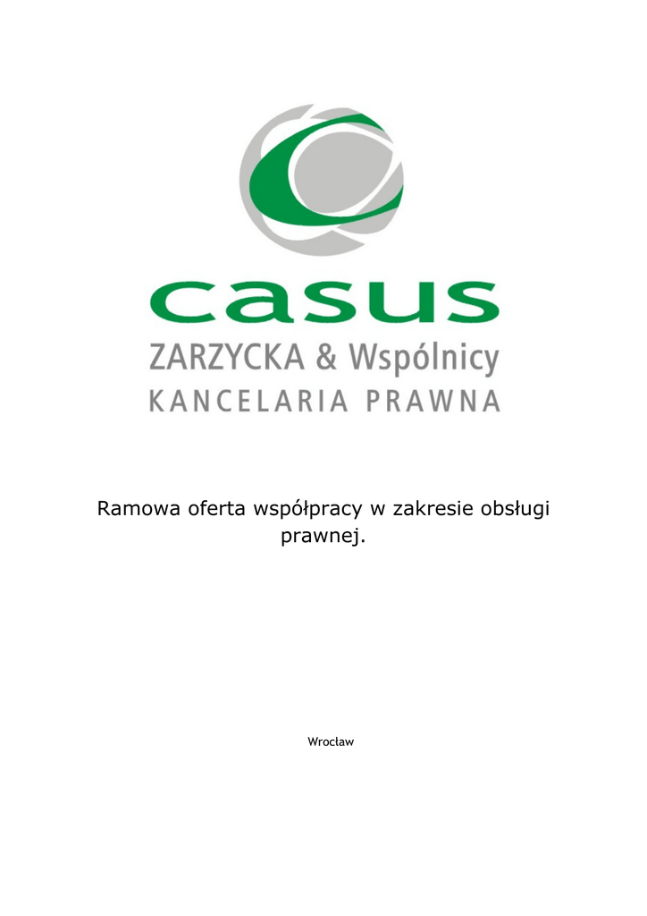 Ramowa oferta współpracy w zakresie obsługi prawnej. Wrocław Prezentowana oferta składa się z następujących części: I. Prezentacja Kancelarii CASUS, ZARZYCKA & Wspólnicy. II. Prezentacja prawników Kancelarii. III. Zakres oferowanych usług prawnych. IV. Proponowane zasady współpracy. I. Prezentacja Kancelarii CASUS, ZARZYCKA & Wspólnicy CASUS, ZARZYCKA & Wspólnicy Kancelaria Prawna założona została w grudniu 2006 r. Siedziba Spółki znajduje się we Wrocławiu przy ul. Kleczkowskiej 43. Kancelaria od początku swojej działalności wchodzi w skład Grupy Casus Finanse. Spółka CASUS Finanse sp. z o.o. jest komandytariuszem Kancelarii. Kancelaria udziela pomocy prawnej zarówno polskim jak i zagranicznym podmiotom gospodarczym w zakresie prawa polskiego. Ponadto współpracuje z zagranicznymi kancelariami prawnymi na terenie całego świata zapewniając przedsiębiorcom obsługę prawną transakcji prowadzonych poza polską jurysdykcją. Zespół Kancelarii tworzą doświadczeni radcowie prawni, adwokaci, a także aplikanci tych profesji, którzy świadczą pomoc prawną w języku polskim, angielskim oraz niemieckim. Praktyka firmy obejmuje cały obszar prawa gospodarczego ze szczególnym uwzględnieniem bieżącej i kompleksowej obsługi korporacyjnej, transakcji handlowych, audytów prawnych (due diligence), prawa własności intelektualnej i przemysłowej, prawa nieruchomości, prawa kontraktów i umów cywilnoprawnych, prawa pracy oraz sporów sądowych. Prawnicy Kancelarii obsługują wiele międzynarodowych projektów związanych z zakładaniem spółek z polskim kapitałem na terenie Europy, Azji oraz Ameryki, a także związanych z przejęciami przez polskich przedsiębiorców zagranicznych podmiotów. W tym celu Kancelaria współpracuje z wieloma zagranicznymi doradcami prawnymi, doradcami podatkowymi i audytorami. Będąc blisko biznesu prawnicy Kancelarii CASUS, ZARZYCKA & Wspólnicy potrafią sprostać wszystkim oczekiwaniom swoich Klientów. 2 II. Prezentacja prawników Kancelarii 1. Sylwia Zarzycka – radca prawny, komplementariusz Wykształcenie Radca prawny Sylwia Zarzycka ukończyła w 2000 r. Wydział Prawa i Administracji Uniwersytetu Wrocławskiego, kierunek – prawo oraz Szkołę Prawa Amerykańskiego prowadzoną przy Uniwersytecie Wrocławskim oraz Uniwersytecie Chicago-Kent. W 2003 r. rozpoczęła aplikację radcowską prowadzoną przez Okręgową Izbę Radców Prawnych we Wrocławiu. Do egzaminu radcowskiego przystąpiła w maju 2006 r. Egzamin radcowski zdała z pierwszą lokatą, zdobywając największą spośród zdających osób liczbę punktów. Dnia 20 czerwca 2006 r. została wpisana na listę radców prawnych prowadzoną przez Radę Okręgowej Izby Radców Prawnych we Wrocławiu (numer wpisu 1630). Praktyka zawodowa Praktykę zawodową Sylwia Zarzycka zdobywała od 1999 roku w jednej z największych kancelarii prawniczych na Dolnym Śląsku. Po zdanym egzaminie radcowskim rozpoczęła pracę jako in-house lawyer w międzynarodowej grupie kapitałowej notowanej na GPW w Warszawie, a następnie rozpoczęła działalność gospodarczą w ramach swojej Kancelarii Radcy Prawnego obsługując spółki prawa handlowego zarówno osobowe jak i kapitałowe. Od grudnia 2009 r. jest komplementariuszem w CASUS, ZARZYCKA & Wspólnicy Kancelaria Prawna spółka komandytowa. Specjalizacje Radca prawny Sylwia Zarzycka specjalizuje się w prawie spółek handlowych, szeroko pojętym prawie gospodarczym, procesach inwestycyjnych a także prawie pracy, prawie procesowym oraz prawie kontraktów i umów. 3 Prowadzi bieżącą obsługę prawną firm oraz procesy sądowe. Posługuje się płynnie językiem angielskim, w tym prawniczym językiem angielskim, w którym prowadzi również obsługę prawną podmiotów gospodarczych. Ponadto radca prawny Sylwia Zarzycka bierze udział w wielu międzynarodowych projektach związanych z zakładaniem spółek na terenie krajów Europy, Azji i Ameryki oraz przejęciami spółek na tych kontynentach przez polskich inwestorów. Działalność dodatkowa Radca prawny Sylwia Zarzycka zasiada w radach nadzorczych spółek kapitałowych. Ponadto prowadzi również działalność szkoleniową z zakresu prawa, a w szczególności z kodeksu spółek handlowych oraz prawa pracy. 2. Prawnicy Kancelarii CASUS, ZARZYCKA & Wspólnicy: Kancelaria posiada zespół doświadczonych prawników: 1. Magdalena Makulska – radca prawny Specjalizacja: prawo spółek handlowych, prawo własności przemysłowej, prawo kontraktów i umów 2. Justyna Michalak – Królicka – adwokat Specjalizacja: prawo karne, prawo karne gospodarcze, procesy sądowe 3. Maria Pertek – radca prawny Specjalizacja: prawo spółek handlowych, prawo kontraktów i umów, transakcje handlowe, due diligence 4. Monika Kręgiel – aplikant radcowski Specjalizacja: windykacja sądowa należności, spory sądowe 5. Agnieszka Janki – aplikant radcowski Specjalizacja: prawo podatkowe, prawo kontraktów i umów, prawo spółek handlowych 4 III. Zakres oferowanych usług prawnych Kancelaria CASUS, ZARZYCKA & Wspólnicy świadczy usługi prawne w następującym zakresie: 1) wydawanie opinii prawnych we wszystkich sprawach związanych ze stosowaniem prawa obowiązującego w Polsce, 2) zastępstwo procesowe w postępowaniu cywilnym (w sądach powszechnych oraz w Sądzie Najwyższym), administracyjnym i przed innymi organami orzekającymi, 3) zastępowanie przed organami administracji rządowej i samorządowej, 4) nadzór nad windykacją roszczeń, 5) przygotowywanie oraz weryfikowanie umów typowych i nietypowych, zawieranych w bieżącej działalności przedsiębiorstwa, 6) obsługę prawną procesów inwestycyjnych, w tym prowadzenie negocjacji umów, 7) bieżąca obsługa korporacyjna spółek, 8) prowadzenie szkoleń z zakresu prawa. W szczególności Kancelaria świadczy usługi z następujących dziedzin prawa: - prawo spółek handlowych: zakładanie i rejestrowanie