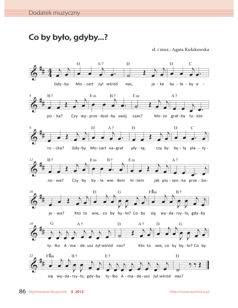 Dodatek muzyczny Co by było, gdyby...? sł. i muz.: Agata Kułakowska 86 Wychowanie Muzyczne 4 2012 http://www.wychmuz.pl Dodatek muzyczny 1. Gdyby Mozart żył wśród nas, jaka byłaby epoka? Czy wyprzedzałby swój czas? Może grałby także rocka? Gdyby Mozart nagrał płytę, czy by była platynowa? Czy by była wielkim hitem jak piosenka przebojowa? Ref. Kto to wie, co by było? Co by się wydarzyło, gdyby tylko Amadeusz żył wśród nas? 2. Gdyby Mozart żył wśród nas, Jakiej słuchałby muzyki? Może techno albo jazzu, może rapu lub klasyki? Czy by nosił MP trójkę, i słuchawki w uszach dwie? Czy by wdał się czasem w bójkę, nosił dżinsy? Kto to wie? Ref. Kto to wie, co by było? Co by się wydarzyło, gdyby tylko Amadeusz żył wśród nas? 3. Gdyby Mozart żył wśród nas, Czy by grał i ćwiczył stale? Czy idolem byłby mas? Nie odpowiem. Nie wiem, ale choć go nie ma już wśród nas, żyje wciąż muzyka jego i przypomni nam nie raz tego człowieka wielkiego. Ref. Kto to wie, co by było? Co by się wydarzyło, gdyby tylko Amadeusz żył wśród nas? http://www.wychmuz.pl Wychowanie Muzyczne 4 2012 87