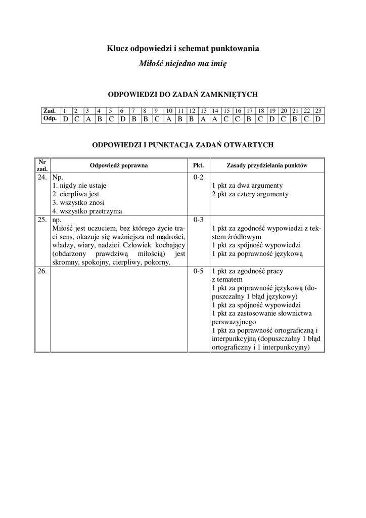 Klucz odpowiedzi i schemat punktowania Miło niejedno ma imi ODPOWIEDZI DO ZADA ZAMKNI TYCH Zad. Odp. 1 2 3 4 5 6 7 8 9 10 11 12 13 14 15 16 17 18 19 20 21 22 23 D C A B C D B B C A B B A A C C B C D C B C D ODPOWIEDZI I PUNKTACJA ZADA OTWARTYCH Nr zad. Odpowied poprawna 24. Np. 1. nigdy nie ustaje 2. cierpliwa jest 3. wszystko znosi 4. wszystko przetrzyma 25. np. Miło jest uczuciem, bez którego ycie traci sens, okazuje si wa niejsza od m dro ci, władzy, wiary, nadziei. Człowiek kochaj cy (obdarzony prawdziw miło ci ) jest skromny, spokojny, cierpliwy, pokorny. 26. Pkt. 0-2 0-3 0-5 Zasady przydzielania punktów 1 pkt za dwa argumenty 2 pkt za cztery argumenty 1 pkt za zgodno wypowiedzi z tekstem ródłowym 1 pkt za spójno wypowiedzi 1 pkt za poprawno j zykow 1 pkt za zgodno pracy z tematem 1 pkt za poprawno j zykow (dopuszczalny 1 bł d j zykowy) 1 pkt za spójno wypowiedzi 1 pkt za zastosowanie słownictwa perswazyjnego 1 pkt za poprawno ortograficzn i interpunkcyjn (dopuszczalny 1 bł d ortograficzny i 1 interpunkcyjny) 27. Kryteria oceny wypracowania Nr kryt. Kryteria oceny Punktacja 1 TEMAT (0 - 7 pkt) 1. Tekst w cz ci lub w cało ci jest zgodny z tematem. 0-1 2. Rozwini cie tematu obejmuje: a. trafny dobór informacji uzasadniaj cych tez , 0-1 b. wykorzystanie co najmniej dwóch argumentów 0–1 c. posłu enie si trzema argumentami 0-1 d. wnioskowanie wynikaj ce z realizacji tematu, 0–1 e. podsumowanie rozwa a . 0-1 3. Praca jest poprawna pod wzgl dem rzeczowym. 0-1 2 KOMPOZYCJA (0 - 3 pkt)* 4. Tekst ma kompozycj trójdzieln z zachowaniem wła ciwych proporcji. 0-1 5. Tekst jest spójny (istniej j zykowe nawi zania pomi dzy poszczególnymi 0 - 1 cz ciami pracy). 6. Tekst jest logicznie uporz dkowany (nie pojawiaj si nieuzasadnione powtó- 0 - 1 rzenia). 3 J ZYK I STYL (0 - 4 pkt)* 7. - Poprawne (pod wzgl dem znaczeniowym) słownictwo, równie 0-3 w zwi zkach frazeologicznych. (dopuszczalne - Poprawna odmiana wyrazów oraz ł czenie wyrazów w zdania i zda trzy bł dy, niepojedynczych w zdania zło one (nie pojawia si powtarzanie tych sa- zale nie od kamych struktur zdaniowych). tegorii) - Trafnie dobrane rodki j zykowe (nie pojawiaj si : wulgaryzmy, 3 bł. - 3 pkt nieuzasadnione kolokwializmy, wielosłowie, wieloznaczno , miesza- 4 bł. - 2 pkt nie stylów, nieuzasadnione powtarzanie wyrazów, nadu ywanie wyra- 5 bł. - 1 pkt zów obcych, nieuzasadnionych wyra e typu: praktycznie rzecz bio- 6 bł. - 0 pkt r c, dajmy na to, powiedzmy). 8. Styl jest funkcjonalny (dostosowany do sytuacji komunikacyjnej, 0-1 formy wypowiedzi). 4 ZAPIS (0 - 3 pkt)* 9. Ortografia jest poprawna. 0-2 0 bł. - 2 pkt 1 bł. - 1 pkt 2 bł. - 0 pkt 10. Interpunkcja jest poprawna (dopuszczalne 3 bł dy). 0-1 0 - 17 Razem * - Punktów z tych kategorii nie przyznaje si , je li praca jest krótsza ni połowa wymaganej obj to ci. Uwaga! Ucze nie otrzymuje punktów za wypracowanie, je eli w cało ci jest ono niezgodne z tematem.