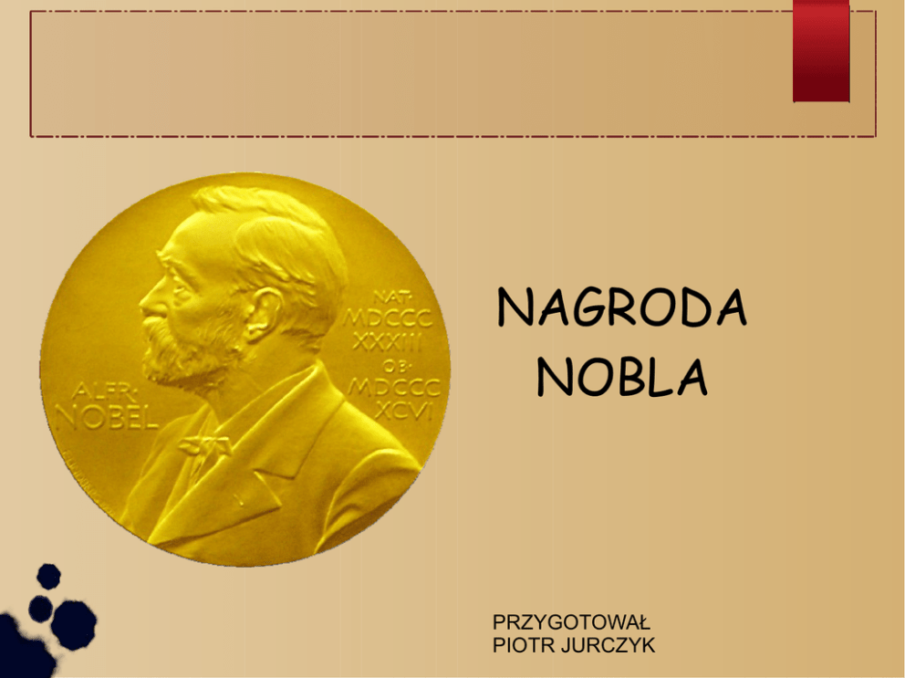 NAGRODA NOBLA PRZYGOTOWAŁ PIOTR JURCZYK NAGRODA NOBLA Nagroda Nobla – wyróżnienie przyznawane za wybitne osiągnięcia naukowe, literackie lub zasługi dla społeczeństw i ludzkości, ustanowione ostatnią wolą fundatora, szwedzkiego przemysłowca i wynalazcy dynamitu – Alfreda Nobla. NAGRODA NOBLA ● Pierwsza uroczystość wręczenia tej nagrody odbyła się w Królewskiej Akademii Muzycznej w Sztokholmie w 1901. Od 1902 nagrody są formalnie przyznawane przez króla Szwecji. ALFRED NOBEL Alfred Nobel jest jednym z najbardziej znanych ludzi na świecie. Swoją sławę zawdzięcza przede wszystkim ufundowanej przez siebie nagrodzie. Nagroda Nobla jest najbardziej prestiżową nagrodą na świecie. Obejmuje ona takie dziedziny jak: ● Literacka Nagroda Nobla ● Pokojowa Nagroda Nobla ● Nagroda Nobla w dziedzinie chemii ● Nagroda Nobla w dziedzinie fizyki ● Nagroda Nobla w dziedzinie ekonomii ● Nagroda Nobla w dziedzinie medycyny lub fizjologii NAGRODA NOBLA Każdy z laureatów otrzymuje złoty medal i dyplom honorowy. Nagroda Nobla ma także wymiar finansowy. Laureat otrzymuje znaczną kwotę pieniężną dawniej 10 milionów koron szwedzkich, czyli około 4,5 miliona złotych, obecnie 8 milionów koron, czyli około 3,6 miliona złotych, aby mógł kontynuować swoje badania lub prace bez konieczności zabiegania o fundusze. POLSCY NOBLIŚCI WŁADYSŁAW RAYMONT HENRYK SIENKIEWICZ MARIA CURIE SKŁODOWSKA WISŁAWA SZYMBORSKA CZESŁAW MIŁOSZ LECH WAŁĘSA POLSCY NOBLIŚCI ● ● ● ● ● ● Henryk Sienkiewicz - Nagrodzony za „wybitne osiągnięcia w dziedzinie eposu” Maria Curie Skłodowska - W dziedzinie fizyki w 1903 r. za prace nad promieniotwórczością. W dziedzinie chemii 1911 r. za rozwój chemii dzięki odkryciu polonu i radu oraz za zbadanie metalicznego radu i jego związków chemicznych. Władysław Reymont - Nagrodzony za wybitny epos narodowy, powieść „Chłopi”. Czesław Miłosz - otrzymał Nagrodę Nobla za całokształt twórczości. Lech Wałęsa -Pokojową Nagrodę Nobla Lech Wałęsa otrzymał w 1983 jako lider podziemnej Solidarności. Wisława Szymborska - otrzymała Nagrodę Nobla za poezję DZIĘKUJĘ ZA UWAGĘ