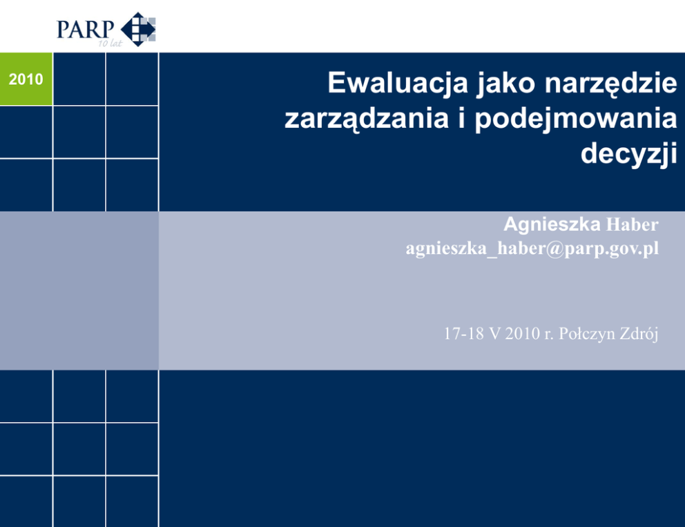 2010 Ewaluacja jako narzędzie zarządzania i podejmowania decyzji Agnieszka Haber [email protected] 17-18 V 2010 r. Połczyn Zdrój Zarządzanie to działalność polegająca na ustalaniu celów i powodowaniu ich realizacji … Badania rynkowe stanowią jedno z najważniejszych narzędzi konkurencyjnych dostępnych dla przedsiębiorstw, którego zastosowanie może przyczynić się do zwiększenia efektywności, budowania strategii firmy, lepszego wykorzystania nakładów, znajomości rynku i klientów etc.. Jednym z kluczowych dostępnych dla administracji narzędzi zarządzania jest ewaluacja. Ewaluacja w zarządzaniu publicznym, podobnie jak badania rynkowe polega na rozpoznaniu mechanizmów rynkowych; jego struktury, stanu i rozwoju jego elementów w celu stworzenia założeń do podejmowania trafnych i efektywnych decyzji. EWALUACJA Ewaluacja to..... Proces zmierzający do stwierdzenia w jakim stopniu założone cele są rzeczywiście realizowane (R.W. Tyler; Basic Principles of Curriculum and Instruction) Proces określenia charakteru, uzyskiwaniu i dostarczaniu takich informacji, które pozwoliłyby na ocenę alternatywnych decyzji (D.L. Stufflebeam; Educational Evaluation: Theory and Practice) Wnikliwe badanie charakterystyki i zalet ewaluowanego programu (…) dostarczenie informacji na temat efektywności badanego obiektu, tak by zoptymalizować jego wyniki, jakość i sprawność działania. (A. Fink "Evaluation for Education and Psychology") Systematyczne badanie wartości, zalet ewaluo-wanego programu (Joint Committee on Standards for Educational Evaluation) Ewaluacja – definicja UE / KE Rozporządzenie Rady Unii Europejskiej nr 1260 z dnia 21 czerwca 1999 r. wprowadzającym ogólne przepisy dotyczące funduszy strukturalnych: ewaluacja prowadzona jest w celu ustalenia efektywności pomocy strukturalnej Wspólnoty oraz w celu oszacowania jej oddziaływania w odniesieniu do celów, a także analizy wpływu na specyficzne problemy strukturalne narzędzie planowania i zarządzania pomocą strukturalną oraz element systemu wspomagający efektywne wykorzystanie funduszy Definicja ewaluacji wg. Komisji Europejskiej: Ocena interwencji według jej rezultatów, oddziaływania oraz potrzeb, które ma/miała spełnić. KE 2000, KE 2004 Ewaluacja a logika interwencji publicznych efektywność? skuteczność? sukces? potrzeby jakoś? oddziaływanie cele rezultaty nakłady działania wyniki Zastosowania wspomaganie procesu podejmowania decyzji / planowanie, poprawa wdrażania i kontrola jakości / podniesienie skuteczności i efektywności działań identyfikacja słabych i mocnych stron wskazanie kierunków rozwoju sygnalizowanie pojawiających się problemów oszacowanie możliwości i ograniczeń określanie stopnia zgodności z przyjętymi założeniami badanie potrzeb zwiększanie profesjonalizmu świadczonych usług demokratyzacja procesu zarządzania element uczenia się i samodoskonalenia Co? Dlaczego? Jak? Kiedy? W wyniku czego? Kto? Co się wydarzyło? itp. poznawczy instrumentalny kontrolny Potrzeba informacyjna Cel ewaluacji Funkcje ewaluacji formatywna konkluzywna społeczno-polityczna administracyjna źródło: opracowanie własne Funkcje ewaluacji Formatywna – zapewnienie postępu – funkcja stymulowania usprawnień i rozwoju organizacyjnego Konkluzywna – selekcja lub sprawozdawczość – funkcja rozliczenia i egzekwowania odpowiedzialności Społeczno-polityczna – kształtowanie motywacji i uzyskanie poparcia społecznego Administracyjna – sprawowanie władzy http://www.ssc.govt.nz w jakim celu? w jakim celu? • kontrolny • instrumentalny • poznawczy Oś funkcji ewaluacji Koncentracja na myśleniu strategicznym – ocena efektów Koncentracja na myśleniu operacyjnym -wdrażanie Partnerstwo i współwłasność Wdrażanie i Planowanie bieżąca jakość Poznanie Rozliczanie i wzmacnianie odpowiedzialności źródło: Ferry M., Olejniczak K., (2008)„Wykorzystanie ewaluacji w zarządzaniu programami unijnymi w Polsce”, s. 24, Warszawa, Sprawne Państwo Program Ernst & Young. Ewaluacja to… …wiele możliwości w jednym narzędziu Zarządzanie Ewaluacja Decyzje Jak osiągnąć założone cele? Jak osiągnąć założone cele? w jakich warunkach działasz? zobacz czego ci brakuje? co robisz by osiągnąć zamierzone cele? jak działasz? „mając pełen obraz dostrzeżesz wszystkie szczegóły” „szukaj odpowiedzi” W jakim stopniu podjęta interwencja przyczyniła się do obserwowanych efektów? „tylko łącząc przyczynę ze skutkiem możesz realnie działać” „nie zawsze jest tak jak na to wygląda” „pamiętaj by metodologia i narzędzia pomiaru nie wypaczyły wyniku” jakie są twoje wyniki? czy uda ci się osiągnąć sukces? jakie są ryzyka dla twojego projektu? „sięgnij po wiedzę która ma realny wpływ na twój biznes” „szukaj najlepszych rozwiązań” „posiadając bieżącą informację podejmuj właściwe działania” Ewaluacja uniwersalne narzędzie, ale…. …kiedy po nie sięgnąć Kontrola-monitoring-ewaluacja WDRAŻANIE PROGRAMU (PROJEKTU) KONTROLA KONTROLA KONTROLA MONITOROWANIE PROGRAMU (PROJEKTU) ewaluacja ewaluacja CZAS ewaluacja . Ewaluacja ex-ante rozporządzenie 1260/1999art..41 ustawa o NPR– art.- 57-59 dok. roboczy KE nr. 2 Przeprowadzana przed wdrażaniem programu. Ocenia na ile planowana interwencja jest trafna z punktu widzenia potrzeb (sektora, beneficjentów) oraz spójna w zakresie planowanych celów i sposobów ich realizacji. Bada kontekst społeczny, gospodarczy, prawny. Służy identyfikacji potencjalnych trudności. Diagnozuje potrzeby i oczekiwania docelowej grupy odbiorców. Ewaluacja on-going rozporządzenie 1260/1999 art. 40 ustawa o NPR– art.- 57 Przeprowadzana w trakcie realizacji programu. Służy identyfikacji aktualnych trudności realizacji przedsięwzięcia bądź ich kontekstu. Stanowi cenne źródło informacji użytecznych przy rozwiązywaniu aktualnych, bądź potencjalny