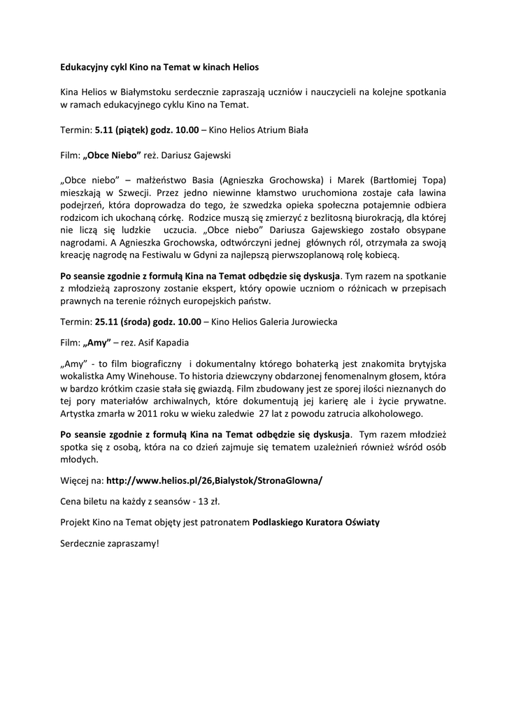Edukacyjny cykl Kino na Temat w kinach Helios Kina Helios w Białymstoku serdecznie zapraszają uczniów i nauczycieli na kolejne spotkania w ramach edukacyjnego cyklu Kino na Temat. Termin: 5.11 (piątek) godz. 10.00 – Kino Helios Atrium Biała Film: „Obce Niebo” reż. Dariusz Gajewski „Obce niebo” – małżeństwo Basia (Agnieszka Grochowska) i Marek (Bartłomiej Topa) mieszkają w Szwecji. Przez jedno niewinne kłamstwo uruchomiona zostaje cała lawina podejrzeń, która doprowadza do tego, że szwedzka opieka społeczna potajemnie odbiera rodzicom ich ukochaną córkę. Rodzice muszą się zmierzyć z bezlitosną biurokracją, dla której nie liczą się ludzkie uczucia. „Obce niebo” Dariusza Gajewskiego zostało obsypane nagrodami. A Agnieszka Grochowska, odtwórczyni jednej głównych ról, otrzymała za swoją kreację nagrodę na Festiwalu w Gdyni za najlepszą pierwszoplanową rolę kobiecą. Po seansie zgodnie z formułą Kina na Temat odbędzie się dyskusja. Tym razem na spotkanie z młodzieżą zaproszony zostanie ekspert, który opowie uczniom o różnicach w przepisach prawnych na terenie różnych europejskich państw. Termin: 25.11 (środa) godz. 10.00 – Kino Helios Galeria Jurowiecka Film: „Amy” – rez. Asif Kapadia „Amy” - to film biograficzny i dokumentalny którego bohaterką jest znakomita brytyjska wokalistka Amy Winehouse. To historia dziewczyny obdarzonej fenomenalnym głosem, która w bardzo krótkim czasie stała się gwiazdą. Film zbudowany jest ze sporej ilości nieznanych do tej pory materiałów archiwalnych, które dokumentują jej karierę ale i życie prywatne. Artystka zmarła w 2011 roku w wieku zaledwie 27 lat z powodu zatrucia alkoholowego. Po seansie zgodnie z formułą Kina na Temat odbędzie się dyskusja. Tym razem młodzież spotka się z osobą, która na co dzień zajmuje się tematem uzależnień również wśród osób młodych. Więcej na: http://www.helios.pl/26,Bialystok/StronaGlowna/ Cena biletu na każdy z seansów - 13 zł. Projekt Kino na Temat objęty jest patronatem Podlaskiego Kuratora Oświaty Serdecznie zapraszamy!