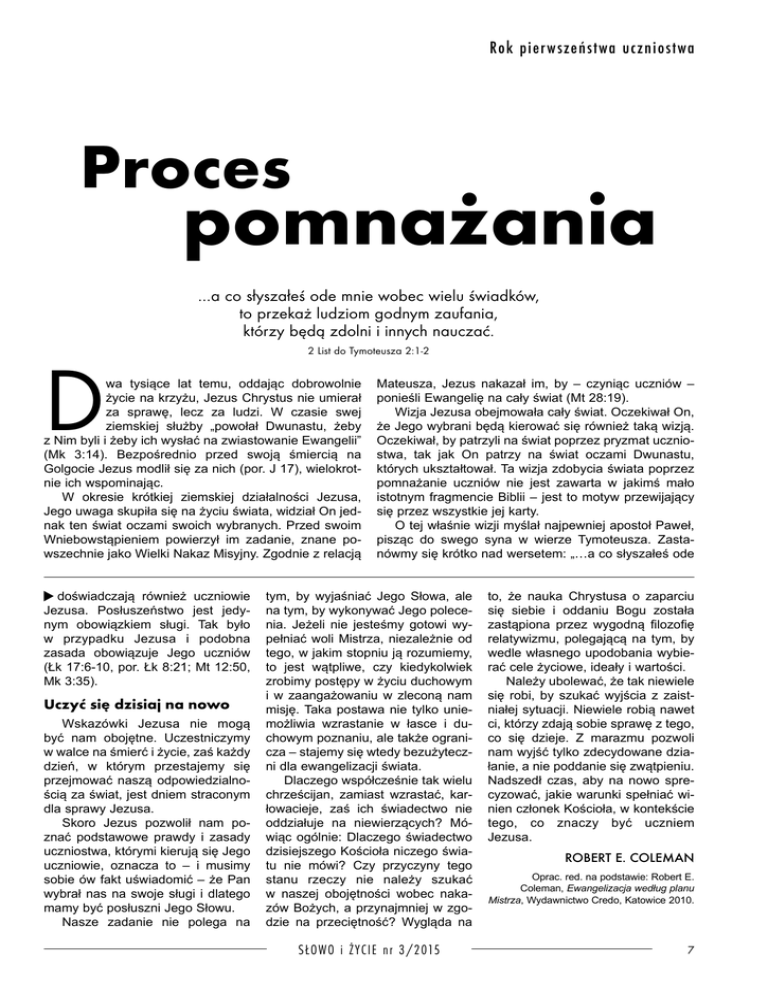 Rok pierwszeństwa uczniostwa Proces pomnażania …a co słyszałeś ode mnie wobec wielu świadków, to przekaż ludziom godnym zaufania, którzy będą zdolni i innych nauczać. D 2 List do Tymoteusza 2:1-2 wa tysiące lat temu, oddając dobrowolnie życie na krzyżu, Jezus Chrystus nie umierał za sprawę, lecz za ludzi. W czasie swej ziemskiej służby „powołał Dwunastu, żeby z Nim byli i żeby ich wysłać na zwiastowanie Ewangelii” (Mk 3:14). Bezpośrednio przed swoją śmiercią na Golgocie Jezus modlił się za nich (por. J 17), wielokrotnie ich wspominając. W okresie krótkiej ziemskiej działalności Jezusa, Jego uwaga skupiła się na życiu świata, widział On jednak ten świat oczami swoich wybranych. Przed swoim Wniebowstąpieniem powierzył im zadanie, znane powszechnie jako Wielki Nakaz Misyjny. Zgodnie z relacją s doświadczają również uczniowie Jezusa. Posłuszeństwo jest jedynym obowiązkiem sługi. Tak było w przypadku Jezusa i podobna zasada obowiązuje Jego uczniów (Łk 17:6-10, por. Łk 8:21; Mt 12:50, Mk 3:35). Uczyć się dzisiaj na nowo Wskazówki Jezusa nie mogą być nam obojętne. Uczestniczymy w walce na śmierć i życie, zaś każdy dzień, w którym przestajemy się przejmować naszą odpowiedzialnością za świat, jest dniem straconym dla sprawy Jezusa. Skoro Jezus pozwolił nam poznać podstawowe prawdy i zasady uczniostwa, którymi kierują się Jego uczniowie, oznacza to – i musimy sobie ów fakt uświadomić – że Pan wybrał nas na swoje sługi i dlatego mamy być posłuszni Jego Słowu. Nasze zadanie nie polega na Mateusza, Jezus nakazał im, by – czyniąc uczniów – ponieśli Ewangelię na cały świat (Mt 28:19). Wizja Jezusa obejmowała cały świat. Oczekiwał On, że Jego wybrani będą kierować się również taką wizją. Oczekiwał, by patrzyli na świat poprzez pryzmat uczniostwa, tak jak On patrzy na świat oczami Dwunastu, których ukształtował. Ta wizja zdobycia świata poprzez pomnażanie uczniów nie jest zawarta w jakimś mało istotnym fragmencie Biblii – jest to motyw przewijający się przez wszystkie jej karty. O tej właśnie wizji myślał najpewniej apostoł Paweł, pisząc do swego syna w wierze Tymoteusza. Zasta nówmy się krótko nad wersetem: „…a co słyszałeś ode tym, by wyjaśniać Jego Słowa, ale na tym, by wykonywać Jego polecenia. Jeżeli nie jesteśmy gotowi wypełniać woli Mistrza, niezależnie od tego, w jakim stopniu ją rozumiemy, to jest wątpliwe, czy kiedykolwiek zrobimy postępy w życiu duchowym i w zaangażowaniu w zleconą nam misję. Taka postawa nie tylko uniemożliwia wzrastanie w łasce i duchowym poznaniu, ale także ogranicza – stajemy się wtedy bezużyteczni dla ewangelizacji świata. Dlaczego współcześnie tak wielu chrześcijan, zamiast wzrastać, karłowacieje, zaś ich świadectwo nie oddziałuje na niewierzących? Mó wiąc ogólnie: Dlaczego świadectwo dzisiejszego Kościoła niczego światu nie mówi? Czy przyczyny tego stanu rzeczy nie należy szukać w naszej obojętności wobec nakazów Bożych, a przynajmniej w zgodzie na przeciętność? Wygląda na S ŁOWO i ŻYC IE n r 3/2015 to, że nauka Chrystusa o zaparciu się siebie i oddaniu Bogu została zastąpiona przez wygodną filozofię relatywizmu, polegającą na tym, by wedle własnego upodobania wybierać cele życiowe, ideały i wartości. Należy ubolewać, że tak niewiele się robi, by szukać wyjścia z zaistniałej sytuacji. Niewiele robią nawet ci, którzy zdają sobie sprawę z tego, co się dzieje. Z marazmu pozwoli nam wyjść tylko zdecydowane działanie, a nie poddanie się zwątpieniu. Nadszedł czas, aby na nowo sprecyzować, jakie warunki spełniać winien członek Kościoła, w kontekście tego, co znaczy być uczniem Jezusa. ROBERT E. COLEMAN Oprac. red. na podstawie: Robert E. Coleman, Ewangelizacja według planu Mistrza, Wydawnictwo Credo, Katowice 2010. 7 © Andrey Popov | Dreamstime.com mnie wobec wielu świadków, to przekaż ludziom godnym zaufania, Najważniejszym elementem którzy będą zdolni i innych nauczać” (2 Tm 2:1-2). Zwrot w drugiej osobie służby czynienia uczniów są ludzie godni zaufania. liczby pojedynczej podkreśla ważGodnym zaufania jest ten, ność jednostki. Spotykając Piotra, Jezus powiedział: „Ty jesteś Szy kto stosuje się do nakazów Pisma Świętego mon, syn Jana; ty będziesz nazwaw każdej dziedzinie swojego życia. ny Kefas (to znaczy: Piotr)” (J 1:42). Ty jesteś Szymon, ty staniesz się skałą. Patrząc na Piotra, Jezus nie widział go takim, ja- miłością, cierpliwością, za moimi prześladowaniami, kim był, ale takim, jakim miał się kiedyś stać. Ogromne cierpieniami... (2 Tm 3:10-11). Jest to spis tego, co możliwości kryją się w życiu jednego człowieka. Paweł przekazał Tymoteuszowi i co ten miał z kolei „A co słyszałeś ode mnie” – ten zwrot podkreśla waż- przekazać ludziom godnym zaufania. ność osobistego kontaktu, wzajemnej poufałości i za„Godni zaufania” – w tych dwu słowach kryje się taufania, powstałego przez lata wspólnej pracy. jemnica powodzenia lub porażki w kształceniu uczniów. Przebywając w więzieniu, Paweł pisał do wiernych Salomon, ów mądry władca dawnego Izraela, powiada: w Filippi, że nie mogąc odwiedzić ich osobiście, pośle Dobrocią swą chełpi się wielu, lecz męża pewnego któż do nich Tymoteusza, swego syna w wierze. W gruncie znajdzie” (Prz 20:6). Liczba ludzi godnych zaufania rzeczy mówił przez to: „Kiedy Tymoteusz przybędzie, ja nigdy nie była zbyt wielka. Bóg wciąż ich poszukuje: sam będę jak gdyby obecny”. Wiele lat wcześniej Paweł „Albowiem oczy Pana obiegają całą ziemię, by wspierać dostrzegł możliwości, kryjące się w tym młodym czło- tych, którzy mają wobec Niego serce szczere (2 Krn wieku z Azji Mniejszej i postanowił zaangażować go 16:9). w swoje życie. „Innych nauczać” – tu właśnie pro