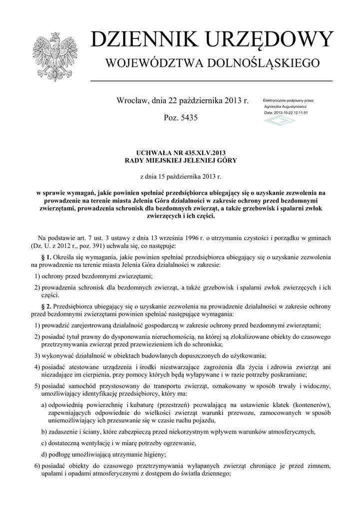 DZIENNIK URZĘDOWY WOJEWÓDZTWA DOLNOŚLĄSKIEGO Wrocław, dnia 22 października 2013 r. Elektronicznie podpisany przez: Agnieszka Augustynowicz Poz. 5435 Data: 2013-10-22 12:11:51 UCHWAŁA NR 435.XLV.2013 RADY MIEJSKIEJ JELENIEJ GÓRY z dnia 15 października 2013 r. w sprawie wymagań, jakie powinien spełniać przedsiębiorca ubiegający się o uzyskanie zezwolenia na prowadzenie na terenie miasta Jelenia Góra działalności w zakresie ochrony przed bezdomnymi zwierzętami, prowadzenia schronisk dla bezdomnych zwierząt, a także grzebowisk i spalarni zwłok zwierzęcych i ich części. Na podstawie art. 7 ust. 3 ustawy z dnia 13 września 1996 r. o utrzymaniu czystości i porządku w gminach (Dz. U. z 2012 r., poz. 391) uchwala się, co następuje: § 1. Określa się wymagania, jakie powinien spełniać przedsiębiorca ubiegający się o uzyskanie zezwolenia na prowadzenie na terenie miasta Jelenia Góra działalności w zakresie: 1) ochrony przed bezdomnymi zwierzętami; 2) prowadzenia schronisk dla bezdomnych zwierząt, a także grzebowisk i spalarni zwłok zwierzęcych i ich części. § 2. Przedsiębiorca ubiegający się o uzyskanie zezwolenia na prowadzenie działalności w zakresie ochrony przed bezdomnymi zwierzętami powinien spełniać następujące wymagania: 1) prowadzić zarejestrowaną działalność gospodarczą w zakresie ochrony przed bezdomnymi zwierzętami; 2) posiadać tytuł prawny do dysponowania nieruchomością, na której są zlokalizowane obiekty do czasowego przetrzymywania zwierząt przed przewiezieniem ich do schroniska; 3) wykonywać działalność w obiektach budowlanych dopuszczonych do użytkowania; 4) posiadać atestowane urządzenia i środki niestwarzające zagrożenia dla życia i zdrowia zwierząt ani niezadające im cierpienia, przy pomocy których będą wyłapywane i w razie potrzeby poskramiane; 5) posiadać samochód przystosowany do transportu zwierząt, oznakowany w sposób trwały i widoczny, umożliwiający identyfikację przedsiębiorcy, który ma: a) odpowiednią powierzchnię i kubaturę (przestrzeń) pozwalającą na ustawienie klatek (kontenerów), zapewniających odpowiednie do wielkości zwierząt warunki przewozu, zamocowanych w sposób uniemożliwiający ich przesuwanie się w czasie ruchu pojazdu, b) zadaszenie i ściany, które zabezpieczą przed niekorzystnym wpływem warunków atmosferycznych, c) dostateczną wentylację i w miarę potrzeby ogrzewanie, d) podłogę umożliwiającą utrzymanie higieny; 6) posiadać obiekty do czasowego przetrzymywania wyłapanych zwierząt chroniące je przed zimnem, upałami i opadami atmosferycznymi z dostępem do światła dziennego; Dziennik Urzędowy Województwa Dolnośląskiego –2– Poz. 5435 7) zapewnić w razie potrzeby opiekę weterynaryjną; 8) posiadać odpowiednie zasoby ludzkie, rzeczowe i organizacyjne umożliwiające: a) codzienne karmienie zwierząt, b) należyte utrzymanie czystości i porządku w obiektach do czasowego przetrzymywania zwierząt, c) prowadzenie wykazu wyłapanych zwierząt; 9) posiadać chłodnię lub urządzenie chłodnicze do czasowego przetrzymywania zwierząt martwych; 10) zapewnić w razie potrzeby odbiór zwłok zwierząt przez przedsiębiorcę prowadzącego działalność w zakresie odbioru i unieszkodliwiania zwłok zwierzęcych i ich części. § 3. Przedsiębiorca ubiegający się o uzyskanie zezwolenia na prowadzenie schroniska dla bezdomnych zwierząt powinien spełniać następujące wymagania: 1) prowadzić zarejestrowaną działalność gospodarczą w zakresie prowadzenia schronisk dla bezdomnych zwierząt; 2) posiadać tytuł prawny do nieruchomości, na której ma być prowadzona działalność wymieniona w pkt 1; 3) posiadać pozwolenie na użytkowanie obiektu lub inny stosowny dokument wymagany przepisami ustawy z dnia 7 lipca 1994 r. Prawo budowlane (Dz. U. z 2010 r. Nr 243, poz. 1623 z późn. zm.); 4) prowadzić działalność zgodnie z zapisami wynikającymi z rozporządzenia Ministra Rolnictwa i Rozwoju Wsi w sprawie szczegółowych wymagań weterynaryjnych dla prowadzenia schronisk dla zwierząt z dnia 23 czerwca 2004 r. (Dz. U. z 2004 r. Nr 158, poz. 1657); 5) zarejestrować schronisko w rejestrze prowadzonym przez powiatowego lekarza weterynarii; 6) zapewnić możliwość przyjęcia bezdomnego zwierzęcia w godzinach od 800 -2200 7) prowadzić bieżącą ewidencję świadczonych usług wg przepisów szczególnych, w tym prowadzić wykaz zwierząt przebywających w schronisku; 8) dysponować ujęciem wody na terenie schroniska lub przyłączem do sieci wodociągowej; 9) dysponować zbiornikiem bezodpływowym ścieków na terenie schroniska lub przyłączem do sieci kanalizacyjnej; 10) dysponować urządzeniami do gromadzenia odchodów zwierząt oraz odpadów powstających w związku z funkcjonowaniem schroniska; 11) dysponować atestowanymi urządzeniami do obezwładniania i chwytania zwierząt, które nie będą powodować zagrożenia dla ich życia i zdrowia, ani nie będą zadawać cierpienia; 12) posiadać niezbędny sprzęt i urządzenia do prowadzenia schroniska, w szczególności: a) urządzenia do przygotowywania i przechowywania pożywienia dla zwierząt, b) naczynia i urządzenia do karmienia zwierząt, c) urządzenia do elektronicznej identyfikacji zwierząt; 13) posiadać odpowiednie zasoby ludzkie, rzeczowe i organizacyjne umożliwiające: a) codzienne karmienie zwierząt, b) należyte utrzymanie czystości i porządku w obiektach schroniska oraz utrzymanie czystości zwierząt. § 4. 1. Przedsiębiorca ubiegający się o uzyskanie zezwolenia na prowadzenie grzebowisk zwłok zwierzęcych i ich części powinien: 1) prowadzić zarejestrowaną działalność gospodarczą w zakresie prowadzenia grzebowiska zwłok zwierzęcych i ich części; 2) posiadać tytuł prawny do dysponowania nieruchomością, na której będzie prowadzone grzebowisko zwłok zwierzęcych i ich części; Dziennik Urzędowy Województwa Dolnośl