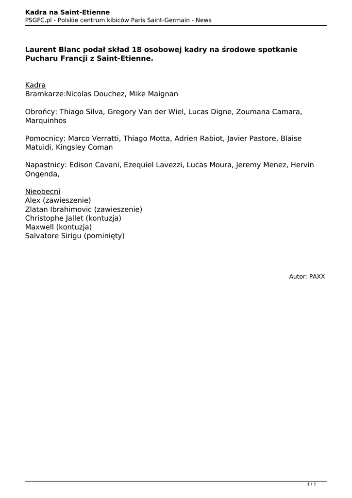 Kadra na Saint-Etienne PSGFC.pl - Polskie centrum kibiców Paris Saint-Germain - News Laurent Blanc podał skład 18 osobowej kadry na środowe spotkanie Pucharu Francji z Saint-Etienne. Kadra Bramkarze:Nicolas Douchez, Mike Maignan Obrońcy: Thiago Silva, Gregory Van der Wiel, Lucas Digne, Zoumana Camara, Marquinhos Pomocnicy: Marco Verratti, Thiago Motta, Adrien Rabiot, Javier Pastore, Blaise Matuidi, Kingsley Coman Napastnicy: Edison Cavani, Ezequiel Lavezzi, Lucas Moura, Jeremy Menez, Hervin Ongenda, Nieobecni Alex (zawieszenie) Zlatan Ibrahimovic (zawieszenie) Christophe Jallet (kontuzja) Maxwell (kontuzja) Salvatore Sirigu (pominięty) Autor: PAXX 1/1 Powered by TCPDF (www.tcpdf.org)