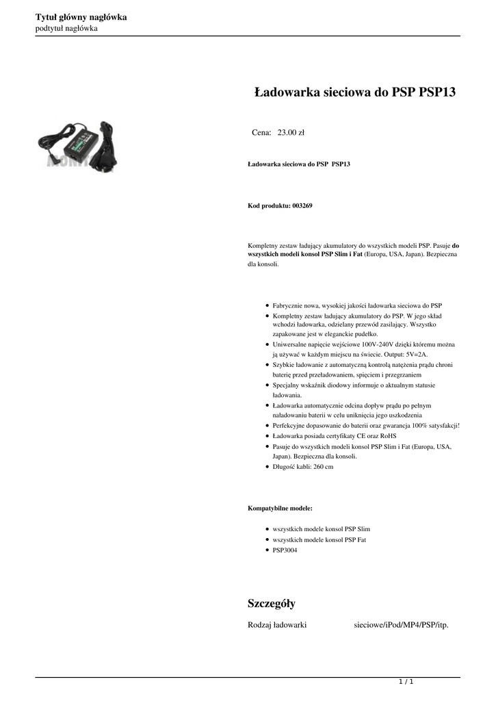 Tytuł główny nagłówka podtytuł nagłówka Ładowarka sieciowa do PSP PSP13 Cena: 23.00 zł Ładowarka sieciowa do PSP PSP13 Kod produktu: 003269 Kompletny zestaw ładujący akumulatory do wszystkich modeli PSP. Pasuje do wszystkich modeli konsol PSP Slim i Fat (Europa, USA, Japan). Bezpieczna dla konsoli. Fabrycznie nowa, wysokiej jakości ładowarka sieciowa do PSP Kompletny zestaw ładujący akumulatory do PSP. W jego skład wchodzi ładowarka, odzielany przewód zasilający. Wszystko zapakowane jest w eleganckie pudełko. Uniwersalne napięcie wejściowe 100V-240V dzięki któremu można ją używać w każdym miejscu na świecie. Output: 5V=2A. Szybkie ładowanie z automatyczną kontrolą natężenia prądu chroni baterię przed przeładowaniem, spięciem i przegrzaniem Specjalny wskaźnik diodowy informuje o aktualnym statusie ładowania. Ładowarka automatycznie odcina dopływ prądu po pełnym naładowaniu baterii w celu uniknięcia jego uszkodzenia Perfekcyjne dopasowanie do baterii oraz gwarancja 100% satysfakcji! Ładowarka posiada certyfikaty CE oraz RoHS Pasuje do wszystkich modeli konsol PSP Slim i Fat (Europa, USA, Japan). Bezpieczna dla konsoli. Długość kabli: 260 cm Kompatybilne modele: wszystkich modele konsol PSP Slim wszystkich modele konsol PSP Fat PSP3004 Szczegóły Rodzaj ładowarki sieciowe/iPod/MP4/PSP/itp. 1/1 Powered by TCPDF (www.tcpdf.org)