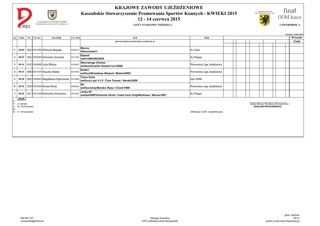KRAJOWE ZAWODY UJEŻDŻENIOWE Kaszubskie Stowarzyszenie Promowania Sportów Konnych - KWIEKI 2015 12 - 14 czerwca 2015 LISTY STARTOWE NIEDZIELA finał OOM kuce CZWOROBOK A Kwieki, 14,06,2015 Lp. Godz No. Lic zaw. Zawodnik Lic. Koń Koń Procent Total Klub płeć/rasa/ojciec/matka\ojciec matki\rok ur 1 08:00 055 O031885 Wiktoria Biegała K005213 Mocna kl\kuc\siwa\\\\ KJ Oxer 2 08:07 032 O030565 Weronika Zmarzła K017782 Epizod wal\\\\\NN\\NN\2004 KJ Pegaz K018457 Stenvaenge Charles wal\kuc\Innellan Kestrel \Liv\\2002 Pomorska Liga Jeździecka Pomorska Liga Jeździecka 3 08:14 010 O026989 Julia Bilicka 4 08:21 008 O031935 Klaudia Hałeła K018190 Buttini wal\kuc\Broadway \Boquet / Bolero\2002 5 08:28 026 O029091 Magdalena Dąbrowska K015066 Timur Evita wal\kuc\c.gn\ V.I.P. \Tara Texass / Nando\2006 bpk WMA 6 08:35 039 O023952 Nicola Roda K006042 Nil wal\kuc\siwy\Baroko \Nysa / Cisoń\1998 Pomorska Liga Jeździecka 7 08:42 031 O031029 Weronika Winiarska K014427 Jacky 85 wal\bul\DRP\Victorias Ornat / Coed Coch Orig\Windrose / Weras\1997 KJ Pegaz 08:49 ______________________________ Sędzia Główny/ President of Ground Jury WACŁAW PRUCHNIEWICZ EH - Z. Górska C - W. Pruchniewicz MB - K. Tomaszewski 692 991 471 [email protected] Dekoracja 11:00 - wszystkie pary Obsługa Zawodów HTE marketing Jacek Ryczywolski godz. wydruku 20:31 wyniki on-line www.htezawody.pl KRAJOWE ZAWODY UJEŻDŻENIOWE Kaszubskie Stowarzyszenie Promowania Sportów Konnych - KWIEKI 2015 12 - 14 czerwca 2015 LISTY STARTOWE NIEDZIELA L-3 CZWOROBOK A Kwieki, 14,06,2015 Lp. Godz No. Lic zaw. Zawodnik Lic. Koń Koń Procent Total Klub płeć/rasa/ojciec/matka\ojciec matki\rok ur 09:05 057 2 09:12 009 O007167 Daria Klatt-Lizakowska 3 09:19 050 Gryf Jarosław Pawłowski 1 Paulina Łukowicz 4 09:26 002 O003642 Marcin Woldański 5 09:33 059 Maciej Puczyński 6 09:40 058 Jarosław Pawłowski KJ Walor K017885 Dyfuzja kl\sp\Rafael\Dafne / Dal\2007 Pomorska Liga Jeździecka K019043 Destino wal\han\kaszt\Desperados \Riola Rosso W / Rotspon\2010 KJ AS Dream K019843 Equipo Fiégo wal\KWPN\Vivaldi\Kerrodelin\2010 SKJ Bajardo Dante szkoleniowo Corleone Grande KJ Walor 09:47 ______________________________ Sędzia Główny/ President of Ground Jury WACŁAW PRUCHNIEWICZ EH - K. Tomaszewski C - Z. Górska MB - A. Jończyk dekoracja rundy 9:50 - wszyscy uczerstnicy 692 991 471 [email protected] Obsługa Zawodów HTE marketing Jacek Ryczywolski godz. wydruku 20:31 wyniki on-line www.htezawody.pl KRAJOWE ZAWODY UJEŻDŻENIOWE Kaszubskie Stowarzyszenie Promowania Sportów Konnych - KWIEKI 2015 12 - 14 czerwca 2015 LISTY STARTOWE NIEDZIELA finał OOM konie CZWOROBOK A Kwieki, 14,06,2015 Lp. Godz No. Lic zaw. Zawodnik Lic. Koń Koń Procent Total Klub płeć/rasa/ojciec/matka\ojciec matki\rok ur 1 10:00 053 O026675 Olga Wiczanowska K013879 Pikador wal\sp\gn\Rytm\Pasja / Vittorio\2009 KJ Pegaz 2 10:06 047 O023653 Kacper Leszczyński K013484 Libra kl\wlkp\kaszt\Grand Amour\Lena / Bas\2006 Kujawsko-Pomorski KJ K015339 Daha kl\sp\gn\Grand Amour\Danina / Adlerschild\2007 KJ Oxer KJ Pegaz 3 10:12 054 O021223 Agata Włodarczyk 4 10:18 034 O030666 Anna Swiontek-Brzezińska Picador wal\old\gn\Cassiano\Pussy Cat\2005 5 10:24 049 O031518 Natalia Sznigier K015610 Unlimited og\sp\sk.gn\Karbon\Uptown Girl / Numero Uno\2007 KJ AS Dream 6 10:30 025 O033657 Zofia Miąskowska K013264 Wind For Kay wal\fryz\kara\Kay Vann Broamberg\Loretta / Sander\2007 Pomorska Liga Jeździecka 10:36 ______________________________ Sędzia Główny/ President of Ground Jury WACŁAW PRUCHNIEWICZ EH - A. Jończyk C - K. Tomaszewski MB - J. Łukomski Dekoracja 11:00 - wszystkie pary 692 991 471 [email protected] Obsługa Zawodów HTE marketing Jacek Ryczywolski godz. wydruku 20:31 wyniki on-line www.htezawody.pl KRAJOWE ZAWODY UJEŻDŻENIOWE Kaszubskie Stowarzyszenie Promowania Sportów Konnych - KWIEKI 2015 12 - 14 czerwca 2015 LISTY STARTOWE NIEDZIELA CS-5 CZWOROBOK A Kwieki, 14,06,2015 Lp. Godz No. Lic zaw. Zawodnik Lic. Koń Koń Procent Total Klub płeć/rasa/ojciec/matka\ojciec matki\rok ur 1 10:40 036 O002228 Alicja Czapska K010979 Pablo wal\KWPN\kara\Ferro \Hiana / Legaat\1997 KSJ Zagozd 10:48 ______________________________ Sędzia Główny/ President of Ground Jury WACŁAW PRUCHNIEWICZ EH - A. Jończyk C - K. Tomaszewski MB - J. Łukomski Dekoracja 11:00 - wszystkie pary 692 991 471 [email protected] Obsługa Zawodów HTE marketing Jacek Ryczywolski godz. wydruku 20:31 wyniki on-line www.htezawody.pl KRAJOWE ZAWODY UJEŻDŻENIOWE Kaszubskie Stowarzyszenie Promowania Sportów Konnych - KWIEKI 2015 12 - 14 czerwca 2015 LISTY STARTOWE NIEDZIELA CC-7 CZWOROBOK A Kwieki, 14,06,2015 Lp. Godz No. Lic zaw. Zawodnik Lic. Koń Koń Procent Total Klub płeć/rasa/ojciec/matka\ojciec matki\rok ur 1 10:50 017 O010003 Paula Mańczak K010611 Filano H wal\hol\Fleming \Entziana / Calypso I\2002 CSJ Biały Bór 2 11:50 042 O001334 Marzena Makowska K006559 Empire og\kara\han\Embassy \Wilmaah / Werthe\2002 KJ Welt Opypy 3 11:58 018 O010003 Paula Mańczak K011303 Williams Junior og\han\White Star\Laura / Lanthan\2002 CSJ Biały Bór 12:06 ______________________________ Sędzia Główny/ President of Ground Jury WACŁAW PRUCHNIEWICZ EH - J. Łukomski C - A. Jończyk MB - W. Pruchniewicz Dekoracja 12:10 - najlepsza 3 692 991 471 [email protected] Obsługa Zawodów HTE marketing Jacek Ryczywolski godz. wydruku 20:31 wyniki on-line www.htezawody.pl KRAJOWE ZAWODY UJEŻDŻENIOWE Kaszubskie Stowarzyszenie Promowania Sportów Konnych - KWIEKI 2015 12 - 14 czerwca 2015 LISTY STARTOWE NIEDZIELA P-4 CZWOROBOK A Kwieki, 14,06,2015 Lp. Godz No. Lic zaw. Zawodnik Lic. Koń Koń Procent Total Klub płeć/rasa/ojciec/matka\ojciec matki\rok ur Paulina Łukowicz 1 12:20 050 2 12:28 030 O023961 Klaudia Jeschke 3 12:36 009 O007167 Daria Klatt-Lizakowska K019043 Destino wal\han\kaszt\Desperados \Riola Rosso W / Rotspon\2010 KJ AS Dream K013193 Bystra Bafi kl\sp\kaszt\Maram\Bafuria / Bas\2003 JKS Rywal K017885 Dyfuzja kl