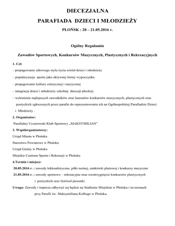 DIECEZJALNA PARAFIADA DZIECI I MŁODZIEŻY PŁOŃSK : 20 – 21.05.2016 r. Ogólny Regulamin Zawodów Sportowych, Konkursów Muzycznych, Plastycznych i Rekreacyjnych 1. Cel: – propagowanie zdrowego stylu życia wśród dzieci i młodzieży – popularyzacja sportu jako aktywnej formy wypoczynku – propagowanie kultury estetycznej i muzycznej – integracja dzieci i młodzieży szkolnej diecezji płockiej – wyłonienie najlepszych zawodników oraz laureatów konkursów muzycznych, plastycznych oraz poetyckich zgłoszonych przez parafie do reprezentowania ich na Ogólnopolskiej Parafiadzie Dzieci i Młodzieży . 2. Organizator: Parafialny Uczniowski Klub Sportowy „MAKSYMILIAN” 3. Współorganizatorzy: Urząd Miasta w Płońsku Starostwo Powiatowe w Płońsku Urząd Gminy w Płońsku Miejskie Centrum Sportu i Rekreacji w Płońsku 4.Termin i miejsce: 20.05.2016 r. : zawody lekkoatletyczne, piłki nożnej, siatkówki plażowej i konkursy muzyczne 21.05.2016 r. : zawody sportowo – rekreacyjne oraz rozstrzygnięcie konkursów plastycznych i poetyckich oraz festiwal piosenki. Uwaga: Zawody i impreza odbywać się będzie na Stadionie Miejskim w Płońsku i na terenach przy Parafii św. Maksymiliana Kolbego w Płońsku. 5. Zgłoszenia i uczestnictwo: Zgłoszenia należy składać w kancelarii Parafii św. Maksymiliana w Płońsku lub korespondencyjnie na adres: Parafialny Uczniowski Klub Sportowy ” Maksymilian”, ul. ks. R. Jaworskiego 1, 09-100 Płońsk lub na adres poczty elektronicznej: [email protected] w terminie do 17.05. 2016 r. 6. Zasady rozgrywania zawodów sportowych: Zawody przeprowadzone zostaną w następujących dyscyplinach sportowych w kategorii dziewcząt i chłopców: – lekkoatletyka ( szkoły podstawowe, gimnazja, szkoły ponadgimnazjalne ) – piłka nożna (szkoły podstawowe, gimnazja, szkoły ponadgimnazjalne) – siatkówka plażowa (szkoły podstawowe, gimnazja, szkoły ponadgimnazjalne). 7. Nagrody: Organizator przewiduje medale, również upominki i nagrody rzeczowe. 8. Sędziowie: Zawody sędziują sędziowie powołani przez organizatora. 9 . Sprawy socjalne: Istnieje możliwość nieodpłatnego zakwaterowania ekipy. Chęć noclegu należy podać w zgłoszeniu. Organizator przewidział gorący posiłek. 10. Sprawy organizacyjne: Przebieg zawodów 20.05.2016 r. : 8.30 – Rozpoczęcie pracy biura zawodów 9.00 – Msza św. w kościele św. M.M. Kolbe w Płońsku 10.30 – uroczyste otwarcie Diecezjalnej Parafiady Dzieci i Młodzieży 11.00 – rozpoczęcie zawodów lekkoatletycznych 11.00 – rozpoczęcie konkursu muzycznego 12. 00 – rozpoczęcie turnieju piłkarskiego 15.00 – podsumowanie pierwszego dnia Diecezjalnej Parafiady Dzieci i Młodzieży oraz wręczenie medali i nagród. Przebieg zawodów 21.05.2016 r. : 14.30 – Rozpoczęcie pracy biura zawodów na terenie Parafii św. Maksymiliana 15.00 – uroczyste otwarcie drugiego dnia Diecezjalnej Parafiady Dzieci i Młodzieży 15. 30 – rozpoczęcie zawodów sportowo – rekreacyjnych oraz festiwalu piosenki 17.00 – rozstrzygnięcie konkursu plastycznego i poetyckiego 18.00 – zakończenie Diecezjalnej Parafiady Dzieci i Młodzieży.