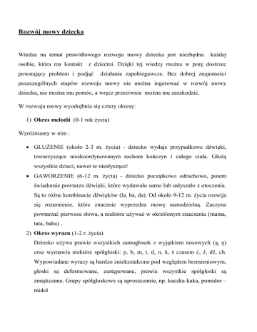 Rozwój mowy dziecka Wiedza na temat prawidłowego rozwoju mowy dziecka jest niezbędna każdej osobie, która ma kontakt z dziećmi. Dzięki tej wiedzy można w porę dostrzec powstający problem i podjąć działania zapobiegawcze. Bez dobrej znajomości poszczególnych etapów rozwoju mowy nie można ingerować w rozwój mowy dziecka, nie można mu pomóc, a wręcz przeciwnie można mu zaszkodzić. W rozwoju mowy wyodrębnia się cztery okresy: 1) Okres melodii (0-1 rok życia) Wyróżniamy w nim : GŁUŻENIE (około 2-3 m. życia) - dziecko wydaje przypadkowe dźwięki, towarzyszące nieskoordynowanym ruchom kończyn i całego ciała. Głużą wszystkie dzieci, nawet te niesłyszące! GAWORZENIE (6-12 m. życia) - dziecko początkowo odruchowo, potem świadomie powtarza dźwięki, które wydawało samo lub usłyszało z otoczenia. Są to różne kombinacie dźwięków (la, ba, da). Od około 9-12 m. życia rozwija się rozumienie, które znacznie wyprzedza mowę samodzielną. Zaczyna powtarzać pierwsze słowa, a niektóre używać w określonym znaczeniu (mama, tata, baba) . 2) Okres wyrazu (1-2 r. życia) Dziecko używa prawie wszystkich samogłosek z wyjątkiem nosowych (ą, ę) oraz wymawia niektóre spółgłoski: p, b, m, t, d, n, k, ś czasem ć, ź, dź, ch. Wypowiadane wyrazy są bardzo zniekształcone pod względem brzmieniowym, głoski są deformowane, zastępowane, prawie wszystkie spółgłoski są zmiękczane. Grupy spółgłoskowe są uproszczanie, np. kaczka-kaka, pomidor – midol 3) Okres zdania (2-3 r. życia) Mowa ulega dalszemu doskonaleniu. Dziecko powinno już wypowiadać spółgłoski: p, b, m, pi, bi, mi, f, w, fi, wi, ś, ź, ć, dź, ń, ki, gi, k, g, ch, t, d, n, l, li , ł, j. Pod koniec tego okresu mogą się już pojawić głoski: s, z, c, dz, a nawet sz, rz, cz, dż. Charakterystyczne w tym okresie jest: zmiękczanie głosek syczących i szumiących, np. szkoła - śkoła, masło maśło zastępowanie głoski „r” głoska „l” , „j” lub „ł” brak wyraźnych końcówek upraszczanie grup spółgłoskowych błędy gramatyczne pierwsze zdania są zazwyczaj dwuwyrazowe. 4) Okres swoistej mowy dziecięcej (3-7 r. życia) 4 lata- wymawia głoski s, z, c, dz, odróżnia je od ich miękkich odpowiedników. Pod koniec czwartego roku życia nie powinno już wymawiać głosek syczących jako głoski ciszące, powinna się pojawić głoska „r”, choć często pojawia się dopiero pod koniec 5 roku życia. Miedzy 4-5 rokiem życia pojawiają się głoski szumiące sz, rz, cz, dż. Dziecko potrafi je poprawnie powtórzyć, choć w mowie potocznej mogą jeszcze być wymawiane jako s, z, c, dz. Pomiędzy 5-6 rokiem życia dziecko wymawia już głoski sz, rz, cz, dż, r. wymowa tych głosek utrwala się w 6 roku życia. W wieku 7 lat dziecko powinno w zasadzie wymawiać wszystkie głoski prawidłowo, powinna już być utrwalona poprawna wymowa wszystkich głosek. W mowie dziecka wzrasta liczba przymiotników, przysłówków, zaimków i liczebników.
