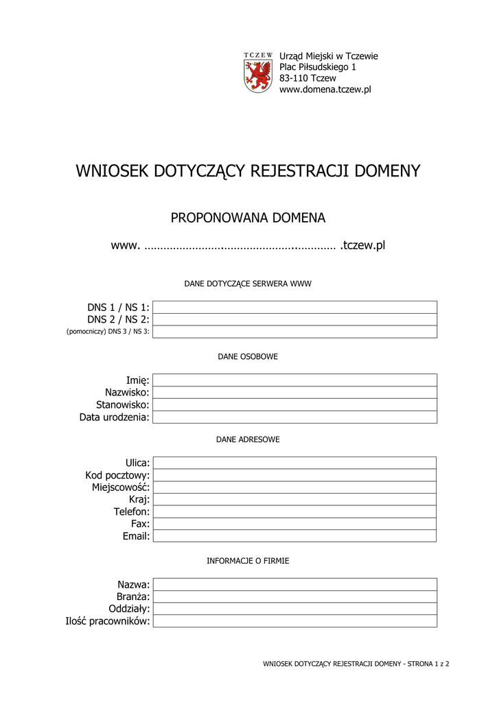 Urząd Miejski w Tczewie Plac Piłsudskiego 1 83-110 Tczew www.domena.tczew.pl WNIOSEK DOTYCZĄCY REJESTRACJI DOMENY PROPONOWANA DOMENA www. …………………….…………………..………… .tczew.pl DANE DOTYCZĄCE SERWERA WWW DNS 1 / NS 1: DNS 2 / NS 2: (pomocniczy) DNS 3 / NS 3: DANE OSOBOWE Imię: Nazwisko: Stanowisko: Data urodzenia: DANE ADRESOWE Ulica: Kod pocztowy: Miejscowość: Kraj: Telefon: Fax: Email: INFORMACJE O FIRMIE Nazwa: Branża: Oddziały: Ilość pracowników: WNIOSEK DOTYCZĄCY REJESTRACJI DOMENY - STRONA 1 z 2 ADRES DO KORESPONDENCJI (JEŚLI INNY NIŻ DANE ADRESOWE) Ulica: Kod pocztowy: Miejscowość: Kraj: Telefon: Fax: Email: lub Skrytka pocztowa: Kod pocztowy: Miejscowość: Uzasadnienie : ………………………………… r. ……………………………………………………….. data podpis składającego wniosek (pieczątka firmy) WNIOSEK DOTYCZĄCY REJESTRACJI DOMENY - STRONA 2 z 2
