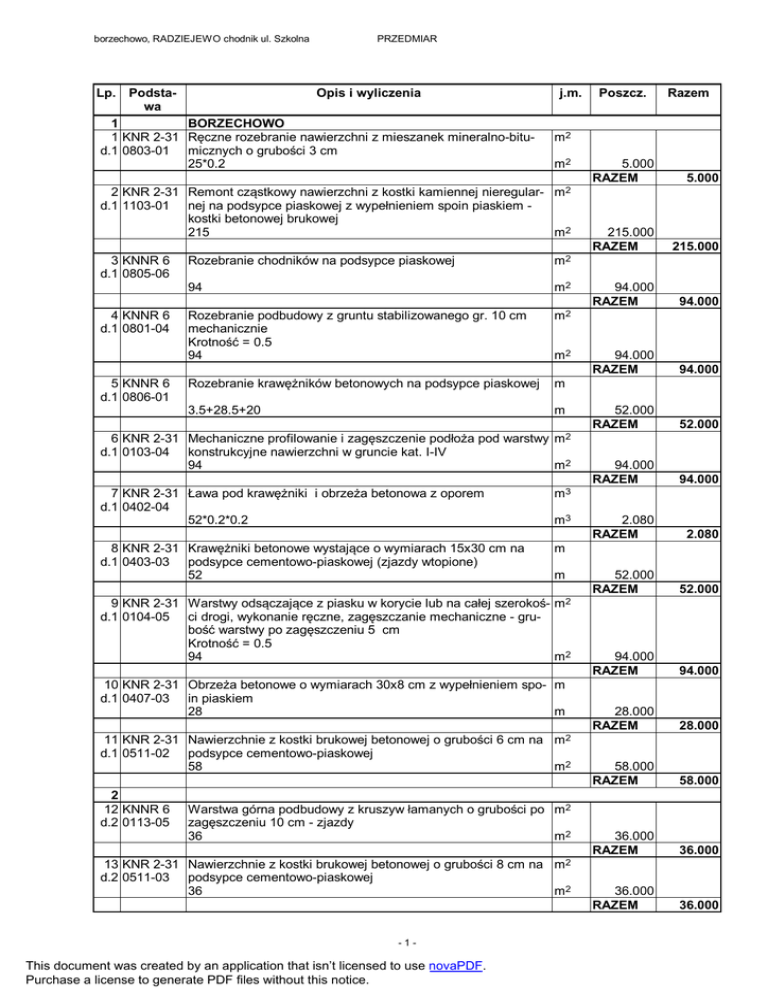borzechowo, RADZIEJEWO chodnik ul. Szkolna PRZEDMIAR Lp. PodstaOpis i wyliczenia wa 1 BORZECHOWO 1 KNR 2-31 Ręczne rozebranie nawierzchni z mieszanek mineralno-bitud.1 0803-01 micznych o grubości 3 cm 25*0.2 j.m. 4 KNNR 6 d.1 0801-04 5 KNNR 6 d.1 0806-01 m2 Rozebranie chodników na podsypce piaskowej m2 94 m2 Rozebranie podbudowy z gruntu stabilizowanego gr. 10 cm mechanicznie Krotność = 0.5 94 m2 Rozebranie krawężników betonowych na podsypce piaskowej m 3.5+28.5+20 m m2 6 KNR 2-31 Mechaniczne profilowanie i zagęszczenie podłoża pod warstwy m2 d.1 0103-04 konstrukcyjne nawierzchni w gruncie kat. I-IV 94 m2 7 KNR 2-31 Ława pod krawężniki i obrzeża betonowa z oporem d.1 0402-04 52*0.2*0.2 m3 8 KNR 2-31 Krawężniki betonowe wystające o wymiarach 15x30 cm na d.1 0403-03 podsypce cementowo-piaskowej (zjazdy wtopione) 52 m m3 m 9 KNR 2-31 Warstwy odsączające z piasku w korycie lub na całej szerokoś- m2 d.1 0104-05 ci drogi, wykonanie ręczne, zagęszczanie mechaniczne - grubość warstwy po zagęszczeniu 5 cm Krotność = 0.5 94 m2 10 KNR 2-31 Obrzeża betonowe o wymiarach 30x8 cm z wypełnieniem spo- m d.1 0407-03 in piaskiem 28 m 11 KNR 2-31 Nawierzchnie z kostki brukowej betonowej o grubości 6 cm na m2 d.1 0511-02 podsypce cementowo-piaskowej 58 m2 2 12 KNNR 6 d.2 0113-05 Warstwa górna podbudowy z kruszyw łamanych o grubości po m2 zagęszczeniu 10 cm - zjazdy 36 m2 13 KNR 2-31 Nawierzchnie z kostki brukowej betonowej o grubości 8 cm na m2 d.2 0511-03 podsypce cementowo-piaskowej 36 m2 -1- This document was created by an application that isn’t licensed to use novaPDF. PRO Wersja 4.50 Nr seryjny: 26080 Purchase a Norma license to generate PDF files without this notice. Razem m2 2 KNR 2-31 Remont cząstkowy nawierzchni z kostki kamiennej nieregular- m2 d.1 1103-01 nej na podsypce piaskowej z wypełnieniem spoin piaskiem kostki betonowej brukowej 215 m2 3 KNNR 6 d.1 0805-06 Poszcz. 5.000 RAZEM 5.000 215.000 RAZEM 215.000 94.000 RAZEM 94.000 94.000 RAZEM 94.000 52.000 RAZEM 52.000 94.000 RAZEM 94.000 2.080 RAZEM 2.080 52.000 RAZEM 52.000 94.000 RAZEM 94.000 28.000 RAZEM 28.000 58.000 RAZEM 58.000 36.000 RAZEM 36.000 36.000 RAZEM 36.000 borzechowo, RADZIEJEWO chodnik ul. Szkolna PRZEDMIAR Lp. PodstaOpis i wyliczenia j.m. wa 14 KNR 2-31 Powierzchniowe utrwalanie nawierzchni drogowych asfaltem m2 d.2 1001-01 lub smołą stabilizowaną grysem kamiennym frakcji 5-8 w ilości 8.0 dm3/m2 25*0.2 m2 3 15 KNNR 6 d.3 0805-06 RADZIEJEWO Rozebranie chodników z płyt betonowych o wymiarach 50x50x7 cm na podsypce piaskowej 148*1.5+10*5 m2 m3 m 21 KNR 2-31 Podsypka cementowo-piaskowa z zagęszczeniem ręcznym - 3 m2 d.3 0105-05 cm grubości warstwy po zagęszczeniu 222 m2 22 KNR 2-31 Nawierzchnie z kostki brukowej betonowej o grubości 6 cm na m2 d.3 0511-02 podsypce cementowo-piaskowej - szara bezfazowa. 222-27 m2 23 KNR 2-31 Nawierzchnie z kostki brukowej betonowej o grubości 8 cm na m2 d.3 0511-03 podsypce cementowo-piaskowej czarna bezfazowa 27 m2 24 KNR 2-31 Podbudowa z kruszywa łamanego - warstwa dolna o grubości d.3 0114-05 po zagęszczeniu 10 cm Krotność = 0.66 27 m2 25 KNR 2-31 Remont cząstkowy nawierzchni z płyt drogowych betonowych d.3 1105-01 sześciokątnych lub kwadratowych o grubości 15 cm z wypełnieniem spoin piaskiem 15*10 m2 m2 m2 4 Zatoczka autobusowa 26 KNR-W 4- Mechaniczna rozbiórka elementów konstrukcji betonowych nie- m3 d.4 01 0212- zbrojonych o grubości do 15 cm 02 1.5*3.5*0.1 m3 This document was created by an application that isn’t licensed to use novaPDF. PRO Wersja 4.50 Nr seryjny: 26080 Purchase a Norma license to generate PDF files without this notice. 5.000 272.000 RAZEM 272.000 272.000 RAZEM 272.000 11.840 RAZEM 11.840 18.000 RAZEM 18.000 148.000 RAZEM 148.000 95.000 RAZEM 95.000 222.000 RAZEM 222.000 195.000 RAZEM 195.000 27.000 RAZEM 27.000 27.000 RAZEM 27.000 150.000 RAZEM 150.000 0.525 RAZEM 0.525 m 20 KNR 2-31 Obrzeża betonowe o wymiarach 30x8 cm na podsypce piasko- m d.3 0407-03 wej z wypełnieniem spoin piaskiem 95 m -2- 5.000 RAZEM m3 18 KNR 2-31 Krawężniki betonowe wtopione o wymiarach 12x25 cm na pod- m d.3 0403-05 sypce cementowo-piaskowej 4*4.5 m 19 KNR 2-31 Krawężniki betonowe wystające o wymiarach 15x30 cm na d.3 0403-01 podsypce piaskowej 148 Razem m2 16 KNR 2-31 Mechaniczne profilowanie i zagęszczenie podłoża pod warstwy m2 d.3 0103-04 konstrukcyjne nawierzchni w gruncie kat. I-IV 272 m2 17 KNR 2-31 Ława pod krawężniki i obrzeża betonowa z oporem d.3 0402-04 (148+148)*0.2*0.2 Poszcz. borzechowo, RADZIEJEWO chodnik ul. Szkolna PRZEDMIAR Lp. PodstaOpis i wyliczenia j.m. wa 27 KNNR 6 Chodniki z płyt betonowych o wymiarach 40x40x4 cm na pod- m2 d.4 0503-01 sypce piaskowej, spoiny wypełnione piaskiem- płytki chodnikowe o szlachetnej powierzchni z płukanego kruszywa np. Leier 1.5*3.5 m2 28 KNR 2-31 Podsypka piaskowa z zagęszczeniem mechanicznym - 3 cm d.4 0105-03 grubości warstwy po zagęszczeniu 5.25 This document was created by an application that isn’t licensed to use novaPDF. PRO Wersja 4.50 Nr seryjny: 26080 Purchase a Norma license to generate PDF files without this notice. Razem 5.250 RAZEM 5.250 5.250 RAZEM 5.250 5.250 RAZEM 5.250 m2 m2 29 KNR 2-31 Podsypka piaskowa z zagęszczeniem mechanicznym - za każ- m2 d.4 0105-04 dy dalszy 1 cm grubości warstwy po zagęszczeniu Krotność = 2 5.25 m2 -3- Poszcz.