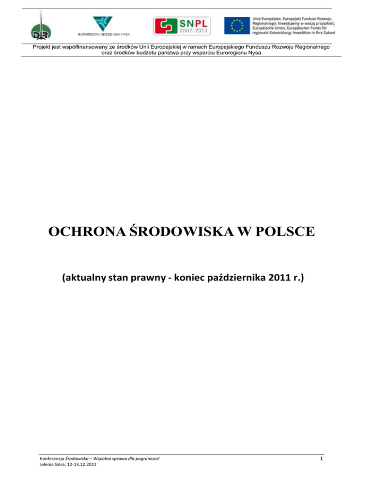 Projekt jest współfinansowany ze środków Unii Europejskiej w ramach Europejskiego Funduszu Rozwoju Regionalnego oraz środków budżetu państwa przy wsparciu Euroregionu Nysa OCHRONA ŚRODOWISKA W POLSCE (aktualny stan prawny - koniec października 2011 r.) Konferencja Środowisko – Wspólna sprawa dla pogranicza! Jelenia Góra, 12-13.12.2011 1 Aktualny stan prawny - Ochrona środowiska w Polsce Konstytucja Rzeczypospolitej Polskiej z dnia 2 kwietnia 1997 r. (Dz. U. Nr 78, poz. 483 z późn. zm.) w swoich zapisach określa między innymi podstawowe funkcje państwa, obowiązki władz publicznych, obowiązki obywateli w zakresie ochrony środowiska (art. 5, 74, 86,). Szczegółowe regulacje w powyższym zakresie określają ustawy i akty wykonawcze do nich, które uwzględniają wymagania wynikające z dyrektyw Unii Europejskiej i konwencji międzynarodowych. Podstawową ustawą jest ustawa z dnia 27 kwietnia 2001 r. – Prawo ochrony środowiska (Dz. U. z 2008 r. Nr 25, poz. 150, z późn. zm.). Z uwagi na szeroki zakres zagadnieo szereg uregulowao znalazło się także w innych ustawach: Ustawa z dnia 27 lipca 2001 r. o wprowadzeniu ustawy-Prawo ochrony środowiska, ustawy o odpadach oraz o zmianie niektórych ustaw Ustawa z dnia 3 października 2008 r. o udostępnianiu informacji o środowisku i jego ochronie, udziale społeczeostwa oraz o ocenach oddziaływania na środowisko Ustawa z dnia 13 kwietnia 2007 r. o zapobieganiu szkodom w środowisku i ich naprawie Ustawa z dnia 16 kwietnia 2004 r. o ochronie przyrody Ustawa z dnia 28 września 1991 r. o lasach Ustawa z dnia 3 lutego 1995 r. o ochronie gruntów rolnych i leśnych Ustawa z dnia 17 lipca 2009 r. o systemie zarządzania emisjami gazów cieplarnianych i innych substancji Ustawa z dnia 18 grudnia 2003 r. o ochronie zwierząt Ustawa z dnia 22 czerwca 2001 r. o organizmach genetycznie zmodyfikowanych Ustawa z dnia 6 lipca 2001 r. o zachowaniu narodowego charakteru strategicznych zasobów naturalnych kraju Ustawa z dnia 4 lutego 1994 r. Prawo geologiczne i górnicze Ustawa z dnia 29 listopada 2000 r. Prawo atomowe Ustawa z dnia 27 kwietnia 2001 r. o odpadach Ustawa z dnia 11 maja 2001 r. o opakowaniach i odpadach opakowaniowych Ustawa z dnia 11 maja 2001 r. o obowiązkach przedsiębiorców w zakresie gospodarowania niektórymi odpadami oraz o opłacie produktowej i opłacie depozytowej Ustawa z dnia 29 czerwca 2007 r. o zużytym sprzęcie elektrycznym i elektronicznym Ustawa z dnia 24 kwietnia 2009 r. o bateriach i akumulatorach Ustawa z dnia 20 stycznia 2005 r. o recyklingu pojazdów wycofanych z eksploatacji Ustawa z dnia 10 lipca 2008 r. o odpadach wydobywczych Ustawa z dnia 22 grudnia 2004 r. o handlu uprawnieniami do emisji do powietrza gazów cieplarnianych i innych substancji Ustawa z dnia 18 września 2001 r. Kodeks Morski Ustawa z dnia 18 lipca 2001 r. Prawo wodne Ustawa z dnia 24 czerwca 2010 r. o szczególnych rozwiązaniach z usuwaniem skutków powodzi z maja i czerwca 2010 r. Ustawa z dnia 13 października 1995 r. Prawo łowieckie Ustawa z dnia 19 lutego 2004 r. o rybołówstwie Ustawa z dnia 25 czerwca 2009 r. o rolnictwie ekologicznym Ustawa z dnia 25 sierpnia 2006 r. o bezpieczeostwie żywności i żywienia Ustawa z dnia 18 kwietnia 1985 r. o rybactwie śródlądowym Ustawa z dnia 21 grudnia 2000 r. o żegludze śródlądowej Ustawa z dnia 16 marca 1995 r. o zapobieganiu zanieczyszczaniu morza przez statki Ustawa z dnia 7 czerwca 2001 r. o leśnym materiale rozmnożeniowym Ustawa z dnia 10 lipca 2007 r. o nawozach i nawożeniu Ustawa z dnia 19 czerwca 1997 r. o zakazie stosowania wyrobów zawierających azbest Konferencja Środowisko – Wspólna sprawa dla pogranicza! Jelenia Góra, 12-13.12.2011 2 Aktualny stan prawny - Ochrona środowiska w Polsce Ustawa z dnia 11 stycznia 2001 r. o substancjach i preparatach chemicznych Ustawa z dnia 25 sierpnia 2006 r. o biokomponentach i biopaliwach ciekłych Ustawa z dnia 20 kwietnia 2004 r. o substancjach zubożających warstwę ozonową Ustawa z dnia 20 lipca 1991 r. o Inspekcji Ochrony Środowiska Ustawa z dnia 13 września 1996 r. o utrzymaniu czystości i porządku w gminach Ustawa z dnia 1 lipca 2011 r. o zmianie ustawy o utrzymaniu czystości i porządku w gminach oraz niektórych innych ustaw Ustawa z dnia 15 lipca 2011 r. o krajowym systemie ekozarządzania i audytu (EMAS) Ustawa z dnia 27 marca 2003 r. o planowaniu i zagospodarowaniu przestrzennym Ustawa z dnia 7 lipca 1994 r. Prawo budowlane art. 92 ustawy z dnia 6 września 2001 r. o transporcie drogowym Konferencja Środowisko – Wspólna sprawa dla pogranicza! Jelenia Góra, 12-13.12.2011 3 Aktualny stan prawny - Ochrona środowiska w Polsce Ustawa z dnia 27 kwietnia 2001 r. – Prawo ochrony środowiska 1. Określa zasady ochrony środowiska oraz warunki korzystania z jego zasobów, z uwzględnieniem wymagań o zrównoważonego rozwoju, a w szczególności: 1. zasady ustalania: a) warunków ochrony zasobów środowiska, b) warunków wprowadzania substancji lub energii do środowiska (pozwolenia), c) kosztów korzystania ze środowiska; 2. obowiązki organów administracji; 3. odpowiedzialnośd i sankcje. Ochrona zasobów środowiska jest realizowana w szczególności poprzez (art. 82): 1. określenie standardów jakości środowiska oraz kontrolę ich osiągania, a także podejmowanie działań o służących ich nieprzekraczaniu lub przywracaniu; 2. ograniczanie emisji, polegające na zapobieganiu lub ograniczaniu wprowadzania do środowiska substancji lub energii. Warunki korzystania ze środowiska (art. 180 i 181) - została przyjęta zasada, że eksploatacja instalacji powodująca: 1. wprowadzanie gazów lub pyłów do powietrza, 2. wprowadzanie ścieków do wód lub do ziemi, 3. wytwarzanie odpadów jest dozwolona po uzyskaniu pozwolenia, jeżeli jest ono wymagane. Organ ochrony środowiska może udzielić pozwolenia (na wniosek prowadzącego instalację): 1. zintegrowanego, 2. na wprowadzanie gaz
