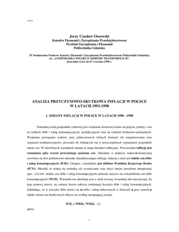 A.99.3 Jerzy Czesław Ossowski Katedra Ekonomii i Zarz dzania Przedsi biorstwem Wydział Zarz dzania i Ekonomii Politechnika Gda ska IV Seminarium Naukowe Katedry Ekonomii i Zarz dzania Przedsi biorstwem Politechniki Gda skiej nt.: „GOSPODARKA POLSKI W OKRESIE TRANSFORMACJI”, Jastrz bia Góra 26-27 wrzesie 1999 r. ANALIZA PRZYCZYNOWO-SKUTKOWA INFLACJI W POLSCE W LATACH 1993-1998 1. ZMIANY INFLACJI W POLSCE W LATACH 1990 - 1998 Naturaln cech gospodarki rynkowej jest wzajemne dostosowywanie si popytu, poda y i cen na rynkach dóbr i usług konsumpcyjnych, produkcyjnych oraz na rynkach kredytowo-pieni nych. Wzajemne powi zanie rynków, przy jednoczesnych ró nych formach ich zorganizowania oraz stopniach konkurencyjno ci, prowadzi do ró ni cych si w poszczególnych segmentach gospodarki zmian cen. W okre lonych warunkach zmiany te maj charakter inflacyjny. Powszechnie inflacja jest rozumiana jako wzrost przeci tnego poziomu cen. Aktualnie w praktyce makroekonomicznej wyró nia si dwa podstawowe mierniki charakteryzuj ce inflacj . Jednym z nich jest indeks cen dóbr i usług konsumpcyjnych (ICKt). Drugim z mierników jest deflator Produktu Krajowego Brutto (ICYt). Mierniki te ró ni si technik ich wyznaczania oraz nieco innym sposobem interpretacji (por.: [1]s.44). Indeks cen dóbr i usług konsumpcyjnych niekiedy nazywa si wska nikiem cen dóbr konsumpcyjnych (WCD). Wska nik ten okre lany jest w skali rocznej, kwartalnej lub miesi cznej. Za jego pomoc mierzy si zmiany kosztu nabycia ustalonego koszyka dóbr i usług konsumpcyjnych. Zakładaj c, e w koszyku dóbr mie ci si m dóbr i usług nabywanych w ilo ciach q przy cenach p indeks zmian cen detalicznych oblicza si według nast puj cej zasady: ICKt = WKDt / WKD0 (1) gdzie: 1 t = 1,2,3,... – numer okresu (roku, kwartału, miesi ca) WKDt = Σptiq0i – warto ustalonego koszyka dóbr i usług mierzonego w cenach pti z okresu badanego t, WKD0 = Σp0iq0i – warto ustalonego koszyka dóbr i usług mierzonego w cenach p0i z okresu bazowego, i = 1,2,3,...,m – numer dobra Zakładamy, i okresem bazowym mo e by dowolny okres t. Je li ICKt > 1 powiemy, e koszty utrzymania w okresie t w relacji do okresu bazowego wzrosły. W przypadku, gdy ICKt <1 mo emy mówi , i koszty utrzymania w okresie t w relacji do okresu bazowego zmalały. Deflator produktu krajowego brutto definiowany jest jako stosunek nominalnego produktu krajowego brutto do jego realnej warto ci. Je li PKB obejmuje n składników (dóbr i usług finalnych) wytworzonych w roku t w ilo ciach yti a których ceny jednostkowe wynosz pti, wówczas nominalny produkt krajowy (NYt) zdefiniujemy nast puj co: NYt = Σptiyti Z kolei warto (2) realn PKB (Yt) wyznaczamy poprzez wprowadzenie do równania (2) cen poszczególnych składników odnosz cych si do okresu bazowego. W tej sytuacji warto realna jest równa: Yt = Σp0i yti (3) W rezultacie deflator PKB okre limy nast puj co: ICYt = NYt/Yt (4) W praktyce, celem wyznaczenia deflatora przyjmuje si , i okresem bazowym jest okres poprzedni. W tych warunkach produkcj z danego okresu (t) wyra a si w cenach z okresu poprzedniego (t-1). Tym samym produkcj w cenach ubiegłego okresu uznaje si za warto realn . W rezultacie otrzymuje si zbiór indeksów ła cuchowych przypisanych poszczególnym latom. Na ich podstawie okre li mo na indeks jednopodstawowy opisuj cy przeci tne zmiany cen cz ci składowych PKB w relacji do wyró nionego okresu. W wyniku porównania obu wyró nionych indeksów charakteryzuj cych inflacj w skali makroekonomicznej stwierdzamy, i : • ICKt jest indeksem typu Laspeyres’a, natomiast deflator PKB jest indeksem typu Paasche’go, • ICKt ujmuje sob zmiany cen dóbr i usług konsumpcyjnych krajowych i importowanych, natomiast deflator PKB obejmuje dobra i usługi finalne (w tym dobra inwestycyjne) wyprodukowanych jedynie w kraju, • ICKt okre la zmiany w poziomie kosztów utrzymania, natomiast deflator PKB jest syntetyczn miar zmian w poziomie kosztów wytwarzania i utrzymania w skali całej gospodarki kraju. 2 Z powy szego wynika, i pomiar inflacji nie jest jednoznaczny. Z uwagi jednak na fakt, i ostatecznym celem działalno ci gospodarczej jest zaspakajanie potrzeb konsumpcyjnych, powszechnie inflacj ocenia si w oparciu o indeks cen dóbr i usług konsumpcyjnych. W przypadku, gdy wska niki cen maj posta indeksów jednopodstawowych, na ich podstawie okre li mo emy roczne (w okre lonych przypadkach kwartalne lub miesi czne) stopy zmian cen. Je li dla wi kszej wygody indeks cen dóbr i usług konsumpcyjnych lub deflator PKB okre limy za pomoc symbolu Pt, wówczas stop wzrostu cen zdefiniujemy nast puj co: SWCt = [(Pt – Pt-1)/Pt-1] 100% = [(Pt/Pt-1) –1] 100% (5) Na podstawie (5) powiemy jaki jest procentowy roczny, kwartalny lub miesi czny wzrost poziomu cen. W tabeli 1 przedstawiono indeksy cen dóbr i usług konsumpcyjnych, deflator PKB oraz obliczone na ich podstawie roczne stopy wzrostu cen. Tabela 1 Podstawowe wska niki roczne charakteryzujace inflacj w Polsce w latach 1990 - 1998 Deflator PKB LATA (1990=1,00) ICYt Indeks cen dóbr Indeks cen dóbr konsumpcyjnych konsumpcyjnych Roczna stopa Roczna stopa wzrostu wzrostu cen dóbr deflatora PKB konsumpcyjnych (1990=1,00) (1998=1,00) w% w% ICKt ICKt SWCYt SWCKt 1990r. 1,0000 1,0000 0,11662 ------- ------- 1991r. 1,5523 1,7030 0,19861 55,23% 70,30% 1992r. 2,1505 2,4350 0,28398 38,54% 42,98% 1993r. 2,8085 3,2950 0,38427 30,60% 35,32% 1994r. 3,8352 4,3560 0,50801 36,55% 32,20% 1995r. 4,9078 5,5670 0,64924 27,97% 27,80% 1996r. 5,8253 6,6750 0,77846 18,69% 19,90% 1997r. 6,6436 7,6696 0,89446 14,05% 14,90% 1998r. 7,4311 8,5746 1,00000 11,85% 11,80% ródło: Obliczenia własne na podstawie danych GUS Wykorzystuj c dane zawarte w tabeli 1 powiemy, e na skutek zmian cen elementów składowych produktu krajowego brutto jego warto mierzona w cenach bie cych w 1990 i wynosz ca 1 mln złotych jest równowa na 7,4311 mln złotych tego produktu w 1998 roku. Oznacza to, e poziom cen 