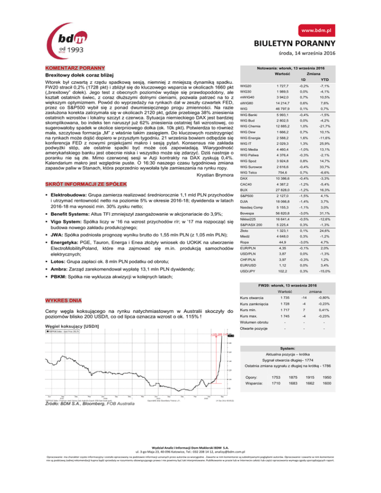BIULETYN PORANNY środa, 14 września 2016 KOMENTARZ PORANNY Notowania: wtorek, 13 września 2016 Wartość Brexitowy dołek coraz bliżej Wtorek był czwartą z rzędu spadkową sesją, niemniej z mniejszą dynamiką spadku. FW20 stracił 0,2% (1728 pkt) i zbliżył się do kluczowego wsparcia w okolicach 1660 pkt („brexitowy” dołek). Jego test z obecnych poziomów wydaje się prawdopodobny, ale kształt ostatnich świec, z coraz dłuższymi dolnymi cieniami, pozwala patrzeć na to z większym optymizmem. Powód do wyprzedaży na rynkach dał w zeszły czwartek FED, przez co S&P500 wybił się z ponad dwumiesięcznego progu zmienności. Na razie zasłużona korekta zatrzymała się w okolicach 2120 pkt, gdzie przebiega 38% zniesienia ostatnich wzrostów i lokalny szczyt z czerwca. Sytuacja niemieckiego DAX jest bardziej skomplikowana, bo indeks ten naruszył już 62% zniesienia ostatniej fali wzrostowej, co sugerowałoby spadek w okolice sierpniowego dołka (ok. 10k pkt). Potwierdza to również mała, szczytowa formacja „M” z właśnie takim zasięgiem. Do kluczowych rozstrzygnięć na rynkach może dojść dopiero w przyszłym tygodniu. 21 września bowiem odbędzie się konferencja FED z nowymi projekcjami makro i sesją pytań. Konsensus nie zakłada podwyżki stóp, ale ostatnie spadki być może coś zapowiadają. Wiarygodność amerykańskiego banku jest obecnie niska i wszystko może się zdarzyć. Dziś nastroje o poranku nie są złe. Mimo czerwonej sesji w Azji kontrakty na DAX zyskują 0,4%. Kalendarium makro jest względnie puste. O 16:30 naszego czasu tygodniowa zmiana zapasów paliw w Stanach, która poprzednio wywołała tyle zamieszania na rynku ropy. Zmiana 1D YTD -7,1% WIG20 1 727,7 -0,2% WIG30 1 989,5 0,0% -4,1% mWIG40 3 942,0 0,7% 10,5% sWIG80 14 214,7 0,6% 7,6% WIG 46 797,9 0,1% 0,7% WIG Banki 5 993,1 -0,4% -1,5% WIG Bud 2 802,5 0,0% -4,2% WIG Chemia 12 885,2 1,0% -21,7% WIG Dew 1 666,2 0,7% 10,1% WIG Energia 2 588,2 1,6% -11,6% WIG IT 2 029,3 1,3% 25,9% WIG Media 4 460,4 -1,0% 13,1% WIG Paliwa 4 376,4 -0,3% -2,1% WIG Spoż 3 924,8 0,8% 14,7% WIG Surowce 2 616,6 -0,4% 33,7% 754,6 0,7% -6,6% DAX 10 386,6 -0,4% -3,3% CAC40 4 387,2 -1,2% -5,4% BUX 27 828,0 -1,2% 16,3% S&P500 2 127,0 -1,5% 4,1% DJIA 18 066,8 -1,4% 3,7% Nasdaq Comp 5 155,3 -1,1% 3,0% Benefit Systems: Altus TFI zmniejszył zaangażowanie w akcjonariacie do 3,9%; Bovespa 56 820,8 -3,0% 31,1% Vigo System: Spółka liczy w ‘16 na wzrost przychodów r/r; w ’17 ma rozpocząć się budowa nowego zakładu produkcyjnego; Nikkei225 16 641,4 -0,5% -12,6% S&P/ASX 200 5 225,4 0,3% -1,3% Złoto 1 323,1 0,1% 24,6% Krystian Brymora SKRÓT INFORMACJI ZE SPÓŁEK Elektrobudowa: Grupa zamierza realizować średniorocznie 1,1 mld PLN przychodów i utrzymać rentowność netto na poziomie 5% w okresie 2016-18; dywidenda w latach 2016-18 ma wynosić min. 30% zysku netto; JWA: Spółka podniosła prognozę wyniku brutto do 1,55 mln PLN (z 1,05 mln PLN); WIG Telco Miedź 4 648,0 0,3% -1,2% Energetyka: PGE, Tauron, Energa i Enea złożyły wniosek do UOKiK na utworzenie ElectroMobilityPoland, które ma zajmować się m.in. produkcją samochodów elektrycznych; Ropa 44,9 -3,0% 4,7% EUR/PLN 4,35 -0,1% 2,0% USD/PLN 3,87 0,0% -1,3% Lotos: Grupa zapłaci ok. 8 mln PLN podatku od obrotu; CHF/PLN 3,97 -0,3% 1,2% EUR/USD 1,12 0,0% 3,4% USD/JPY 102,2 0,3% -15,0% Ambra: Zarząd zarekomendował wypłatę 13,1 mln PLN dywidendy; PBKM: Spółka nie wyklucza akwizycji w kolejnych latach; FW20: wtorek, 13 września 2016 Wartość WYKRES DNIA Ceny węgla koksującego na rynku natychmiastowym w Australii skoczyły do poziomów blisko 200 USD/t, co od lipca oznacza wzrost o ok. 115% ! Węgiel koksujący [USD/t] zmiana Kurs otwarcia 1 735 -14 -0,80% Kurs zamknięcia 1 728 -4 -0,23% Kurs min. 1 717 7 0,41% Kurs max. 1 745 -4 -0,23% Wolumen obrotu - - - Otwarte pozycje - - - System: Aktualna pozycja – krótka Sygnał otwarcia długiej– 1774 Ostatnia zmiana sygnału z długiej na krótką - 1786 Opory: 1753 1875 1915 1950 Wsparcia: 1710 1683 1662 1600 Źródło: BDM S.A., Bloomberg, FOB Australia Wydział Analiz i Informacji Dom Maklerski BDM S.A. ul. 3-go Maja 23, 40-096 Katowice, Tel.: 032 208 14 12, [email protected] Opracowanie ma charakter czysto informacyjny i zostało opracowany na podstawie informacji uznanych przez autorów za wiarygodne . Zawarte w nim komentarze są subiektywnymi poglądami autorów. Opracowanie i zawarte w nim komentarze nie są podstawą żadnej rekomendacji kupna bądź sprzedaży w rozumieniu obowiązującego prawa i nie powinny być tak interpretowane. Publikowanie w prasie lub w Internecie całości lub części opracowania wymaga zgody sporządzających raport. BIULETYN PORANNY środa, 14 września 2016 GPW – PODSUMOWANIE Indeksy GPW FW20 (1,735.00, 1,745.00, 1,717.00, 1,728.00, -4.00000) 2000 1950 1900 Open Low High Close WIG20 1 736,5 1 718,6 1 745,4 1 727,7 -0,2% 560 WIG30 2 000,3 1 979,2 2 008,2 1 989,5 0,0% 633 MWIG40 3 925,3 14 128,9 14 214,7 3 942,0 0,8% 107 SWIG80 14 166,9 3 921,0 3 950,3 14 214,7 0,6% 27 WIG-PL 47 406,1 47 406,1 47 638,0 47 505,1 0,1% 707 WIG 46 951,9 46 599,8 47 099,6 46 797,9 0,1% 715 WIG20 Cena Mkt Cap Alior 1750 1700 1650 7 March 14 21 29 4 11 April 18 25 2 9 May 16 23 30 6 June 13 20 27 4 July 11 18 25 1 8 August 16 22 29 5 12 19 September 26 WIG20 (1,736.54, 1,745.40, 1,718.56, 1,727.69, -3.68005) 2000 1950 1900 1850 1800 1750 1700 1650 7 March 14 21 29 4 11 April 18 25 2 9 May 16 23 30 6 June 13 20 27 4 July 11 18 25 1 8 August 16 22 29 5 12 19 September 26 KOMENTARZ POPOŁUDNIOWY Szukanie równowagi Dzisiejsza sesja na GPW przyniosła próby szukania równowagi na parkiecie po trzech bardzo słabych sesjach. WIG20 dość spokojnie reagował zarówno na początku sesji, gdy inwestorzy byli pod wrażeniem wczorajszego mocnego odbicia w USA, jak i w końcówce notowań, gdy Wall Street zanurkowało 1% w dół. Ostatecznie zakończyliśmy sesję na poziomie 1727 punk