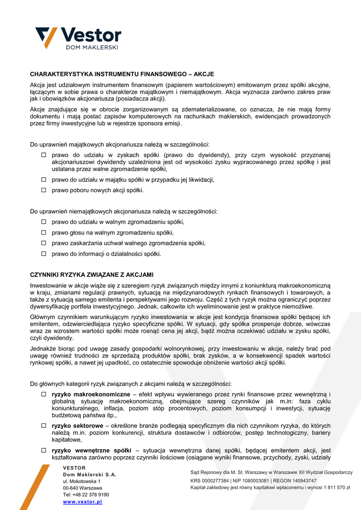 CHARAKTERYSTYKA INSTRUMENTU FINANSOWEGO – AKCJE Akcja jest udziałowym instrumentem finansowym (papierem wartościowym) emitowanym przez spółki akcyjne, łączącym w sobie prawa o charakterze majątkowym i niemajątkowym. Akcja wyznacza zarówno zakres praw jak i obowiązków akcjonariusza (posiadacza akcji). Akcje znajdujące się w obrocie zorganizowanym są zdematerializowane, co oznacza, że nie mają formy dokumentu i mają postać zapisów komputerowych na rachunkach maklerskich, ewidencjach prowadzonych przez firmy inwestycyjne lub w rejestrze sponsora emisji. Do uprawnień majątkowych akcjonariusza należą w szczególności: prawo do udziału w zyskach spółki (prawo do dywidendy), przy czym wysokość przyznanej akcjonariuszowi dywidendy uzależniona jest od wysokości zysku wypracowanego przez spółkę i jest ustalana przez walne zgromadzenie spółki, prawo do udziału w majątku spółki w przypadku jej likwidacji, prawo poboru nowych akcji spółki. Do uprawnień niemajątkowych akcjonariusza należą w szczególności: prawo do udziału w walnym zgromadzeniu spółki, prawo głosu na walnym zgromadzeniu spółki, prawo zaskarżania uchwał walnego zgromadzenia spółki, prawo do informacji o działalności spółki. CZYNNIKI RYZYKA ZWIĄZANE Z AKCJAMI Inwestowanie w akcje wiąże się z szeregiem ryzyk związanych między innymi z koniunkturą makroekonomiczną w kraju, zmianami regulacji prawnych, sytuacją na międzynarodowych rynkach finansowych i towarowych, a także z sytuacją samego emitenta i perspektywami jego rozwoju. Część z tych ryzyk można ograniczyć poprzez dywersyfikację portfela inwestycyjnego. Jednak, całkowite ich wyeliminowanie jest w praktyce niemożliwe. Głównym czynnikiem warunkującym ryzyko inwestowania w akcje jest kondycja finansowa spółki będącej ich emitentem, odzwierciedlająca ryzyko specyficzne spółki. W sytuacji, gdy spółka prosperuje dobrze, wówczas wraz ze wzrostem wartości spółki może rosnąć cena jej akcji, bądź można oczekiwać udziału w zysku spółki, czyli dywidendy. Jednakże biorąc pod uwagę zasady gospodarki wolnorynkowej, przy inwestowaniu w akcje, należy brać pod uwagę również trudności ze sprzedażą produktów spółki, brak zysków, a w konsekwencji spadek wartości rynkowej spółki, a nawet jej upadłość, co ostatecznie spowoduje obniżenie wartości akcji spółki. Do głównych kategorii ryzyk związanych z akcjami należą w szczególności: ryzyko makroekonomiczne – efekt wpływu wywieranego przez rynki finansowe przez wewnętrzną i globalną sytuację makroekonomiczną, obejmujące szereg czynników jak m.in: faza cyklu koniunkturalnego, inflacja, poziom stóp procentowych, poziom konsumpcji i inwestycji, sytuację budżetową państwa itp., ryzyko sektorowe – określone branże podlegają specyficznym dla nich czynnikom ryzyka, do których należą m.in. poziom konkurencji, struktura dostawców i odbiorców, postęp technologiczny, bariery kapitałowe, ryzyko wewnętrzne spółki – sytuacja wewnętrzna danej spółki, będącej emitentem akcji, jest kształtowana zarówno poprzez czynniki ilościowe (osiągane wyniki finansowe, przychody, zyski, udziały VES TO R Dom M a kl e rs ki S. A. ul. Mokotowska 1 00-640 Warszawa Tel: +48 22 378 9190 w w w .ve s to r.p l Sąd Rejonowy dla M. St. Warszawy w Warszawie XII Wydział Gospodarczy KRS 0000277384 | NIP 1080003081 | REGON 140943747 Kapitał zakładowy jest równy kapitałowi wpłaconemu i wynosi 1 811 570 zł w rynku, uzależnienie od eksportu i/lub importu itp.), jak jakościowe (zarządzanie firmą, strategia rozwoju bądź model biznesowy, struktura akcjonariatu, bieżące wydarzenia w spółce lub jej dotyczące), ryzyko związane z rynkiem kapitałowym i obrotem akcjami w obrocie zorganizowanym – wynikające ze specyfiki rynku kapitałowego i obrotu zorganizowanego, gdzie do najważniejszych należą: ryzyko płynności, ryzyko niestabilności i wysokiej zmienności notowań akcji, ryzyko niedojścia emisji do skutku lub niedopuszczenia akcji do obrotu na giełdzie, ryzyko zawieszenia obrotu giełdowego akcjami, ryzyko wykluczenia akcji z obrotu na rynku zorganizowanym. PRAWA DO AKCJI (PDA) Prawo do akcji jest instrumentem finansowych, z którego wynika uprawnienie do otrzymania, niemających formy dokumentu, akcji nowej emisji spółki publicznej, powstające z chwilą dokonania przydziału tych akcji i wygasające z chwilą zarejestrowania akcji w depozycie papierów wartościowych albo z dniem uprawomocnienia się postanowienia sądu rejestrowego odmawiającego wpisu podwyższenia kapitału zakładowego do rejestru przedsiębiorców. Celem praw do akcji jest umożliwienie inwestorom dokonywanie transakcji w obrocie zorganizowanym w okresie przed zarejestrowaniem akcji nowej emisji. CZYNNIKI RYZYKA Z inwestowaniem w prawa do akcji związane są wszystkie czynniki ryzyka charakterystyczne dla inwestycji w akcje. Dodatkowo prawa do akcji są narażone na ryzyko odmówienia przez sąd rejestrowy wpisu podwyższenia kapitału zakładowego, co może skutkować zamrożeniem środków finansowych, do czasu ich zwrotu przez spółkę. PRAWA POBORU Prawo poboru jest instrumentem finansowym związanym z emisją nowych akcji przez spółkę. Stanowi ono prawo nabycia (pierwokupu) akcji nowej emisji przysługujące dotychczasowym akcjonariuszom spółki proporcjonalnie w stosunku do liczby posiadanych już akcji. W przypadku objęcia takiej emisji przez nowy krąg akcjonariuszy nastąpiłoby tzw. rozwodnienie kapitału, czyli zmniejszenie udziału dotychczasowych akcjonariuszy w stosunku do całkowitej sumy kapitału akcyjnego, a co nie ma miejsca w przypadku emisji akcji z prawem poboru. Korzystając z prawa poboru dotychczasowi akcjonariusze mają możliwość zachowania procentowego udziału w kapitale zakładowym. Ważną cechą prawa poboru jest to, że może ono być przedmiotem obrotu jako samodzielny papier warto