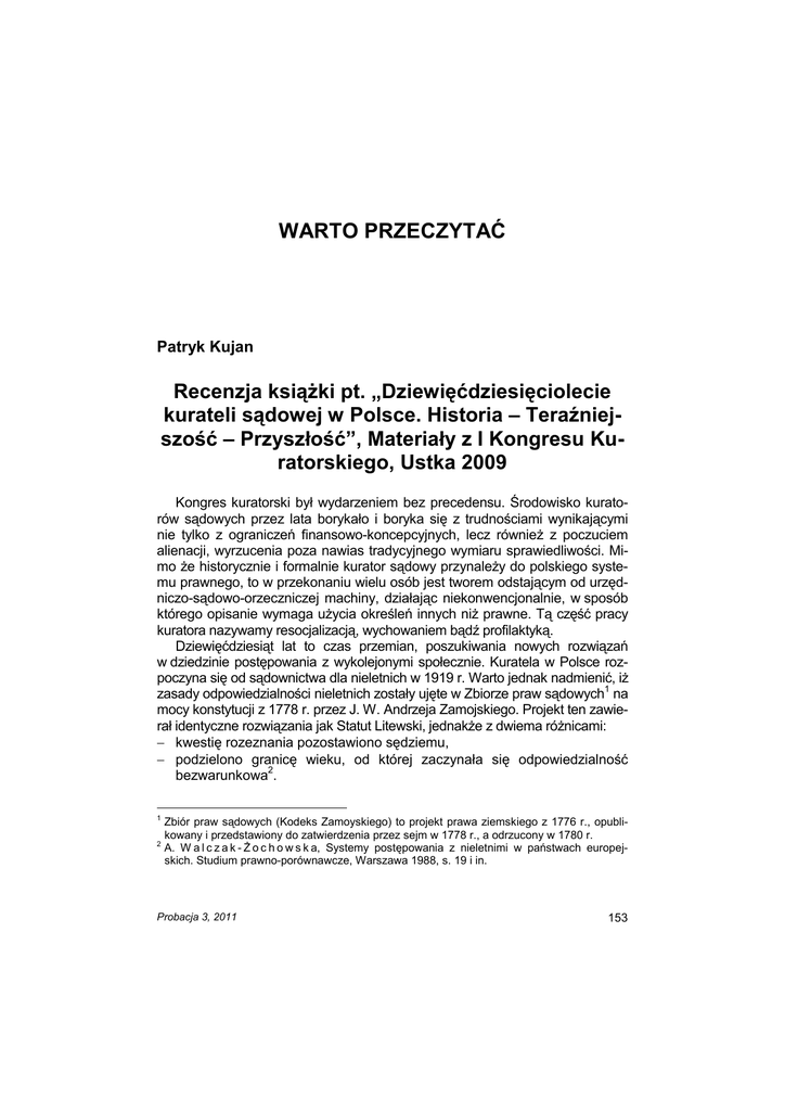 Recenzja ksiąŜki, pt. Dziewięćdziesięciolecie kurateli sądowej w Polsce... WARTO PRZECZYTAĆ Patryk Kujan Recenzja ksiąŜki pt. „Dziewięćdziesięciolecie kurateli sądowej w Polsce. Historia – Teraźniejszość – Przyszłość”, Materiały z I Kongresu Kuratorskiego, Ustka 2009 Kongres kuratorski był wydarzeniem bez precedensu. Środowisko kuratorów sądowych przez lata borykało i boryka się z trudnościami wynikającymi nie tylko z ograniczeń finansowo-koncepcyjnych, lecz równieŜ z poczuciem alienacji, wyrzucenia poza nawias tradycyjnego wymiaru sprawiedliwości. Mimo Ŝe historycznie i formalnie kurator sądowy przynaleŜy do polskiego systemu prawnego, to w przekonaniu wielu osób jest tworem odstającym od urzędniczo-sądowo-orzeczniczej machiny, działając niekonwencjonalnie, w sposób którego opisanie wymaga uŜycia określeń innych niŜ prawne. Tą część pracy kuratora nazywamy resocjalizacją, wychowaniem bądź profilaktyką. Dziewięćdziesiąt lat to czas przemian, poszukiwania nowych rozwiązań w dziedzinie postępowania z wykolejonymi społecznie. Kuratela w Polsce rozpoczyna się od sądownictwa dla nieletnich w 1919 r. Warto jednak nadmienić, iŜ zasady odpowiedzialności nieletnich zostały ujęte w Zbiorze praw sądowych1 na mocy konstytucji z 1778 r. przez J. W. Andrzeja Zamojskiego. Projekt ten zawierał identyczne rozwiązania jak Statut Litewski, jednakŜe z dwiema róŜnicami: − kwestię rozeznania pozostawiono sędziemu, − podzielono granicę wieku, od której zaczynała się odpowiedzialność bezwarunkowa2. 1 2 Zbiór praw sądowych (Kodeks Zamoyskiego) to projekt prawa ziemskiego z 1776 r., opublikowany i przedstawiony do zatwierdzenia przez sejm w 1778 r., a odrzucony w 1780 r. A. W a l c z a k - ś o c h o w s k a, Systemy postępowania z nieletnimi w państwach europejskich. Studium prawno-porównawcze, Warszawa 1988, s. 19 i in. Probacja 3, 2011 153 P. Kujan W II Rzeczypospolitej próby ustanowienia sądów dla nieletnich podjęto w 1915 r. zaraz po ewakuacji władz carskich z Królestwa Polskiego. Władze niemieckie rozwiązały jednak sądy obywatelskie. Dnia 7 lutego 1919 r., dekretem Naczelnika Państwa Józefa Piłsudskiego, ustanowiono pierwsze sądy dla nieletnich (w Lublinie, Warszawie, Łodzi). Zgodnie z rozporządzeniem Ministerstwa Sprawiedliwości, sądy te rozpatrywały wszystkie sprawy karne, o ile dotyczyły nieletnich do 17 lat i osób starszych oskarŜonych o czyny przestępcze popełnione względem nieletnich do 17. roku Ŝycia. Pojawia się instytucja opiekuna sądowego, protoplasty kuratora sądowego. Dla uczestników I Kongresu Kuratorskiego, który odbył się w Ustce w dniach 15–17 czerwca 2009 r., zapis ten stanowi odniesienie do dyskusji nad stanem polskiej kurateli – jej „historią, teraźniejszością i przyszłością”. Śladem po tym wydarzeniu jest wydana publikacja licząca bez aneksu 461 stron. KsiąŜka pt. „Dziewięćdziesięciolecie kurateli sądowej w Polsce. Historia – Teraźniejszość – Przyszłość” jest zbiorem artykułów autorstwa postaci świata polityki, nauki oraz praktyków zajmujących się problematyką kurateli sądowej. Zespół redakcyjny stanowią: Krzysztof Stasiak, Łukasz Wirkus, Paweł Kozłowski oraz Tadeusz Jedynak. Zamieszczone w ksiąŜce opracowania dotyczą teoretycznych i praktycznych problemów związanych z szeroko rozumianą instytucją kurateli sądowej. Publikacja składa się ze wstępu, wystąpień otwierających konferencję, sześciu rozdziałów merytorycznych, wniosków i rekomendacji uczestników kongresu oraz aneksu. Aneks obejmuje tłumaczenia obcojęzycznych artykułów, wykaz uczestników kongresu i komitetu organizacyjnego oraz zdjęcia obrazujące w części przebieg spotkań. Do ksiąŜki dołączono płytę zawierającą film o pracy kuratora sądowego oraz reportaŜ zdjęciowy. Struktura pracy jest zwarta. Rozdziały zawierają treści wynikające z nadrzędnych tytułów. Pierwsza część pracy zawiera treści okolicznościowe związane z otwarciem kongresu oraz wystąpienia zaproszonych gości. W dalszej części odnajdujemy referaty ludzi świata nauki i praktyki zawarte w sześciu merytorycznych rozdziałach. Rozdział pierwszy zatytułowany „Od urzędu stałego opiekuna sądowego do kuratorskiej słuŜby sądowej” rozpoczyna się artykułem Krzysztofa Stasiaka ukazującym ewaluację polskiego systemu kurateli sądowej. W tej część znajdziemy m.in. doświadczenia i przeŜycia związane z formowaniem współczesnego modelu kurateli, co wiąŜe się nierozerwalnie z zabieganiem o powstanie ustawy o kuratorach sądowych i towarzyszący pracom klimat (bój o kaŜdy zapis wspomnianej ustawy). Jak pisze Katarzyna Sawicka, praca nad współczesnym modelem kurateli rozpoczęła się w latach 70. ubiegłego wieku od stawianych przez grupą kuratorów posiadających humanistyczne wykształcenie pytań dotyczących metod pracy z drugim człowiekiem. Propozycje dotyczące modelu pracy kuratorskiej słuŜby sądowej opi- 154 Probacja 3, 2011 Recenzja ksiąŜki, pt. Dziewięćdziesięciolecie kurateli sądowej w Polsce... sał równieŜ Andrzej Bałandynowicz, wskazując na kliniczny model kurateli oraz metodę casework jako podstawę oddziaływania resocjalizacyjnego w warunkach probacji. Rozdział drugi został zatytułowany „SłuŜba kuratorska w społeczeństwie obywatelskim”. W tej części odnajdujemy odwołania do zawodu kuratora jako misji zmierzającej do zmiany Ŝycia podopiecznego, odniesienie do etosu zawodowego kuratora, znaczenie wykonywanych przez kuratora sądowego działań oraz aktualny stan kurateli rodzinnej w Polsce z perspektywy kuratora sądowego (T. Jedynak) oraz kurateli dla dorosłych w świetle badań Biura Rzecznika Praw Obywatelskich. Rozdział trzeci zatytułowany jest „SłuŜby probacyjne i socjalne: rozwiązania, doświadczenia i kierunki rozwoju w Polsce, Europie i na świecie”. Auto