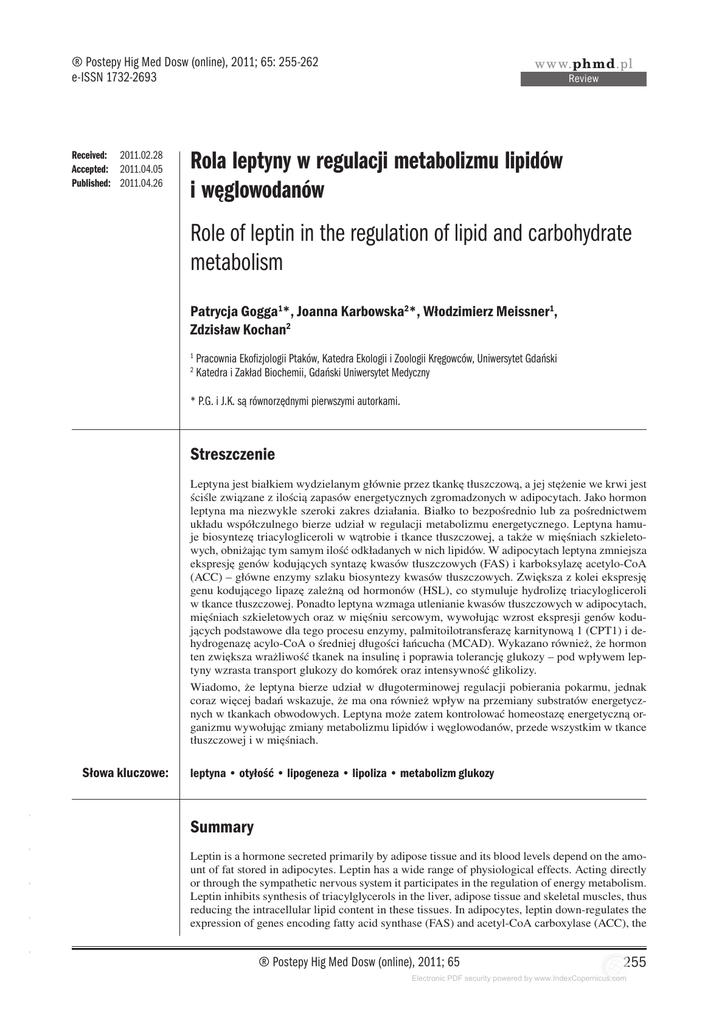 ® Postepy Hig Med Dosw (online), 2011; 65: 255-262 e-ISSN 1732-2693 Received: 2011.02.28 Accepted: 2011.04.05 Published: 2011.04.26 www.phmd.pl Review Rola leptyny w regulacji metabolizmu lipidów i węglowodanów Role of leptin in the regulation of lipid and carbohydrate metabolism Patrycja Gogga1*, Joanna Karbowska2*, Włodzimierz Meissner1, Zdzisław Kochan2 1 2 Pracownia Ekofizjologii Ptaków, Katedra Ekologii i Zoologii Kręgowców, Uniwersytet Gdański Katedra i Zakład Biochemii, Gdański Uniwersytet Medyczny * P.G. i J.K. są równorzędnymi pierwszymi autorkami. Streszczenie leptyna • otyłość • lipogeneza • lipoliza • metabolizm glukozy Summary Leptin is a hormone secreted primarily by adipose tissue and its blood levels depend on the amount of fat stored in adipocytes. Leptin has a wide range of physiological effects. Acting directly or through the sympathetic nervous system it participates in the regulation of energy metabolism. Leptin inhibits synthesis of triacylglycerols in the liver, adipose tissue and skeletal muscles, thus reducing the intracellular lipid content in these tissues. In adipocytes, leptin down-regulates the expression of genes encoding fatty acid synthase (FAS) and acetyl-CoA carboxylase (ACC), the - - - - - Słowa kluczowe: Leptyna jest białkiem wydzielanym głównie przez tkankę tłuszczową, a jej stężenie we krwi jest ściśle związane z ilością zapasów energetycznych zgromadzonych w adipocytach. Jako hormon leptyna ma niezwykle szeroki zakres działania. Białko to bezpośrednio lub za pośrednictwem układu współczulnego bierze udział w regulacji metabolizmu energetycznego. Leptyna hamuje biosyntezę triacylogliceroli w wątrobie i tkance tłuszczowej, a także w mięśniach szkieletowych, obniżając tym samym ilość odkładanych w nich lipidów. W adipocytach leptyna zmniejsza ekspresję genów kodujących syntazę kwasów tłuszczowych (FAS) i karboksylazę acetylo-CoA (ACC) – główne enzymy szlaku biosyntezy kwasów tłuszczowych. Zwiększa z kolei ekspresję genu kodującego lipazę zależną od hormonów (HSL), co stymuluje hydrolizę triacylogliceroli w tkance tłuszczowej. Ponadto leptyna wzmaga utlenianie kwasów tłuszczowych w adipocytach, mięśniach szkieletowych oraz w mięśniu sercowym, wywołując wzrost ekspresji genów kodujących podstawowe dla tego procesu enzymy, palmitoilotransferazę karnitynową 1 (CPT1) i dehydrogenazę acylo-CoA o średniej długości łańcucha (MCAD). Wykazano również, że hormon ten zwiększa wrażliwość tkanek na insulinę i poprawia tolerancję glukozy – pod wpływem leptyny wzrasta transport glukozy do komórek oraz intensywność glikolizy. Wiadomo, że leptyna bierze udział w długoterminowej regulacji pobierania pokarmu, jednak coraz więcej badań wskazuje, że ma ona również wpływ na przemiany substratów energetycznych w tkankach obwodowych. Leptyna może zatem kontrolować homeostazę energetyczną organizmu wywołując zmiany metabolizmu lipidów i węglowodanów, przede wszystkim w tkance tłuszczowej i w mięśniach. ® Postepy Hig Med Dosw (online), 2011; 65 255 Electronic PDF security powered by www.IndexCopernicus.com Postepy Hig Med Dosw (online), 2011; tom 65: 255-262 Key words: Word count:2961 Tables:— Figures:3 References:67 Adres autora: dr hab. n. med. Zdzisław Kochan, Katedra i Zakład Biochemii, Gdański Uniwersytet Medyczny, ul. Dębinki 1, 80-211 Gdańsk; e-mail: [email protected] Wykaz skrótów:ACC – karboksylaza acetylo-CoA (acetyl-CoA carboxylase); ACL – liaza ATP-cytrynianowa (ATP citrate - lyase); ACO – oksydaza acylo-CoA (acyl-CoA oxidase); AMPK – kinaza białkowa aktywowana przez AMP (AMP-activated protein kinase); AGRP – białko z rodziny agouti (agouti-related protein); ATGL – swoista dla adipocytów lipaza triacyloglicerolowa (adipose triglyceride lipase); BAT – brunatna tkanka tłuszczowa (brown adipose tissue); cAMP – cykliczny adenozynomonofosforan (cyclic adenosine monophosphate); CNS – ośrodkowy układ nerwowy (central nervous system); CPT1 – palmitoilotransferaza karnitynowa 1 (carnitine palmitoyltransferase 1); CREB – białko wiążące się z elementem odpowiedzi na cAMP (cAMPresponse element binding protein); CRH – hormon uwalniający kortykotropinę, kortykoliberyna (corticotropin releasing hormone); ERK – kinaza regulowana przez sygnał zewnątrzkomórkowy (extracellular signal-regulated kinase); FAS – syntaza kwasów tłuszczowych (fatty acid synthase); GLUT4 – transporter glukozy 4 (glucose transporter type 4); HSL – lipaza zależna od hormonów (hormone-sensitive lipase); IRS – substrat receptora insuliny (insulin receptor substrate); JAK2 – kinaza Janusa 2 (Janus kinase 2); JNK – N-końcowa kinaza c-Jun (c-Jun N-terminal kinase); LEPR – receptor leptyny (leptin receptor); LPL – lipaza lipoproteinowa (lipoprotein lipase); LXR – wątrobowy receptor X (liver X receptor); MAPK – kinaza białkowa aktywowana przez mitogeny (mitogen-activated protein kinase); MCAD – dehydrogenaza acylo-CoA o średniej długości łańcucha (medium chain acyl-CoA dehydrogenase); NO – tlenek azotu (nitric oxide); NPY – neuropeptyd Y (neuropeptide Y); PDE3B – fosfodiesteraza 3B (phosphodiesterase 3B); PGC1a – koaktywator PPARg 1a (PPARg coactivator 1a); PI3K – 3-kinaza fosfatydyloinozytolowa (phosphatidylinositol 3-kinase); PKA – kinaza białkowa A (protein kinase A); PKB/Akt – kinaza białkowa B/Akt (protein kinase B/Akt); POMC – proopiomelanokortyna (proopiomelanocortin); PPAR – receptor aktywowany przez proliferatory peroksysomów (peroxisome proliferator-activated receptor); PTP1B – białkowa fosfataza tyrozynowa 1B (protein tyrosine phosphatase 1B); SCD1 – desaturaza stearoilo-CoA 1 (stearoyl-CoA desaturase 1); SOCS3 – supresor sygnalizacji cytokin 3 (suppressor of cytokine signalling 3); SREBP – białko wiążące się z elementem odpowiedzi na sterole (sterol r