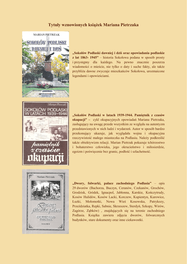 Tytuły wznowionych książek Mariana Pietrzaka „Sokołów Podlaski dawniej i dziś oraz opowiadania podlaskie z lat 1863- 1945” – historia Sokołowa podana w sposób prosty i przystępny dla każdego. Na pewno znacznie poszerza wiadomości o mieście, nie tylko o daty i suche fakty, ale także przybliża dawne zwyczaje mieszkańców Sokołowa, urozmaicone legendami i opowieściami. „Sokołów Podlaski w latach 1939-1944. Pamiętnik z czasów okupacji” – cykl okupacyjnych opowiadań Mariana Pietrzaka, zasługujący na uwagę przede wszystkim ze względu na autentyzm przedstawionych w nich ludzi i wydarzeń. Autor w sposób bardzo przekonujący ukazuje, jak wyglądała wojna i okupacyjna rzeczywistość małego miasteczka na Podlasiu. Należy podkreślić także obiektywizm relacji. Marian Pietrzak pokazuje tchórzostwo i bohaterstwo człowieka, jego okrucieństwo i miłosierdzie, egoizm i poświęcenie bez granic, podłość i szlachetność. „Dwory, folwarki, pałace zachodniego Podlasia” – opis 29 dworów (Bachorza, Buczyn, Ceranów, Czekanów, Grochów, Grodzisk, Gródek, Ignacpol, Jabłonna, Karskie, Kończytrudy, Kosów Hulidów, Kosów Lacki, Korczew, Kupientyn, Kurowice, Łuzki, Mołomotki, Nowa Wieś Kosowska, Patrykozy, Przeździatka, Repki, Sabnie, Skrzeszew, Sterdyń, Szkopy, Wirów, Zagórze, Ząbków) , znajdujących się na terenie zachodniego Podlasia. Książka zawiera zdjęcia dworów, folwarcznych budynków, stare dokumenty oraz inne ciekawostki. „Jaćwingowie. Powieść z XII wieku”. Ta książka to cząstka historii Ziemi Podlaskiej, a szczególnie regionu sokołowskiego. Przybliża ona dzieje tej ziemi, życie ówczesnych jej mieszkańców, dawne zwyczaje, wierzenia, legendy i inne ciekawostki, których większość z nas nie zna. W książce znajdują się zdjęcia wałów starego grodziska nad Cetynią, starego cmentarzyska, mapy i rysunki. „Czy istnieje drugie życie” - książka oparta na osobistych przeżyciach, znakach i snach autora, które doświadczał przez blisko 40 lat. Marian Pietrzak zaczął notować swoje sny w 1972 roku. Na początku zapisywał niektóre tylko sny, potem spisywał każdy, bez wyjątku. Stały się one nawet przyczyną do zmiany sposobu myślenia i postępowania autora. To pozycja zarówno dla tych, którzy wątpią w istnienie Boga i drugie życie, niewierzących, jak i tych, którzy wierzą, by nie mieli żadnej wątpliwości. Recenzję tej interesującej książki napisała pani prof. dr hab. Stanisława Okularczyk. „Kościoły i cmentarze ziemi sokołowskiej – duchy i sny” – ta książka to nie tylko ciekawostki historyczno-krajoznawcze, dotyczące parafii, świątyń, czy opisy 24 cmentarzy i znajdujących się tam grobowców oraz zabytkowych pomników. To przede wszystkim obszerne fragmenty z dziejów rodzin pochowanych na Ziemi Sokołowskiej, a także poszczególnych osób, których przeszłość nieraz toczyła się dramatycznymi, wręcz tragicznymi kolejami losu i ściśle związana była z naszą małą ojczyzną.