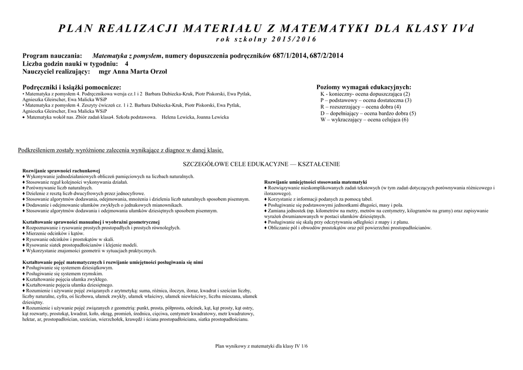 PLAN REALIZACJI MATERIAŁU Z MATEMATYKI DLA KLASY IVd rok szkolny 2015/2016 Program nauczania: Matematyka z pomysłem, numery dopuszczenia podręczników 687/1/2014, 687/2/2014 Liczba godzin nauki w tygodniu: 4 Nauczyciel realizujący: mgr Anna Marta Orzoł Poziomy wymagań edukacyjnych: Podręczniki i książki pomocnicze: K - konieczny- ocena dopuszczająca (2) P – podstawowy – ocena dostateczna (3) R – rozszerzający – ocena dobra (4) D – dopełniający – ocena bardzo dobra (5) W – wykraczający – ocena celująca (6) • Matematyka z pomysłem 4. Podręcznikowa wersja cz.1 i 2 Barbara Dubiecka-Kruk, Piotr Piskorski, Ewa Pytlak, Agnieszka Gleirscher, Ewa Malicka WSiP • Matematyka z pomysłem 4. Zeszyty ćwiczeń cz. 1 i 2. Barbara Dubiecka-Kruk, Piotr Piskorski, Ewa Pytlak, Agnieszka Gleirscher, Ewa Malicka WSiP Matematyka wokół nas. Zbiór zadań klasa4. Szkoła podstawowa. Helena Lewicka, Joanna Lewicka Podkreśleniem zostały wyróżnione zalecenia wynikające z diagnoz w danej klasie. SZCZEGÓŁOWE CELE EDUKACYJNE — KSZTAŁCENIE Rozwijanie sprawności rachunkowej ♦ Wykonywanie jednodziałaniowych obliczeń pamięciowych na liczbach naturalnych. ♦ Stosowanie reguł kolejności wykonywania działań. ♦ Porównywanie liczb naturalnych. ♦ Dzielenie z resztą liczb dwucyfrowych przez jednocyfrowe. ♦ Stosowanie algorytmów dodawania, odejmowania, mnożenia i dzielenia liczb naturalnych sposobem pisemnym. ♦ Dodawanie i odejmowanie ułamków zwykłych o jednakowych mianownikach. ♦ Stosowanie algorytmów dodawania i odejmowania ułamków dziesiętnych sposobem pisemnym. Kształtowanie sprawności manualnej i wyobraźni geometrycznej ♦ Rozpoznawanie i rysowanie prostych prostopadłych i prostych równoległych. ♦ Mierzenie odcinków i kątów. ♦ Rysowanie odcinków i prostokątów w skali. ♦ Rysowanie siatek prostopadłościanów i klejenie modeli. ♦ Wykorzystanie znajomości geometrii w sytuacjach praktycznych. Rozwijanie umiejętności stosowania matematyki ♦ Rozwiązywanie nieskomplikowanych zadań tekstowych (w tym zadań dotyczących porównywania różnicowego i ilorazowego). ♦ Korzystanie z informacji podanych za pomocą tabel. ♦ Posługiwanie się podstawowymi jednostkami długości, masy i pola. ♦ Zamiana jednostek (np. kilometrów na metry, metrów na centymetry, kilogramów na gramy) oraz zapisywanie wyrażeń dwumianowanych w postaci ułamków dziesiętnych. ♦ Posługiwanie się skalą przy odczytywaniu odległości z mapy i z planu. ♦ Obliczanie pól i obwodów prostokątów oraz pól powierzchni prostopadłościanów. Kształtowanie pojęć matematycznych i rozwijanie umiejętności posługiwania się nimi ♦ Posługiwanie się systemem dziesiątkowym. ♦ Posługiwanie się systemem rzymskim. ♦ Kształtowanie pojęcia ułamka zwykłego. ♦ Kształtowanie pojęcia ułamka dziesiętnego. ♦ Rozumienie i używanie pojęć związanych z arytmetyką: suma, różnica, iloczyn, iloraz, kwadrat i sześcian liczby, liczby naturalne, cyfra, oś liczbowa, ułamek zwykły, ułamek właściwy, ułamek niewłaściwy, liczba mieszana, ułamek dziesiętny. ♦ Rozumienie i używanie pojęć związanych z geometrią: punkt, prosta, półprosta, odcinek, kąt, kąt prosty, kąt ostry, kąt rozwarty, prostokąt, kwadrat, koło, okrąg, promień, średnica, cięciwa, centymetr kwadratowy, metr kwadratowy, hektar, ar, prostopadłościan, sześcian, wierzchołek, krawędź i ściana prostopadłościanu, siatka prostopadłościanu. Plan wynikowy z matematyki dla klasy IV 1/6 L Rozdział godz. 1 Nr lekcji Tematy lekcji O czym będziemy się uczyć na lekcjach matematyki w klasie IV? Wymagania ponadpodstawowe Uczeń: Wymagania podstawowe Uczeń: Zapoznanie uczniów z materiałem nauczania oraz przedmiotowymi zasadami oceniania. Ustalenie zasad pracy na lekcjach matematyki. 3 Piszemy sprawdzian diagnozujący. Omówienie wyników sprawdzianu. DZIAŁ I. LICZBY NATURALNE W DZIESIĄTKOWYM UKŁADZIE POZYCYJNYM (19godz.) 1. Zbieranie i prezentowanie danych 2 Zbieranie danych Porządkowanie i prezentowanie danych • gromadzi i porządkuje dane (13.1); • odczytuje dane przedstawione w tekstach, tabelach, na diagramach i wykresach (13.2); 2. Rzymski system zapisu liczb 2 Zapisywanie i odczytywanie liczb w systemie rzymskim Zapisywanie i odczytywanie liczb w systemie rzymskim – ćwiczenia • liczby zapisane w systemie rzymskim w zakresie do 30 przedstawia w systemie dziesiątkowym (1.5); • liczby zapisane w systemie dziesiątkowym w zakresie do 30 przedstawia w systemie rzymskim (1.5); 3. Obliczenia kalendarzowe 2 Kalendarz – proste rachunki związane z upływem czasu Obliczenia kalendarzowe związane z upływem czasu • wykonuje proste obliczenia kalendarzowe na dniach, tygodniach, miesiącach, latach (12.4); • interpretuje dane przedstawione w tekstach, tabelach, diagramach i na wykresach (13.2); • przedstawia dane w tabelach, na diagramach i wykresach (13.2); • liczby zapisane w systemie rzymskim w zakresie do 39 przedstawia w systemie dziesiątkowym (R); • liczby zapisane w systemie dziesiątkowym w zakresie do 39 przedstawia w systemie rzymskim (R); • wykonuje obliczenia kalendarzowe na dniach, tygodniach, miesiącach, latach (12.4); 4. Obliczenia zegarowe 3 • wykonuje proste obliczenia zegarowe na godzinach, minutach i sekundach (12.3); • wykonuje obliczenia zegarowe na godzinach, minutach i sekundach (12.3); 5. Liczby wielocyfrowe 3 Miary czasu – proste rachunki związane z jednostkami czasu Zapisywanie i odczytywanie godzin w systemie 12- i 24-godzinnym. Obliczenia zegarowe Obliczenia zegarowe związane z upływem czasu – zadania tekstowe Liczby naturalne w dziesiątkowym systemie pozycyjnym Odczytywanie i zapisywanie liczb wielocyfrowych Liczby wielocyfrowe w zadaniach tekstowych • odczytuje liczby naturalne wielocyfrowe do miliona (1.1); • zapisuje liczby naturalne wielocyfrowe do miliona (1.1); • odczytuj