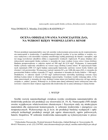 nanocząstki, nanocząstki tlenku cyrkonu, fitotoksyczność, Lemna minor Nina DOSKOCZ, Monika ZAŁĘSKA-RADZIWIŁŁ* OCENA ODDZIAŁYWANIA NANOCZĄSTEK ZrO2 NA WZROST RZĘSY WODNEJ LEMNA MINOR Wzrost produkcji nanomateriałów oraz ich szerokie wykorzystanie przyczynia się do rozprzestrzeniania nanocząstek w środowisku. Z opublikowanych danych wynika, iż są one stabilne w wodzie, wysoce reaktywne a ich niewielkie wymiary umożliwiają szybką penetrację do tkanek i narządów, stąd też mogą wywoływać szkodliwe efekty u organizmów wodnych i lądowych. W pracy zbadano ekotoksyczność nanocząstek tlenku cyrkonu w stosunku do rzęsy wodnej Lemna minor (rzęsa drobna). Badania przeprowadzono w zakresie stężeń od 500 mg/l do 0,34 mg/l. Wykazano, iż nanocząstki tlenku cyrkonu wpływały szkodliwie na wzrost rzęsy drobnej Lemna minor. W najwyższych badanych stężeniach (500–3,9 mg/l) badane nanocząstki hamowały zarówno wzrost liczby listków jak również i ich powierzchni. Wyznaczona wartość stężenia EC50 po 168h dla nano-ZrO2 w stosunku do powierzchni listków rośliny wynosiła 277 mg/L, natomiast w stosunku do liczby listków > 500 mg/L. Dodatkowo, w zakresie stężeń 1,9–0,9 mg/l zaobserwowano niewielką stymulację wzrostu rzęsy drobnej Lemna minor w obecności badanego nanozwiązku. Uzyskane wyniki wskazują także, iż badany nanozwiązek w stosunku do rzęsy drobnej Lemna minor jest bardziej toksyczny od tego samego związku w „makro” postaci, Wskazuje to, że forma nano danej substancji może wskazywać inne właściwości i stanowić dużo większe zagrożenie dla środowiska niż ta sama substancja w dużej formie 1. WSTĘP Szybki rozwój nanotechnologii zwiększa ryzyko uwalniania nanomateriałów do środowiska podczas ich produkcji czy stosowania [4, 19, 8]. Nanocząstki (NP) dzięki swoim wyjątkowym właściwościom chemicznym i fizycznym stały się atrakcyjnym materiałem dla zastosowań komercyjnych, w ochronie środowiska i energetyce czy terapeutycznych. Wykorzystuje się je m.in. do produkcji bardziej wydajnych i opłacalnych technologii produkcji energii jak ogniw słonecznych, ogniw paliwowych, baterii, biopaliwa. W ochronie środowiska nanocząstki są wykorzystywane w proce__________ * Politechnika Warszawska, Wydział Inżynierii Środowiska, Zakład Biologii ul. Nowowiejska 20, 00-653 Warszawa, nr tel. (22) 2347903, [email protected], [email protected] 184 N. DOSKOCZ, M. ZAŁĘSKA-RADZIWIŁŁ sach oczyszczania ścieków i uzdatniania wody, czy zmniejszenia emisji zanieczyszczeń. W medycynie stosuje się je, jako nośniki leków, w produkcji narzędzi chirurgicznych, testów diagnostycznych. Znajdują również zastosowanie w produkcji farb, różnego rodzaju powłok antybakteryjnych, katalizatorów, filtrów słonecznych kremów, różnych środków przeciwbakteryjnych. Tak powszechne stosowanie nanocząstek wzbudziło szereg obaw dotyczących zagrożeń zarówno dla środowiska jak i dla ludzi [15]. Nanocząstki ze względu na swoje niewielkie rozmiary i wysoką reaktywność, w porównaniu z cząstkami o większych rozmiarach mają zupełnie inny profil toksyczności [5]. Stąd też trudne do przewidzenia są skutki ekologiczne, jakie mogą wywołać. Konieczne są, więc szeroko zakrojone badania ekotoksykologiczne nanomateriałów, które nie tylko przyczynią się do zapewnienia bezpieczeństwa zastosowań nanotechnologii, ale pomogą również opracować materiały, najmniej szkodliwe dla organizmów [3]. Obecnie pojawiają się dane dotyczące ekotoksyczności nanocząstek w stosunku do takich organizmów jak: bakterie, glony i ryby, zooplankton czy rośliny wyższe. Wykazano m.in., iż nanocząstki TiO2 hamowały wzrost glonów, skorupiaków Daphnia magna oraz powodowały zaburzenia reprodukcji Danio rerio [ 17, 20, 22]. Dane dotyczące toksyczności nanocząstek w stosunku do roślin, nadal są jednak nieliczne [14]. Rośliny stanowią zasadnicze elementy wszystkich ekosystemów i odgrywają kluczową rolę w losach i transporcie nanocząstek w środowisku i mogą być przyczyną ich bioakumulacji w łańcuchu pokarmowym [16, 6]. Wpływ NP na procesy fizjologiczne roślin są bardzo istotne do oceny bezpieczeństwa stosowanych materiałów. Ograniczona liczba publikacji odnośnie fitotoksyczności wykazała zróżnicowany wpływ nanocząstek na rośliny wyższe. Stwierdzono m.in., że mieszanina nanokrzemu (SiO2) i ditlenku tytanu (TiO2) w niskich stężeniach, powodowała przyspieszenie kiełkowania i wzrostu soi [11], z kolei badania przeprowadzone przez Song i wsp. (2012) wykazały, że nanocząstki ditlenku tytanu w niskich stężeniach stymulowały wzrost Lemna minor, natomiast w wysokich stężeniach hamowały wzrost tych roślin [18]. Stwierdzono również, że nanocząstki tlenku glinu znacznie zwiększały biomasę L. minor, przy czym dodatkowo zaobserwowano zmiany morfologiczne m.in. zwiększenie długości korzeni, liczby liści oraz zwiększona wydajność fotosyntezy [12]. Celem w niniejszej pracy, było badanie fitotoksyczności nanocząstek tlenku cyrkonu (nano-ZrO2) w odniesieniu do rzęsy drobnej Lemna minor. Rzęsa drobna jest odpowiednią rośliną do oceny ekotoksyczności związków chemicznych. Jest rośliną słodkowodną, szeroko rozpowszechnioną na świecie. Należy do organizmów łatwo przystosowujących się do zmieniających się warunków środowiska. Z drugiej strony jest wrażliwa na zanieczyszczenia substancjami toksycznymi. Cechami, które sprawiają, że jest ona organizmem bardzo wygodnym w badaniach laboratoryjnych są jej małe rozmiary, prosta budowa, wegetatywny sposób rozmnażania i krótki czas między Ocena oddziaływania nanocząstek ZrO2 na wzrost rzęsy wodnej Lemna minor 185 kolejnymi podziałami [2]. Badania pokazują, iż Lemna minor, jest wrażliwa na wiele toksyn stąd też należy do najchętniej stosowanych w badaniach ekotoksyczności roślin wyższych, co znajduj