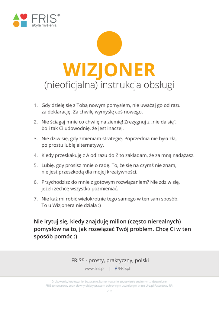 WIZJONER (nieoficjalna) instrukcja obs³ugi 1. Gdy dzielê siê z Tob¹ nowym pomys³em, nie uwa¿aj go od razu za deklaracjê. Za chwilê wymylê co nowego. 2. Nie ciagaj mnie co chwilê na ziemiê! Zrezygnuj z nie da siê, bo i tak Ci udowodniê, ¿e jest inaczej. 3. Nie dziw siê, gdy zmieniam strategiê. Poprzednia nie by³a z³a, po prostu lubiê alternatywy. 4. Kiedy przeskakujê z A od razu do Z to zak³adam, ¿e za mn¹ nad¹¿asz. 5. Lubiê, gdy prosisz mnie o radê. To, ¿e siê na czym nie znam, nie jest przeszkod¹ dla mojej kreatywnoci. 6. Przychodzisz do mnie z gotowym rozwi¹zaniem? Nie zdziw siê, je¿eli zechcê wszystko pozmieniaæ. 7. Nie ka¿ mi robiæ wielokrotnie tego samego w ten sam sposób. To u Wizjonera nie dzia³a :) Nie irytuj siê, kiedy znajdujê milion (czêsto nierealnych) pomys³ów na to, jak rozwi¹zaæ Twój problem. Chcê Ci w ten sposób pomóc :) FRIS® - prosty, praktyczny, polski www.fris.pl | /FRISpl Drukowanie, kopiowanie, bazgranie, komentowanie, przesy³anie znajomym... dozwolone! FRIS to towarowy znak s³owny objêty prawem ochronnym udzielonym przez Urz¹d Patentowy RP. v1.2