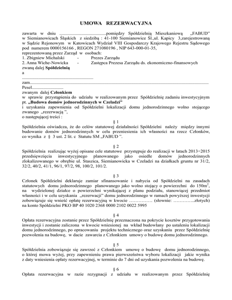 UMOWA REZERWACYJNA zawarta w dniu ........................................pomiędzy Spółdzielnią Mieszkaniową „FABUD” w Siemianowicach Śląskich z siedzibą : 41-100 Siemianowice Śl.,ul. Kapicy 3,zarejestrowaną w Sądzie Rejonowym w Katowicach Wydział VIII Gospodarczy Krajowego Rejestru Sądowego pod numerem 0000156166 , REGON 271080196 , NIP 643-000-01-35, reprezentowaną przez Zarząd w osobach: 1. Zbigniew Michalski Prezes Zarządu 2. Anna Wiche-Nowicka Zastępca Prezesa Zarządu ds. ekonomiczno-finansowych zwaną dalej Spółdzielnią a ............................................................. zam......................................................................................................................................................... Pesel........................... zwanym dalej Członkiem w sprawie przystąpienia do udziału w realizowanym przez Spółdzielnię zadaniu inwestycyjnym pt. „Budowa domów jednorodzinnych w Czeladzi” i uzyskania zapewnienia od Spółdzielni lokalizacji domu jednorodzinnego wolno stojącego zwanego „rezerwacją ”, o następującej treści : §1 Spółdzielnia oświadcza, że do celów statutowej działalności Spółdzielni należy między innymi budowanie domów jednorodzinnych w celu przeniesienia ich własności na rzecz Członków, co wynika z § 3 ust. 2 lit. c Statutu SM „FABUD ”. §2 Spółdzielnia realizując wyżej opisane cele statutowe przystępuje do realizacji w latach 2013÷2015 przedsięwzięcia inwestycyjnego planowanego jako osiedle domów jednorodzinnych zlokalizowanego w obrębie ul. Staszica, Siemianowicka w Czeladzi na działkach gruntu nr 31/2, 32/2, 40/2, 41/1, 96/1, 97/2, 98, 100/2, 101/2. §3 Członek Spółdzielni deklaruje zamiar sfinansowanie i nabycia od Spółdzielni na zasadach statutowych domu jednorodzinnego planowanego jako wolno stojący o powierzchni do 150m2, na wydzielonej działce o powierzchni wynikającej z planu podziału, stanowiącej przedmiot własności i w celu uzyskania „rezerwacji” domu jednorodzinnego w ramach powyższej inwestycji zobowiązuje się wnieść opłatę rezerwacyjną w kwocie …………… (słownie: …………..złotych) na konto Spółdzielni PKO BP 40 1020 2368 0000 2102 0022 5995 §4 Opłata rezerwacyjna zostanie przez Spółdzielnię przeznaczona na pokrycie kosztów przygotowania inwestycji i zostanie zaliczona w kwocie wniesionej na wkład budowlany po ustaleniu lokalizacji domu jednorodzinnego, po opracowaniu projektu technicznego oraz uzyskaniu przez Spółdzielnię pozwolenia na budowę, w dacie zawarcia z Członkiem umowy o budowę domu jednorodzinnego. §5 Spółdzielnia zobowiązuje się zawrzeć z Członkiem umowę o budowę domu jednorodzinnego, o której mowa wyżej, przy zapewnieniu prawa pierwszeństwa wyboru lokalizacji jakie wynika z daty wniesienia opłaty rezerwacyjnej, w terminie do 7 dni od uzyskania pozwolenia na budowę. §6 Opłata rezerwacyjna w razie rezygnacji z udziału w realizowanym przez Spółdzielnię przedsięwzięciu inwestycyjnym opisanym w niniejszej umowie, podlega zwrotowi na rzecz Członka w kwocie nominalnej w terminie do 3 miesięcy od daty złożenia oświadczenia o rezygnacji, zaś w razie uzyskania w miejsce rezygnującego Członka wpłaty od kolejnego Członka Spółdzielni przystępującego do udziału w przedsięwzięciu inwestycyjnym, termin zwrotu ulegnie odpowiedniemu skróceniu. §7 Przeniesienie praw z niniejszej umowy na rzecz osoby trzeciej wymaga zgody Spółdzielni. §8 Zmiany umowy wymagają formy pisemnej pod rygorem nieważności. §9 W sprawach nieuregulowanych niniejszą umową stosuje się odpowiednio przepisy art.18 do art. 22 ustawy z 15.12.2000r o Spółdzielniach mieszkaniowych oraz Statutu SM”FABUD”. § 10. Członek nie wyraża zgody na ujawnianie treści niniejszej umowy osobom trzecim. §11 Umowę sporządza się w dwóch egzemplarzach, po jednej dla każdej ze stron umowy . CZŁONEK SPÓŁDZIELNIA
