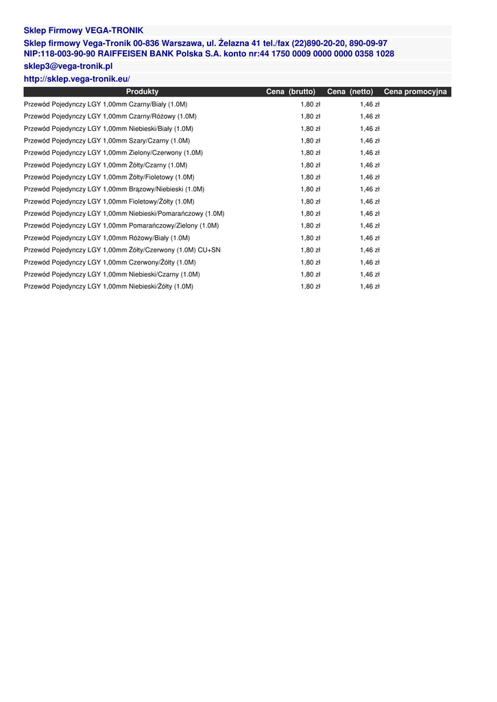 Sklep Firmowy VEGA-TRONIK Sklep firmowy Vega-Tronik 00-836 Warszawa, ul. Żelazna 41 tel./fax (22)890-20-20, 890-09-97 NIP:118-003-90-90 RAIFFEISEN BANK Polska S.A. konto nr:44 1750 0009 0000 0000 0358 1028 [email protected] http://sklep.vega-tronik.eu/ Produkty Cena (brutto) Cena (netto) Przewód Pojedynczy LGY 1,00mm Czarny/Biały (1.0M) 1,80 zł 1,46 zł Przewód Pojedynczy LGY 1,00mm Czarny/Różowy (1.0M) 1,80 zł 1,46 zł Przewód Pojedynczy LGY 1,00mm Niebieski/Biały (1.0M) 1,80 zł 1,46 zł Przewód Pojedynczy LGY 1,00mm Szary/Czarny (1.0M) 1,80 zł 1,46 zł Przewód Pojedynczy LGY 1,00mm Zielony/Czerwony (1.0M) 1,80 zł 1,46 zł Przewód Pojedynczy LGY 1,00mm Żółty/Czarny (1.0M) 1,80 zł 1,46 zł Przewód Pojedynczy LGY 1,00mm Żółty/Fioletowy (1.0M) 1,80 zł 1,46 zł Przewód Pojedynczy LGY 1,00mm Brązowy/Niebieski (1.0M) 1,80 zł 1,46 zł Przewód Pojedynczy LGY 1,00mm Fioletowy/Żółty (1.0M) 1,80 zł 1,46 zł Przewód Pojedynczy LGY 1,00mm Niebieski/Pomarańczowy (1.0M) 1,80 zł 1,46 zł Przewód Pojedynczy LGY 1,00mm Pomarańczowy/Zielony (1.0M) 1,80 zł 1,46 zł Przewód Pojedynczy LGY 1,00mm Różowy/Biały (1.0M) 1,80 zł 1,46 zł Przewód Pojedynczy LGY 1,00mm Żółty/Czerwony (1.0M) CU+SN 1,80 zł 1,46 zł Przewód Pojedynczy LGY 1,00mm Czerwony/Żółty (1.0M) 1,80 zł 1,46 zł Przewód Pojedynczy LGY 1,00mm Niebieski/Czarny (1.0M) 1,80 zł 1,46 zł Przewód Pojedynczy LGY 1,00mm Niebieski/Żółty (1.0M) 1,80 zł 1,46 zł Cena promocyjna
