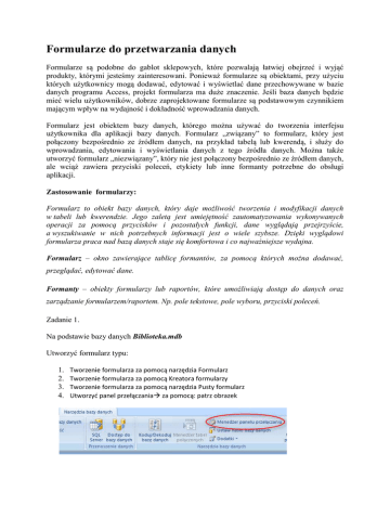 Formularze do przetwarzania danych Formularze są podobne do gablot sklepowych, które pozwalają łatwiej obejrzeć i wyjąć produkty, którymi jesteśmy zainteresowani. Ponieważ formularze są obiektami, przy użyciu których użytkownicy mogą dodawać, edytować i wyświetlać dane przechowywane w bazie danych programu Access, projekt formularza ma duże znaczenie. Jeśli baza danych będzie mieć wielu użytkowników, dobrze zaprojektowane formularze są podstawowym czynnikiem mającym wpływ na wydajność i dokładność wprowadzania danych. Formularz jest obiektem bazy danych, którego można używać do tworzenia interfejsu użytkownika dla aplikacji bazy danych. Formularz „związany” to formularz, który jest połączony bezpośrednio ze źródłem danych, na przykład tabelą lub kwerendą, i służy do wprowadzania, edytowania i wyświetlania danych z tego źródła danych. Można także utworzyć formularz „niezwiązany”, który nie jest połączony bezpośrednio ze źródłem danych, ale wciąż zawiera przyciski poleceń, etykiety lub inne formanty potrzebne do obsługi aplikacji. Zastosowanie formularzy: Formularz to obiekt bazy danych, który daje możliwość tworzenia i modyfikacji danych w tabeli lub kwerendzie. Jego zaletą jest umiejętność zautomatyzowania wykonywanych operacji za pomocą przycisków i pozostałych funkcji, dane wyglądają przejrzyście, a wyszukiwanie w nich potrzebnych informacji jest o wiele szybsze. Dzięki wyglądowi formularza praca nad bazą danych staje się komfortowa i co najważniejsze wydajna. Formularz – okno zawierające tablicę formantów, za pomocą których można dodawać, przeglądać, edytować dane. Formanty – obiekty formularzy lub raportów, które umożliwiają dostęp do danych oraz zarządzanie formularzem/raportem. Np. pole tekstowe, pole wyboru, przyciski poleceń. Zadanie 1. Na podstawie bazy danych Biblioteka.mdb Utworzyć formularz typu: 1. 2. 3. 4. Tworzenie formularza za pomocą narzędzia Formularz Tworzenie formularza za pomocą Kreatora formularzy Tworzenie formularza za pomocą narzędzia Pusty formularz Utworzyć panel przełączania za pomocą: patrz obrazek