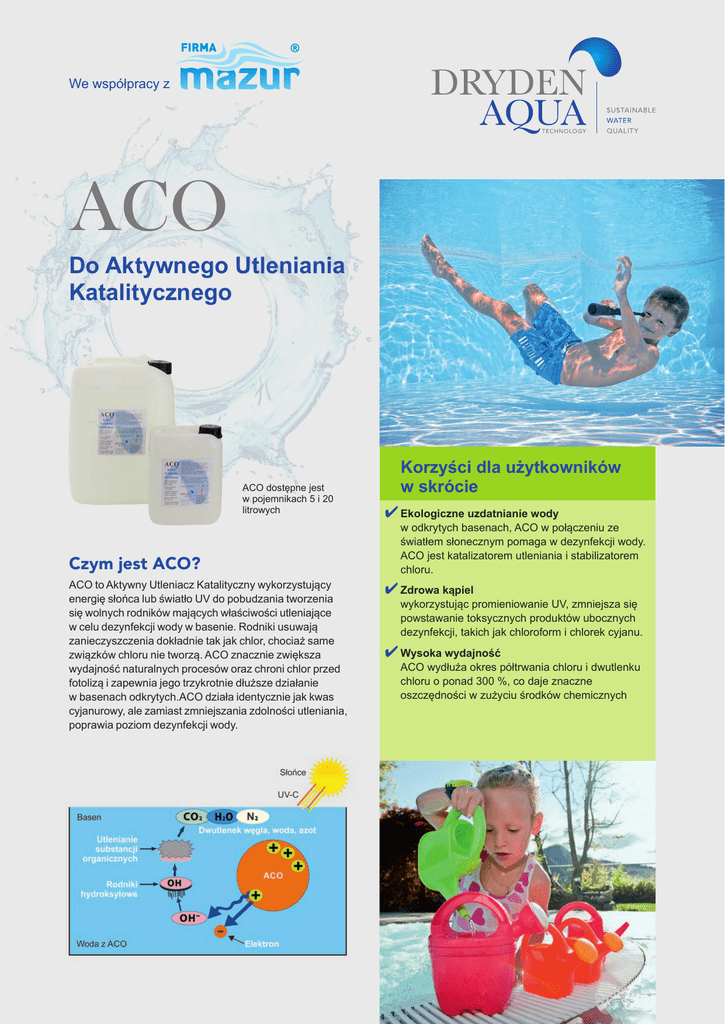 We współpracy z ACO Do Aktywnego Utleniania Katalitycznego ACO dostępne jest w pojemnikach 5 i 20 litrowych Czym jest ACO? ACO to Aktywny Utleniacz Katalityczny wykorzystujący energię słońca lub światło UV do pobudzania tworzenia się wolnych rodników mających właściwości utleniające w celu dezynfekcji wody w basenie. Rodniki usuwają zanieczyszczenia dokładnie tak jak chlor, chociaż same związków chloru nie tworzą. ACO znacznie zwiększa wydajność naturalnych procesów oraz chroni chlor przed fotolizą i zapewnia jego trzykrotnie dłuższe działanie w basenach odkrytych.ACO działa identycznie jak kwas cyjanurowy, ale zamiast zmniejszania zdolności utleniania, poprawia poziom dezynfekcji wody. Korzyści dla użytkowników w skrócie ✔Ekologiczne uzdatnianie wody w odkrytych basenach, ACO w połączeniu ze światłem słonecznym pomaga w dezynfekcji wody. ACO jest katalizatorem utleniania i stabilizatorem chloru. ✔Zdrowa kąpiel wykorzystując promieniowanie UV, zmniejsza się powstawanie toksycznych produktów ubocznych dezynfekcji, takich jak chloroform i chlorek cyjanu. ✔Wysoka wydajność ACO wydłuża okres półtrwania chloru i dwutlenku chloru o ponad 300 %, co daje znaczne oszczędności w zużyciu środków chemicznych Zapewnij sobie i swojej rodzinie to, co najlepsze. W drodze konwersji światła UV o krótkiej fali na światło o fali długiej, chlor chroniony jest przed fotolizą (rozkładem pod wpływem promieniowania słonecznego). Okres półtrwania chloru wzrasta o ponad 300 %. W przeciwieństwie do tradycyjnych stabilizatorów chloru takich jak kwas cyjanurowy, ACO wzmacnia bakteriobójcze działanie chloru i zapewnia czyściejszą i bezpieczniejszą wodę zarówno w basenach prywatnych jak i publicznych. Jak stosować ACO? ACO najlepiej dozować do ZPM w sposób ciągły z użyciem naszej pompy perystaltycznej (pompa flokulacyjna Dryden Aqua) za filtrem ze złożem AFM®; dawka wynosi 1 ml na metr sześcienny wody w obiegu. ACO można dozować ręcznie; dawka wynosi 1 l na 100 m3 objętości basenu tygodniowo. Zalecamy aby pierwsza dawka była podwójna. Pełne skutki stosowania ACO widoczne są po około sześciu do ośmiu tygodniach. System DAISY do basenów Basen 2 Besgo ACO składa się z mieszaniny polikrzemianów i tlenków metali. Wysokoenergetyczne ultrafioletowe promienie słoneczne o krótkiej długości fali są przetwarzane przez ACO na promienie o większej długości fali. Kiedy ta energia jest uwalniana, następuje podział cząsteczek wody i powstawanie wolnych rodników (rodniki hydroksylowe i rodniki tlenowe). Są one o wiele silniejsze niż ozon i mogą z powrotem całkowicie utleniać zanieczyszczenia takie jak mocznik i chloraminy do dwutlenku węgla (CO2), wody (H2O) i azotu (N2), więc nie ma żadnego związanego chloru ani szkodliwych produktów ubocznych dezynfekcji – tylko czysta i bezpieczna woda. Zawór sztangowy Jak działa ACO? APF 3 1 Koagulant i flokulant ZPM AFM® Uziemienie Mieszacz statyczny Pompa o zmiennej częstotliwości ACO Aktywny Utleniacz Katalityczny ZPM Aktywowane złoże szklane 1 Filtracja z użyciem AFM® 2 Koagulacja i flokulacja z użyciem APF i ZPM 3 Utlenianie katalityczne z użyciem ACO i ZPM UV stosuje się do dechloracji wody (redukcji chloru związanego), natomiast zastosowanie średniociśnieniowych metod UV podwaja zapotrzebowanie na chlor. Ponadto część chloru związanego przekształca się w substancje chemiczne, takie jak chloroform i chlorek cyjanu, które są setki razy bardziej szkodliwe niż chlor związany. Przy dozowaniu ACO do wody przed zastosowaniem lamp UV, zmniejszy się zapotrzebowanie na chlor, a także zmniejszy się ilość wytwarzanych szkodliwych produktów ubocznych. ACO w połączeniu z APF, powoduje dwustopniową flokulację zarówno dodatnio jak i ujemnie naładowanych cząsteczek w wodzie. ACO Bio: Opracowaliśmy ACO Bio do zbiorników naturalnych – szczególnie tych zarybionych. Jesteśmy biologami morskimi specjalizującymi się w oczyszczaniu basenów kąpielowych. Naszym zadaniem jest eliminacja toksycznego chloru i zapewnienie najlepszej jakości powietrza i wody na rynku. Zanim skutecznie wprowadziliśmy naszą technologię do zastosowania w basenach, przez ponad 30 lat pracowaliśmy nad systemami chlorowanymi dla delfinów i innych ssaków wodnych. Obecnie o wydajności, bezpieczeństwie i korzyściach ze stosowania naszego zintegrowanego systemu oczyszczania wody, może świadczyć ponad 100 000 basenów na całym świecie stosujących nasze produkty. www.drydenaqua.com www.drydenaqua.com www.firmamazur.pl Firma Mazur Sp. z o.o. Sp.k., ul. Szyby Rycerskie 1, 41-909 Bytom, email: [email protected]; tel. +48 32 3968900; fax. +48 32 3968901; NIP: 626-301-19-49 © Dryden Aqua, 02-2014 Kto kryje się pod nazwą Dryden Aqua?