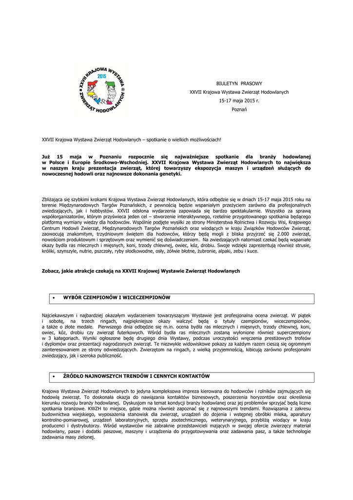 BIULETYN PRASOWY XXVII Krajowa Wystawa Zwierząt Hodowlanych 15-17 maja 2015 r. Poznań XXVII Krajowa Wystawa Zwierząt Hodowlanych – spotkanie o wielkich możliwościach! Już 15 maja w Poznaniu rozpocznie się najważniejsze spotkanie dla branży hodowlanej w Polsce i Europie Środkowo-Wschodniej. XXVII Krajowa Wystawa Zwierząt Hodowlanych to największa w naszym kraju prezentacja zwierząt, której towarzyszy ekspozycja maszyn i urządzeń służących do nowoczesnej hodowli oraz najnowsze dokonania genetyki. Zbliżająca się szybkimi krokami Krajowa Wystawa Zwierząt Hodowlanych, która odbędzie się w dniach 15-17 maja 2015 roku na terenie Międzynarodowych Targów Poznańskich, z pewnością będzie wspaniałym przeżyciem zarówno dla profesjonalnych zwiedzających, jak i hobbystów. XXVII odsłona wydarzenia zapowiada się bardzo spektakularnie. Wszystko za sprawą współorganizatorów, którym przyświeca jeden cel – stworzenie interaktywnego, rzetelnie przygotowanego spotkania będącego platformą wymiany wiedzy dla hodowców. Wspólnie podjęte wysiłki ze strony Ministerstwa Rolnictwa i Rozwoju Wsi, Krajowego Centrum Hodowli Zwierząt, Międzynarodowych Targów Poznańskich oraz wiodących w kraju Związków Hodowców Zwierząt, zaowocują znakomitym, trzydniowym świętem dla hodowców, którzy będą mogli z bliska przyjrzeć się 2.000 zwierząt, nowościom produktowym i sprzętowym oraz wymienić się doświadczeniem. Na zwiedzających natomiast czekać będą wspaniałe okazy bydła ras mlecznych i mięsnych, koni, trzody chlewnej, owiec, kóz, drobiu. Swoje wdzięki zaprezentują również strusie, króliki, szynszyle, nutrie, pszczoły, ryby słodkowodne, osły, żółwie błotne, żubronie, alpaki, zebu i kuce. Zobacz, jakie atrakcje czekają na XXVII Krajowej Wystawie Zwierząt Hodowlanych WYBÓR CZEMPIONÓW I WICECZEMPIONÓW Najciekawszym i najbardziej okazałym wydarzeniem towarzyszącym Wystawie jest profesjonalna ocena zwierząt. W piątek i sobotę, na trzech ringach, najpiękniejsze okazy walczyć będą o tytuły czempionów, wiceczempionów, a także o złote medale. Pierwszego dnia odbędzie się m.in. ocena bydła ras mlecznych i mięsnych, trzody chlewnej, koni, owiec, kóz, drobiu czy zwierząt futerkowych. Wśród bydła ras mlecznych zostaną wyłonione również superczempiony w 3 kategoriach. Wyniki ogłoszone będę drugiego dnia Wystawy, podczas uroczystości wręczenia prestiżowych trofeów i dyplomów oraz prezentacji nagrodzonych zwierząt. Te niezwykle widowiskowe pokazy za każdym razem cieszą się ogromnym zainteresowaniem ze strony odwiedzających. Zwierzętom na ringach, z wielką przyjemnością, kibicują zarówno profesjonalni zwiedzający, jak i szeroka publiczność. ŹRÓDŁO NAJNOWSZYCH TRENDÓW I CENNYCH KONTAKTÓW Krajowa Wystawa Zwierząt Hodowlanych to jedyna kompleksowa impreza kierowana do hodowców i rolników zajmujących się hodowlą zwierząt. To doskonała okazja do nawiązania kontaktów biznesowych, poszerzenia horyzontów oraz określenia kierunku rozwoju branży hodowlanej. Dyskusjom na temat kondycji branży hodowlanej oraz jej problemów sprzyjać będą liczne spotkania branżowe. KWZH to miejsce, gdzie można również zapoznać się z najnowszymi trendami. Rozwiązania z zakresu budownictwa wiejskiego, wyposażenia stanowisk dla zwierząt, urządzeń do dojenia i wstępnej obróbki mleka, aparatury kontrolno-pomiarowej, urządzeń laboratoryjnych, sprzętu zootechnicznego, weterynaryjnego, przybliżą wiodący w kraju producenci i dystrybutorzy. Wśród wystawców nie zabraknie przedstawicieli mających w swojej ofercie zwierzęcy materiał hodowlany, pasze i dodatki paszowe, maszyny i urządzenia do przygotowywania oraz zadawania pasz, a także technologie zadawania masy zielonej. UROCZYSTE WRĘCZENIA I SEMINARIA Konsultacje na temat zachowania zagrożonych zasobów genetycznych zwierząt w rolnictwie poprowadzi Instytut Zootechniki Państwowy Instytut Badawczy, doradztwem w zakresie hodowli i produkcji świń zajmie się Polski Związek Hodowców i Producentów Trzody Chlewnej POLSUS. Podczas Wystawy odbędzie się także seminarium z okazji 40 lat oceny pszczół w Polsce, którego organizatorem jest Krajowe Centrum Hodowli Zwierząt, VI Edycja Konkursu na Fermę i Hodowcę Bydła Mlecznego i Mięsnego Roku 2014, którą poprowadzi Wielkopolskie Wydawnictwo Rolnicze, obchody 20-lecia Polskiej Federacji Hodowców Bydła i Producentów Mleka, wręczenie Pucharu Ministra Rolnictwa i Rozwoju Wsi dla Ośrodka Hodowli Zarodowej „Głogówek” za całokształt osiągnięć w hodowli bydła ras mlecznych, wręczenie Pucharu Dyrektora Krajowego Centrum Hodowli Zwierząt dla najpiękniejszej pierwiastki PHF odmiany RW, wręczenie Statuetek Dyrektora Instytutu Zootechniki Państwowego Instytutu Badawczego za wkład w ochronę i popularyzację rodzimych ras zwierząt gospodarskich w celu zachowania cennej bioróżnorodności dla przyszłych pokoleń. BRANŻOWE SPOTKANIA Program wydarzeń wzbogacą również porady z zakresu dietetyki na temat wieprzowiny i jej miejsca w zdrowej diecie, konferencje „Co oferuje producentom trzody chlewnej PROW na lata 2014-2020”, „Innowacyjne rozwiązania w chowie i hodowli trzody chlewnej”, degustacja wyrobów z wieprzowiny, a także spotkanie przedstawicieli Ministerstwa Rolnictwa i Rozwoju Wsi, Międzynarodowych Targów Poznańskich, Krajowego Centrum Hodowli Zwierząt oraz Instytutu Zootechniki Państwowego Instytutu Badawczego z hodowcami, któremu towarzyszyć będzie uroczyste wręczenie odznaczeń resortowych. Interesująco zapowiadają się dwa seminaria, które poprowadzą eksperci z czasopisma top agrar Polska. Grzegorz Ignaczewski przybliży temat funduszy na rozwój produkcji mleka i bydła opasowego z PROW 2014–2020. O nowoczesnych technologiach utrzymania bydła opowie Ryszard Lesiakowski. TURNIEJE, INTEKATYNE POKAZY DLA DZIECI XXVII Krajowa Wystawa Zwie