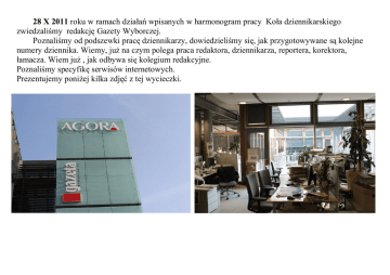 28 X 2011 roku w ramach działań wpisanych w harmonogram pracy Koła dziennikarskiego zwiedzaliśmy redakcję Gazety Wyborczej. Poznaliśmy od podszewki pracę dziennikarzy, dowiedzieliśmy się, jak przygotowywane są kolejne numery dziennika. Wiemy, już na czym polega praca redaktora, dziennikarza, reportera, korektora, łamacza. Wiem już , jak odbywa się kolegium redakcyjne. Poznaliśmy specyfikę serwisów internetowych. Prezentujemy poniżej kilka zdjęć z tej wycieczki.