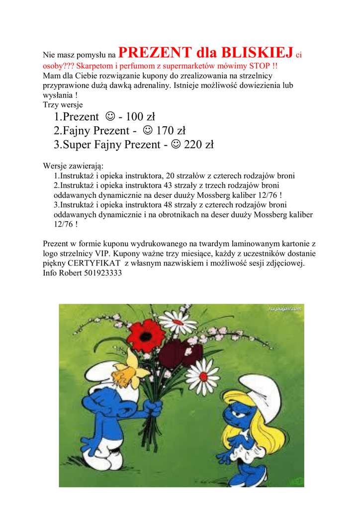 PREZENT dla BLISKIEJ Nie masz pomysłu na ci osoby??? Skarpetom i perfumom z supermarketów mówimy STOP !! Mam dla Ciebie rozwiązanie kupony do zrealizowania na strzelnicy przyprawione dużą dawką adrenaliny. Istnieje możliwość dowiezienia lub wysłania ! Trzy wersje 1.Prezent - 100 zł 2.Fajny Prezent - 170 zł 3.Super Fajny Prezent - 220 zł Wersje zawierają: 1.Instruktaż i opieka instruktora, 20 strzałów z czterech rodzajów broni 2.Instruktaż i opieka instruktora 43 strzały z trzech rodzajów broni oddawanych dynamicznie na deser duuży Mossberg kaliber 12/76 ! 3.Instruktaż i opieka instruktora 48 strzały z czterech rodzajów broni oddawanych dynamicznie i na obrotnikach na deser duuży Mossberg kaliber 12/76 ! Prezent w formie kuponu wydrukowanego na twardym laminowanym kartonie z logo strzelnicy VIP. Kupony ważne trzy miesiące, każdy z uczestników dostanie piękny CERTYFIKAT z własnym nazwiskiem i możliwość sesji zdjęciowej. Info Robert 501923333