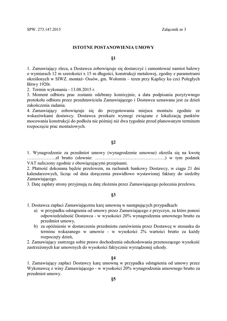 Załącznik nr 3 SPW. 273.147.2015 ISTOTNE POSTANOWIENIA UMOWY §1 1. Zamawiający zleca, a Dostawca zobowiązuje się dostarczyć i zamontować namiot halowy o wymiarach 12 m szerokości x 15 m długości, konstrukcji metalowej, zgodny z parametrami określonych w SIWZ. montaż- Ossów, gm. Wołomin – teren przy Kaplicy ku czci Poległych Bitwy 1920r. 2. Termin wykonania - 13.08.2015 r. 3. Moment odbioru prac zostanie odebrany komisyjnie, a data podpisania pozytywnego protokołu odbioru przez przedstawiciela Zamawiającego i Dostawca uznawana jest za dzień zakończenia zadania. 4. Zamawiający zobowiązuje się do przygotowania miejsca montażu zgodnie ze wskazówkami dostawcy. Dostawca przekaże wymogi związane z lokalizacją punktów mocowania konstrukcji do podłoża nie później niż dwa tygodnie przed planowanym terminem rozpoczęcie prac montażowych. §2 1. Wynagrodzenie za przedmiot umowy (wynagrodzenie umowne) określa się na kwotę ……………….zł brutto (słownie: ……………………………………….) w tym podatek VAT naliczony zgodnie z obowiązującymi przepisami. 2. Płatność dokonana będzie przelewem, na rachunek bankowy Dostawcy, w ciągu 21 dni kalendarzowych, licząc od dnia doręczenia prawidłowo wystawionej faktury do siedziby Zamawiającego. 3. Datę zapłaty strony przyjmują za datę złożenia przez Zamawiającego polecenia przelewu. §3 1. Dostawca zapłaci Zamawiającemu karę umowną w następujących przypadkach: a) w przypadku odstąpienia od umowy przez Zamawiającego z przyczyn, za które ponosi odpowiedzialność Dostawca - w wysokości 20% wynagrodzenia umownego brutto za przedmiot umowy, b) za opóźnienie w dostarczeniu przedmiotu zamówienia przez Dostawcę w stosunku do terminu wskazanego w umowie - w wysokości 2% wartości brutto za każdy rozpoczęty dzień, 2. Zamawiający zastrzega sobie prawo dochodzenia odszkodowania przenoszącego wysokość zastrzeżonych kar umownych do wysokości faktycznie wyrządzonej szkody. §4 1. Zamawiający zapłaci Dostawcy karę umowną w przypadku odstąpienia od umowy przez Wykonawcę z winy Zamawiającego - w wysokości 20% wynagrodzenia umownego brutto za przedmiot umowy. §5 1. Jeżeli w toku czynności odbioru zostaną stwierdzone wady Zamawiający zawiadomi Dostawcę o wadach przedmiotu umowy pocztą elektroniczną, faxem lub pisemnie wg własnego uznania. 2. W przypadku o którym mowa w ust. 1 Dostawca zobowiązany jest nieodpłatnie w wyznaczonym przez Zamawiającego terminie dokonać napraw lub wymiany elementów wadliwych. §6 1. Wszelkie zmiany i uzupełnienia niniejszej umowy nastąpić mogą jedynie w formie pisemnej pod rygorem nieważności, na podstawie aneksu podpisanego przez każdą ze stron. 2. W sprawach nieuregulowanych w niniejszej umowie mają zastosowanie właściwe przepisy prawa. 3. Ewentualne spory między stronami rozstrzyga sąd właściwy miejscowo dla siedziby Zamawiającego. 4. Niniejsza umowa została sporządzona w trzech jednobrzmiących egzemplarzach, z czego dwa egzemplarze przeznaczone są dla Zamawiającego, jeden egzemplarz dla Dostawcy. ZAMAWIAJĄCY DOSTAWCA: Akceptujemy istotne postanowienia umowy: Miejscowość .................................................. dnia ....................................... roku ........................................................................ (pieczęć i podpis osoby uprawnionej do składania oświadczeń woli w imieniu wykonawcy)
