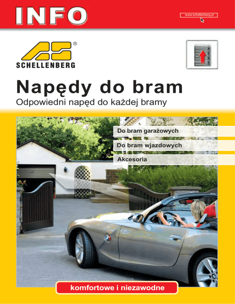 www.schellenberg.pl Napędy do bram Odpowiedni napęd do każdej bramy Do bram garażowych Do bram wjazdowych Akcesoria komfortowe i niezawodne Napędy do bram Odpowiedni napęd do Twojej bramy Asortyment napędów do bram firmy Schellenberg zawiera odpowiednie napędy do wszystkich rodzajów bram garażowych i wjazdowych oraz obszerną paletę akcesoriów. Napędy DRIVE do bram garażowych stanowią idealne rozwiązanie dla bram wahadłowych i panelowych. Do bram wjazdowych polecamy: napędy TWIN do bram skrzydłowych oraz napędy SLIDE do bram przesuwnych. Wybierając napędy Schellenberg decydujecie się Państwo na produkt o sprawdzonej, wysokiej jakości. Wytrzymałe i energooszczędne silniki napędów posiadają 2 lata gwarancji. W naszej ofercie znajdą Państwo oryginalne części zamienne i akcesoria. Napędy Schellenberg są proste i szybkie w montażu, a w razie trudności technicznych nasza infolinia służy Państwu pomocą. d Napę wych arażo g m a do br Strona 2 Napędy do bram Strona 4 Napędy do bram garażowych - DRIVE 500S, napęd do bram wahadłowych - DRIVE 600S, napęd do bram panelowych i wahadłowych - DRIVE 800S, napęd do podwójnych bram garażowych, wahadłowych i panelowych Strona 10 Napędy do bram wjazdowych - BASIC, napęd do bram skrzydłowych - TWIN 4000, napęd do bram skrzydłowych - TWIN 5000, napęd do szerokich bram skrzydłowych - SLIDE 5000, napęd do bram przesuwnych Strona 17 Akcesoria - Elementy sterujące i wspomagające obsługę napędów do bram h łowyc skrzyd m a r do b Napęd Napęd do bram przesuwnych Strona 3 Napędy do bram garażowych Komfort i wysoka, niemiecka jakość Wygodna obsługa za pomocą pilota bez potrzeby wysiadania z samochodu jest szczególnie przydatna przy złej pogodzie i w nocy. Nie pozwolimy Państwu stać w zimnie i deszczu. Napędy Schellenberg to także większe bezpieczeństwo dla całej rodziny. Utrudniają sforsowanie bramy od zewnątrz przez co stanowią dodatkową ochronę przed włamaniem. Dlaczego napęd do bramy DRIVE? Prześwit Włącznik bezpieczeństwa Awaryjne otwieranie wymaga jedynie 3,5 cm prześwitu pomiędzy bramą a sufitem. Są doskonałym rozwiązaniem do garaży gotowych. automatyczny włącznik bezpieczeństwa zatrzymuje ruch bramy przy napotkaniu bramy na przeszkodę. pozwala na obsługę ręczną bramy w przypadku braku prądu. Wtyczka do prądu Elektronika i oświetlenie Mocowanie na zawiasie łatwe i szybkie podłączenie do prądu przy pomocy wtyczki. Każdy napęd DRIVE posiada kabel o dł. 0,5 m razem z wtyczką. duża, uchylna pokrywa umożliwia łatwy dostęp do płytki sterującej. Dzięki dodatkowemu oświetleniu płytka jest lepiej widoczna. szyna prowadząca mocowana jest z przodu przy pomocy zawiasów. Rozwiązanie to umożliwia montaż jednoosobowy. Strona 4 Napędy do bram garażowych Podstawowe informacje Napęd do bram garażowych jest mocowany na suficie w tylniej części garażu. Z przodu, na bramie garażowej należy przykręcić kątownik mocujący. Brama wprawiana jest w ruch za pomocą pilota poprzez łańcuch zainstalowany w szynie prowadzącej. Dlatego właśnie napędy do bram DRIVE mają zastosowanie dla prawie każdego rodzaju bramy. Najczęściej spotykanym rodzajem bramy jest brama wahadłowa. Zaletą tej bramy jest wytrzymała, lekka i stosunkowo tania konstrukcja. Do tego typu bram przeznaczone są wszystkie napędy DRIVE. Brama panelowa w budowie przypomina roletę. Składa się z wielu połączonych ze sobą profili, które poruszają się w szynach prowadzących. Brama tego typu najczęściej montowana jest w sytuacji ograniczonej powierzchni. Do bram panelowych polecamy Państwu napędy Brama wahadłowa. Brama panelowa. DRIVE 600S i DRIVE 800S. Prosty montaż, który zajmuje ok. 2 godz. Złożyć szyny Zamontować łańcuch Nałożyć głowicę Przymocować szynę do nadproża, przód Przymocować głowicę do sufitu, tył Przykręcić skrzydło bramy Zaprogramować napęd Zaprogramować pilota ż krok monta y t s o r p 250 cm 320 cm Porzebne narzędzia: Śruby montażowe do kątownika mocującego nie są załączone w zestawie, ponieważ różnią się one w zależności od rodzaju bramy. Strona 5 ku po kro Napędy do bram garażowych Napędy do bram garażowych Wysokiej jakości napędy do bram garażowych wahadłowych i panelowych, z pełnym wyposażeniem - wyłącznik bezpieczeństwa przy napotkaniu przeszkody, automatyka oftstart / Softstop Softstart - prosty montaż jednoosobowy - automatyczne nastawienie siły ciągu i punktów krańcowych - otwieranie awaryjne wewnętrzne i zewnętrzne, do ręcznej obsługi ramy w przypadku braku prądu w modelach DRIVE 600S i DRIVE 800S bramy - wytrzymały, łatwy w obsłudze, ciągły łańcuch napędowy - z pilotem i automatycznym oświetleniem Napędy do bram garażowych serii DRIVE: do bram wahadłowych i panelowych do bram wahadłowych i panelowych 80 / 800 60 / 600 50 / 500 Max. powierzchnia bramy* (m²) 10,0 6,0 5,0 Max. długość pracy szyny (cm) 250 250 210 Długość zestawu (cm) 320 320 275 10 10 5 - - - - - - Otwieranie awaryjne, od zewnątrz 2x 2x 1x Pilot 2x 2x - Włącznik stacjonarny 1x Max. siła ciągu* (kg/N) Oświetlenie (W) do bram wahadłowych Automatyka Softstart / Softstop Ustawienia krańcowe Wyłącznik bezpieczeństwa Automatyczne nastawienie siły ciągu Gwarancja 2 2 * max. siła ciągu i powierzchnia bramy nie mogą być przekraczane Strona 6 Napędy do bram garażowych ocny m r e p Su ! 2 Napęd do podwójnych bram garażowych, wahadłowych i panelowych, max. siła ciągu 80 kg - wyłącznik bezpieczeństwa przy napotkaniu przeszkody, automatyka Softstart / Softstop - prosty montaż jednoosobowy - automatyczne nastawienie siły ciągu i punktów krańcowych - otwieranie awaryjne wewnętrzne i zewnętrzne do ręcznej obsługi bramy w przypadku braku prądu - wytrzymały, łatwy w obsłudze, ciągły łańcuch napędowy - z 2 pilotami, automatycznym oświetleniem i włącznikiem