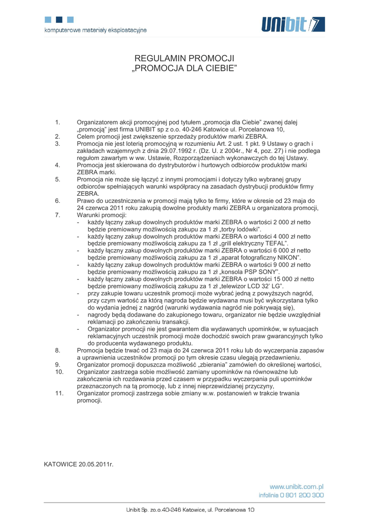 REGULAMIN PROMOCJI „PROMOCJA DLA CIEBIE” 1. 2. 3. 4. 5. 6. 7. 8. 9. 10. 11. Organizatorem akcji promocyjnej pod tytułem „promocja dla Ciebie” zwanej dalej „promocją” jest firma UNIBIT sp z o.o. 40-246 Katowice ul. Porcelanowa 10, Celem promocji jest zwiększenie sprzedaży produktów marki ZEBRA. Promocja nie jest loterią promocyjną w rozumieniu Art. 2 ust. 1 pkt. 9 Ustawy o grach i zakładach wzajemnych z dnia 29.07.1992 r. (Dz. U. z 2004r., Nr 4, poz. 27) i nie podlega regułom zawartym w ww. Ustawie, Rozporządzeniach wykonawczych do tej Ustawy. Promocja jest skierowana do dystrybutorów i hurtowych odbiorców produktów marki ZEBRA marki. Promocja nie może się łączyć z innymi promocjami i dotyczy tylko wybranej grupy odbiorców spełniających warunki współpracy na zasadach dystrybucji produktów firmy ZEBRA. Prawo do uczestniczenia w promocji mają tylko te firmy, które w okresie od 23 maja do 24 czerwca 2011 roku zakupią dowolne produkty marki ZEBRA u organizatora promocji, Warunki promocji: - każdy łączny zakup dowolnych produktów marki ZEBRA o wartości 2 000 zł netto będzie premiowany możliwością zakupu za 1 zł „torby lodówki”. - każdy łączny zakup dowolnych produktów marki ZEBRA o wartości 4 000 zł netto będzie premiowany możliwością zakupu za 1 zł „grill elektryczny TEFAL”. - każdy łączny zakup dowolnych produktów marki ZEBRA o wartości 6 000 zł netto będzie premiowany możliwością zakupu za 1 zł „aparat fotograficzny NIKON”. - każdy łączny zakup dowolnych produktów marki ZEBRA o wartości 9 000 zł netto będzie premiowany możliwością zakupu za 1 zł „konsola PSP SONY”. - każdy łączny zakup dowolnych produktów marki ZEBRA o wartości 15 000 zł netto będzie premiowany możliwością zakupu za 1 zł „telewizor LCD 32’ LG”. - przy zakupie towaru uczestnik promocji może wybrać jedną z powyższych nagród, przy czym wartość za którą nagroda będzie wydawana musi być wykorzystana tylko do wydania jednej z nagród (warunki wydawania nagród nie pokrywają się), - nagrody będą dodawane do zakupionego towaru, organizator nie będzie uwzględniał reklamacji po zakończeniu transakcji. - Organizator promocji nie jest gwarantem dla wydawanych upominków, w sytuacjach reklamacyjnych uczestnik promocji może dochodzić swoich praw gwarancyjnych tylko do producenta wydawanego produktu. Promocja będzie trwać od 23 maja do 24 czerwca 2011 roku lub do wyczerpania zapasów a uprawnienia uczestników promocji po tym okresie czasu ulegają przedawnieniu. Organizator promocji dopuszcza możliwość „zbierania” zamówień do określonej wartości, Organizator zastrzega sobie możliwość zamiany upominków na równoważne lub zakończenia ich rozdawania przed czasem w przypadku wyczerpania puli upominków przeznaczonych na tą promocję, lub z innej nieprzewidzianej przyczyny, Organizator promocji zastrzega sobie zmiany w.w. postanowień w trakcie trwania promocji. KATOWICE 20.05.2011r.