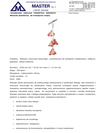 Wieszak plastikowy do transportu mięsa. Produktu: Wieszak z tworzywa sztucznego , przeznaczony do transportu /wieprzowiny, cielęciny, jagnięcia , sekcja wołowiny Wymiary: 1030 mm (h) * 22-62 mm (szer.) * 12 mm (d) Waga: 220 gram Obciążenia: maksymalnie 150 kg Liczba wycięcia: 12 Kolor: biały Wieszak został opracowany do praktycznego zastosowania w systemach obsługi. Jest wykonany z tworzywa sztucznego do zawieszania mięsa. Znacznie zmniejsza koszty magazynowania i transportu wewnętrznego i zewnętrznego, przy jednoczesnym zagwarantowaniu jakości mięsa i poprawy warunków pracy. Łatwy do utrzymania w czystości o mocnej i prostej konstrukcji. Wieszak wykonany jest z białego polipropylenu. Daje znaczne oszczędności w czasie i przestrzeni, zarówno w masarni i dziale wysyłki oraz transporcie powrotnym • bardzo niska cena zakupu • niższe koszty pracy • obniżenie kosztów transportu • wyższa produktywność • higieniczny do recyklingu • ergonomiczny i bezpieczny • przeznaczony do Eurosystemu, kompatybilny z innymi systemami