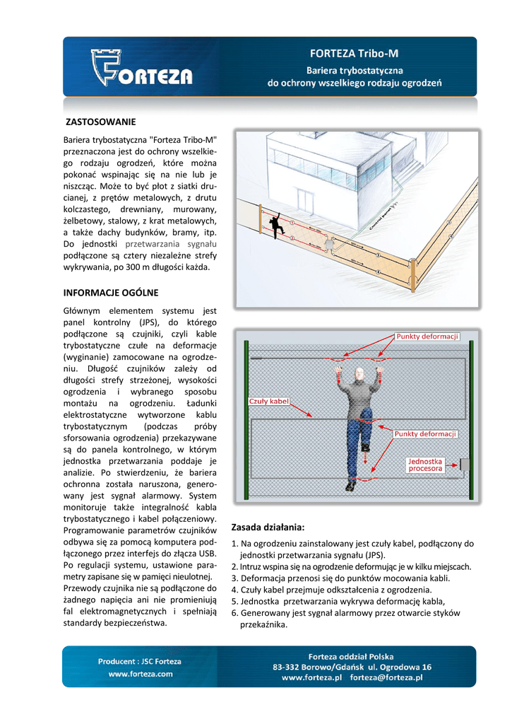 ZASTOSOWANIE Bariera trybostatyczna "Forteza Tribo-M" przeznaczona jest do ochrony wszelkiego rodzaju ogrodzeo, które można pokonad wspinając się na nie lub je niszcząc. Może to byd płot z siatki drucianej, z prętów metalowych, z drutu kolczastego, drewniany, murowany, żelbetowy, stalowy, z krat metalowych, a także dachy budynków, bramy, itp. Do jednostki przetwarzania sygnału podłączone są cztery niezależne strefy wykrywania, po 300 m długości każda. INFORMACJE OGÓLNE Głównym elementem systemu jest panel kontrolny (JPS), do którego podłączone są czujniki, czyli kable trybostatyczne czułe na deformacje (wyginanie) zamocowane na ogrodzeniu. Długośd czujników zależy od długości strefy strzeżonej, wysokości ogrodzenia i wybranego sposobu montażu na ogrodzeniu. Ładunki elektrostatyczne wytworzone kablu trybostatycznym (podczas próby sforsowania ogrodzenia) przekazywane są do panela kontrolnego, w którym jednostka przetwarzania poddaje je analizie. Po stwierdzeniu, że bariera ochronna została naruszona, generowany jest sygnał alarmowy. System monitoruje także integralnośd kabla trybostatycznego i kabel połączeniowy. Programowanie parametrów czujników odbywa się za pomocą komputera podłączonego przez interfejs do złącza USB. Po regulacji systemu, ustawione parametry zapisane się w pamięci nieulotnej. Przewody czujnika nie są podłączone do żadnego napięcia ani nie promieniują fal elektromagnetycznych i spełniają standardy bezpieczeostwa. Zasada działania: 1. Na ogrodzeniu zainstalowany jest czuły kabel, podłączony do jednostki przetwarzania sygnału (JPS). 2. Intruz wspina się na ogrodzenie deformując je w kilku miejscach. 3. Deformacja przenosi się do punktów mocowania kabli. 4. Czuły kabel przejmuje odkształcenia z ogrodzenia. 5. Jednostka przetwarzania wykrywa deformację kabla, 6. Generowany jest sygnał alarmowy przez otwarcie styków przekaźnika. Zalety systemu "Forteza Tribo-M": Podstawowe cechy techniczne • Szybka i łatwa instalacja, prosta i wygodna obsługa; • Wydajnośd w stosunku do ceny, w porównaniu do innych detektorów. • Można wybrad dowolne długości kabla wykrywającego deformacje. • Łatwe zdalne sterowanie za pomocą oprogramowania komputera. Maksymalna długośd kabla do 300 metrów tryboelektrycznego w jednej strefie Maksymalna długośd chronionego 600 m ogrodzenia dwa boki 2 linii po 300 m Maksymalna wysokośd ogrodzenia do 3,2 m Sposób montażu kabla na ogrodzeniu nylonowe opaski zaciskowe Ilośd wejśd stref jednostki centralnej 4 niezależne strefy Ilośd wyjśd stref jednostki centralnej 4 niezależne przekaźniki Napięcie zasilania 9 do 36 V (DC) Pobór prądu przy napięciu 12 V max. 100 mA Temperatura pracy od -40° C do +50° C Sposób regulacji ustawieo program komputerowy PC Stopieo ochrony obudowy IP-65 Prawdopodobieostwo wykrycia nie mniej niż 95%. sprawcy Zintegrowany zdalny test detektora. Nadaje się do każdego systemu monitoringu i kontroli. Czujnik jest odporny na działanie opadów atmosferycznych, promieniowanie słoneczne, kurz. Produkt jest zgodny z normami europejskimi i posiada znak CE System generuje alarm, jeżeli: • sprawca wspina się na płot. • nastąpi awaria: np. przerwa lub zwarcie czujnika. Czujnik nie generuje fałszywego alarmu w razie: • przejścia do pięciu osób w odległości co najmniej 1 m od ogrodzenia, • ruchu transportu drogowego do 5 ton wzdłuż ogrodzenia w odległości nie mniejszej niż 20 m, • ruchu kolejowego wzdłuż płotu w odległości nie mniejszej niż 100 m, • wiatru wiejącego z prędkością 20 m/s (w porywach do 25 m/s), • opadów atmosferycznych: 40 mm/godz śniegu i gradu (w przeliczeniu na wodę) do 10 mm/h, • pracy nadajników VHF o mocy do 5 W, w odległości nie mniejszej niż 2 m od czujników. • zakłóceo elektromagnetycznych oraz akustycznych w czasie burzy. • pojedynczego mechanicznego uderzenia ogrodzenia, np. kijem, kamieniem, kulą śniegu, itp.