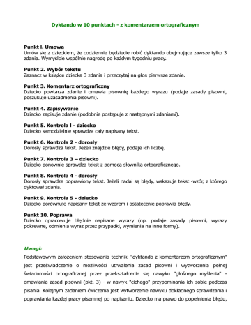 Dyktando w 10 punktach - z komentarzem ortograficznym Punkt l. Umowa Umów się z dzieckiem, że codziennie będziecie robić dyktando obejmujące zawsze tylko 3 zdania. Wymyślcie wspólnie nagrodę po każdym tygodniu pracy. Punkt 2. Wybór tekstu Zaznacz w książce dziecka 3 zdania i przeczytaj na głos pierwsze zdanie. Punkt 3. Komentarz ortograficzny Dziecko powtarza zdanie i omawia pisownię każdego wyrazu (podaje zasady pisowni, poszukuje uzasadnienia pisowni). Punkt 4. Zapisywanie Dziecko zapisuje zdanie (podobnie postępuje z następnymi zdaniami). Punkt 5. Kontrola l - dziecko Dziecko samodzielnie sprawdza cały napisany tekst. Punkt 6. Kontrola 2 - dorosły Dorosły sprawdza tekst. Jeżeli znajdzie błędy, podaje ich liczbę. Punkt 7. Kontrola 3 – dziecko Dziecko ponownie sprawdza tekst z pomocą słownika ortograficznego. Punkt 8. Kontrola 4 - dorosły Dorosły sprawdza poprawiony tekst. Jeżeli nadal są błędy, wskazuje tekst -wzór, z którego dyktował zdania. Punkt 9. Kontrola 5 - dziecko Dziecko porównuje napisany tekst ze wzorem i ostatecznie poprawia błędy. Punkt 10. Poprawa Dziecko opracowuje błędnie napisane wyrazy (np. podaje zasady pisowni, wyrazy pokrewne, odmienia wyraz przez przypadki, wymienia na inne formy). Uwagi: Podstawowym założeniem stosowania techniki "dyktando z komentarzem ortograficznym" jest przeświadczenie o możliwości utrwalenia zasad pisowni i wytworzenia pełnej świadomości ortograficznej przez przekształcenie się nawyku "głośnego myślenia" omawiania zasad pisowni (pkt. 3) - w nawyk "cichego" przypominania ich sobie podczas pisania. Kolejnym zadaniem ćwiczenia jest wytworzenie nawyku dokładnego sprawdzania i poprawiania każdej pracy pisemnej po napisaniu. Dziecko ma prawo do popełnienia błędu, ale nie ma prawa pozostawić go bez poprawienia. Warunkiem uzyskania tych efektów jest wykonywanie omawianego ćwiczenia krótko lecz systematycznie oraz zawarcie umowy z dzieckiem co do czasu pracy (codziennie), liczby dyktowanych zdań (zawsze tej samej) oraz nagrody (po każdym tygodniu ćwiczeń). W ten sposób dziecko nie będzie usiłowało, w tej sprawie, stale z nami negocjować. "Dyktando w 10 -punktach": utrwala znajomość zasad pisowni, wytwarza nawyk stałego przywoływania zasad ortograficznych podczas pisania, wytwarza nawyk stałego sprawdzania napisanego tekstu, a tym samym dziecko ma poczucie odpowiedzialności za napisany tekst. Opracowanie: prof. dr hab. Marta Bogdanowicz