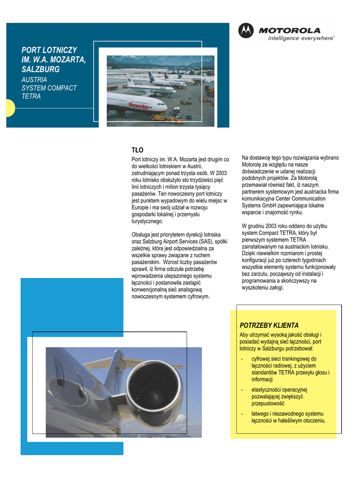 PORT LOTNICZY IM. W.A. MOZARTA, SALZBURG AUSTRIA SYSTEM COMPACT TETRA TŁO Port lotniczy im. W.A. Mozarta jest drugim co do wielkości lotniskiem w Austrii, zatrudniającym ponad trzysta osób. W 2003 roku lotnisko obsłużyło sto trzydzieści pięć linii lotniczych i milion trzysta tysięcy pasażerów. Ten nowoczesny port lotniczy jest punktem wypadowym do wielu miejsc w Europie i ma swój udział w rozwoju gospodarki lokalnej i przemysłu turystycznego. Obsługa jest priorytetem dyrekcji lotniska oraz Salzburg Airport Services (SAS), spółki zależnej, która jest odpowiedzialna za wszelkie sprawy związane z ruchem pasażerskim. Wzrost liczby pasażerów sprawił, iż firma odczuła potrzebę wprowadzenia ulepszonego systemu łączności i postanowiła zastąpić konwencjonalną sieć analogową nowoczesnym systemem cyfrowym. Na dostawcę tego typu rozwiązania wybrano Motorolę ze względu na nasze doświadczenie w udanej realizacji podobnych projektów. Za Motorolą przemawiał również fakt, iż naszym partnerem systemowym jest austriacka firma komunikacyjna Center Communication Systems GmbH zapewniająca lokalne wsparcie i znajomość rynku. W grudniu 2003 roku oddano do użytku system Compact TETRA, który był pierwszym systemem TETRA zainstalowanym na austriackim lotnisku. Dzięki niewielkim rozmiarom i prostej konfiguracji już po czterech tygodniach wszystkie elementy systemu funkcjonowały bez zarzutu, począwszy od instalacji i programowania a skończywszy na wyszkoleniu załogi. POTRZEBY KLIENTA Aby utrzymać wysoką jakość obsługi i posiadać wydajną sieć łączności, port lotniczy w Salzburgu potrzebował: - cyfrowej sieci trankingowej do łączności radiowej, z użyciem standardów TETRA przesyłu głosu i informacji - elastyczności operacyjnej pozwalającej zwiększyć przepustowość - łatwego i niezawodnego systemu łączności w hałaśliwym otoczeniu. PORT LOTNICZY IM. W.A. MOZARTA, SALZBURG AUSTRIA SYSTEM COMPACT TETRA ROWIĄZANIE MOTOROLI Sieć Compact TETRA przewidziana jest dla ośmiu stanowisk i dziesięciu tysięcy użytkowników. System zaimplementowany w Salzburgu składa się obecnie z jednego stanowiska i dwóch przekaźników. W ciągłym użyciu jest dwadzieścia radiotelefonów przewoźnych i sto dwadzieścia radiotelefonów przenośnych należących do wyposażenia obsługi lotniska, w tym kadry menedżerskiej, techników i wewnętrznej służby przeciwpożarowej. Radiotelefonów używa się do koordynacji przylotów, odlotów i przygotowywania samolotów do ponownego lotu. Dzięki zaprogramowanym wiadomościom pracownicy mogą szybko wysłać informację o statusie wejść, przy których aktualnie pracują, co znacznie obniża koszt obsługi naziemnej. Radiotelefony TETRA dzięki zastosowanej w nich technologii kodowania dają dużo lepszą jakość dźwięku od sprzętu analogowego, co wydatnie poprawia komfort pracy użytkowników pracujących w hałaśliwym otoczeniu. Oprócz funkcji typowo telefonicznych, radiotelefony TETRA umożliwiają również przesyłanie informacji, co znacznie ułatwia i przyspiesza pracę. Natychmiastowy kontakt z wybranymi użytkownikami pozwala na szybką reakcję w sytuacjach krytycznych. Naciśnięcie odpowiedniego przycisku informuje o sytuacji nagłej wszystkich użytkowników niezależnie od pracy, jaką akurat wykonują za pośrednictwem radiotelefonu. Funkcja łączności grupowej pozwala na szybki kontakt pomiędzy pracownikami. Jednym z powodów, dla których Compact TETRA stanowi idealny system łączności dla lotniska jest elastyczność sieci i możliwość jej rozbudowy, dzięki czemu można ją przystosować do zmieniających się warunków pracy. Jedną z możliwości rozpatrywanych obecnie w Salzburgu jest integracja radarowego systemu nadzoru lotów. W niedalekiej przyszłości będzie można zintegrować dowolny system, począwszy od ochrony a skończywszy na służbach przeciwpożarowych. Dzięki wydajności pasma radiowego technologii TETRA lotnisko w Salzburgu mogło zaoszczędzić na kosztach licencji użytkowania częstotliwości. Dodatkowe oszczędności udało się również poczynić dzięki niskiemu poborowi mocy. JEDNYM Z POWODÓW, DLA ZALETY:COMPACT TETRA KTÓRYCH STANOWI IDEALNY SYSTEM większa płynność pracy, co zapewnia ŁĄCZNOŚCI DLAzwiększenie LOTNISKA wydajności JEST ELASTYCZNOŚĆ SIECI I obniżenie dzięki MOŻLIWOŚĆ JEJkosztów ROZBUDOWY, DZIĘKIwiększej CZEMU wydajności MOŻNA JĄ PRZYSTOSOWAĆ DO możliwość zastosowania nowych rozwiązań ZMIENIAJĄCYCH SIĘ w przyszłości WARUNKÓW PRACY. JEDNĄ Z MOŻLIWOŚCI ROZPATRYWANYCH OBECNIE W SALZBURGU JEST INTEGRACJA RADAROWEGO SYSTEMU MOTOROLA i Logo ze Stylizowaną Literą M są zarejestrowane w Urzęcie Patentowym USA. Wszystkie inne nazwy produktów lub usług są własnością ich odpowiednich właścicieli. © Motorola, Inc. 2003