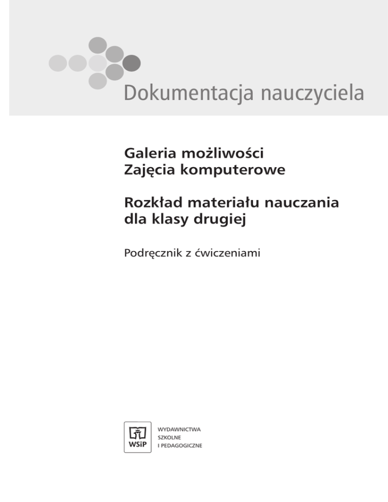 Dokumentacja nauczyciela Galeria możliwości Zajęcia komputerowe Rozkład materiału nauczania dla klasy drugiej Podręcznik z ćwiczeniami WYDAWNICTWA SZKOLNE I PEDAGOGICZNE Autor publikacji: Anna Kulesza © Copyright by Wydawnictwa Szkolne i Pedagogiczne sp. z o.o. Warszawa 2013 Wydanie I (2013) ISBN 978-83-02-13212-4 Opracowanie merytoryczne i redakcyjne: Agnieszka Więckowska (redaktor koordynator), Teresa Nowak (redaktor merytoryczny) Redakcja techniczna: Monika Rudnik-Kulikowska Projekt graficzny: Studio SundayLove Skład i łamanie: Aneta Niezgoda Wydawnictwa Szkolne i Pedagogiczne spółka z ograniczoną odpowiedzialnością 00-807 Warszawa, Aleje Jerozolimskie 96 Tel.: 22 576 25 00 Infolinia: 801 220 555 www.wsip.pl Druk i oprawa: DROGOWIEC-PL Sp. z.o. o., Kielce Publikacja, którą nabyłeś, jest dziełem twórcy i wydawcy. Prosimy, abyś przestrzegał praw, jakie im przysługują. Jej zawartość możesz udostępnić nieodpłatnie osobom bliskim lub osobiście znanym. Ale nie publikuj jej w internecie. Jeśli cytujesz jej fragmenty, nie zmieniaj ich treści i koniecznie zaznacz, czyje to dzieło. A kopiując jej część, rób to jedynie na użytek osobisty. Szanujmy cudzą własność i prawo. Więcej na www.legalnakultura.pl Polska Izba Książki 1, 2 tydzień 3, 4 tydzień 5 tydzień 6 tydzień 7 tydzień 8 tydzień 9 tydzień 3., 4. 5. 6. 7. 8. 9. Tydzień 1., 2. Nr zajęć 6. Edytor grafiki. Zaznacz, Zaznacz dowolny kształt Lekcja powtórzeniowa – praca z komputerem 5. Zapisz jako…, Zapisz 4. Nowy folder 3. Pulpit 2. Menu Start 1. Witamy w klasie 2 Temat z podręcznika Rozkład materiału nauczania dla klasy drugiej Poznajemy narzędzia edytora grafiki: Zaznacz, Zaznacz dowolny kształt Doskonalimy umiejętności tworzenia folderów i zapisywania dokumentów w komputerze Zapisujemy dokument w komputerze Tworzymy nowy folder w komputerze Pulpit komputera Uruchamiamy programy z menu Start Zasady bezpiecznej pracy w pracowni komputerowej. Uruchamianie i wyłączanie komputera Zapis w dzienniku • wie, do czego służą narzędzia: Zaznacz, Zaznacz dowolny kształt w edytorze grafiki • potrafi włączyć zaznaczanie z tłem i bez tła • samodzielnie korzysta z narzędzi: Zaznacz, Zaznacz dowolny kształt • przesuwa zaznaczone fragmenty rysunku • samodzielnie tworzy foldery i zapisuje dokumenty • wie, jak zapisać nowy dokument w pamięci komputera • wie, kiedy stosować polecenie Zapisz • wie, kiedy stosować polecenie Zapisz jako… • wie, co to jest folder • wie, jak utworzyć nowy folder • tworzy i nazywa folder • wie, co to jest pulpit komputera • wie, co to jest okno programu • wie, co to są ikony • rozpoznaje ikony edytora grafiki i edytora tekstu umieszczone na pulpicie • wie, do czego służą przyciski: Minimalizuj, Maksymalizuj, Zamknij w oknie programu • wie, jak uruchomić edytor tekstu i edytor grafiki z menu Start • zna ikony narzędzi edytora grafiki i edytora tekstu • wie, jak się zachowywać w pracowni komputerowej • potrafi prawidłowo uruchomić i wyłączyć komputer Przewidywane osiągnięcia ucznia Galeria możliwości. Zajęcia komputerowe Rozkład materiału nauczania dla klasy drugiej 3 4 10 tydzień 11 tydzień 12 tydzień 13 tydzień 14 tydzień 15 tydzień 16 tydzień 17 tydzień 11. 12. 13. 14. 15. 16. 17. Tydzień 10. Nr zajęć 13. Edytor grafiki. Wybierz kolor 12. Edytor grafiki. Edytuj kolory… 11. Edytor grafiki. Zmniejszanie, powiększanie rysunków 10. Edytor grafiki. Wielokąt Lekcja powtórzeniowa – praca z komputerem 9. Edytor grafiki. Zaokrąglony prostokąt, Cofnij 8. Edytor grafiki. Shift + Linia, Prostokąt, Elipsa 7. Edytor grafiki. Kopiuj, Wklej Temat z podręcznika Poznajemy narzędzie edytora grafiki Wybierz kolor Korzystamy z kolorów niestandardowych w edytorze grafiki Zmniejszamy i powiększamy rysunki w edytorze grafiki Poznajemy narzędzie edytora grafiki Wielokąt Doskonalimy umiejętność posługiwania się poznanymi narzędziami edytora grafiki Poznajemy narzędzie Zaokrąglony prostokąt i polecenie Cofnij edytora grafiki Rysujemy koła, kwadraty i linie proste w edytorze grafiki Poznajemy polecenia edytora grafiki: Kopiuj, Wklej Zapis w dzienniku • wie, do czego służy narzędzie edytora grafiki Wybierz kolor • pobiera kolory z istniejącego obrazka za pomocą narzędzia Wybierz kolor w edytorze grafiki i wypełnia tym kolorem inny obrazek, korzystając z narzędzia Wypełnianie kolorem • wie, jak edytować kolory w edytorze grafiki • stosuje kolory niestandardowe w edytorze grafiki • wie, jak zmniejszyć i powiększyć rysunek w edytorze grafiki • samodzielnie zaznacza rysunek, posługując się narzędziem edytora grafiki Zaznacz, powiększa go i zmniejsza myszą • wie, do czego służy narzędzie edytora grafiki Wielokąt • samodzielnie posługuje się narzędziem Wielokąt • rysuje w edytorze grafiki figury o dowolnej liczbie boków • samodzielnie wybiera kolor linii wielokąta w Polu kolorów edytora grafiki • samodzielnie wybiera grubość linii wielokąta, używając narzędzia Linia • wie, do czego służy edytor grafiki • wie, do czego służą poznane narzędzia i polecenia edytora grafiki: Zaznacz, Zaznacz dowolny kształt, Linia, Elipsa, Prostokąt, Zaokrąglony prostokąt, Kopiuj, Wklej, Cofnij • korzysta z klawisza Shift podczas rysowania kwadratów, kół i linii prostych w edytorze grafiki • wie, do czego służy narzędzie Zaokrąglony prostokąt edytora grafiki • rysuje w edytorze grafiki prostokąty i kwadraty o zaokrąglonych rogach, korzystając z narzędzia Zaokrąglony prostokąt i klawisza Shift • wie, jak anulować trzy ostatnie czynności w edytorze grafiki • samodzielnie korzysta z polecenia Cofnij w edytorze grafiki • wie, do czego służy klawisz Shift w edytorze grafiki • rysuje koła, kwadraty i linie proste za pomocą narzędzi: Elipsa, Prostokąt, Linia w edytorze grafiki i z użyciem klawisza S