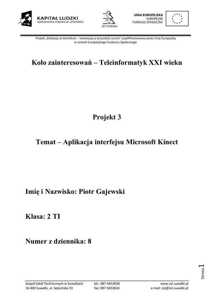 ZST SUWAŁKI Projekt „Edukacja w technikum – inwestycją w przyszłośd ucznia” współfinansowany przez Unię Europejską w ramach Europejskiego Funduszu Społecznego Koło zainteresowań – Teleinformatyk XXI wieku Projekt 3 Temat – Aplikacja interfejsu Microsoft Kinect Imię i Nazwisko: Piotr Gajewski Klasa: 2 TI Strona 1 Numer z dziennika: 8 Zespół Szkół Technicznych w Suwałkach 16-400 Suwałki, ul. Sejneoska 33 tel.: 087-5653630 fax: 087-5653634 www.zst.suwalki.pl e-mail: [email protected] ZST SUWAŁKI Projekt „Edukacja w technikum – inwestycją w przyszłośd ucznia” współfinansowany przez Unię Europejską w ramach Europejskiego Funduszu Społecznego Spis treści Opis aplikacji .................................................................................................................................... 3 2. Sposób podłączenia interfejsu MS Kinect do komputera PC .......................................................... 3 3. Opis stanowiska laboratoryjnego wykorzystywanego w ramach projektu. .................................... 4 4. Zdjęcia stanowiska laboratoryjnego, prezentacja aplikacji. ............................................................ 5 5. Podziękowania............................................................................................................................... 10 6. Literatura ....................................................................................................................................... 10 Strona 2 1. Zespół Szkół Technicznych w Suwałkach 16-400 Suwałki, ul. Sejneoska 33 tel.: 087-5653630 fax: 087-5653634 www.zst.suwalki.pl e-mail: [email protected] ZST SUWAŁKI Projekt „Edukacja w technikum – inwestycją w przyszłośd ucznia” współfinansowany przez Unię Europejską w ramach Europejskiego Funduszu Społecznego 1. Opis aplikacji Tematem mojej pracy jest aplikacja Tic Tac Toe [1] Tic-Tac-Toe (Kółko i Krzyżyk) - gra strategiczna rozgrywana przez dwóch graczy. Gracze obejmują pola na przemian dążąc do objęcia trzech pól w jednej linii, przy jednoczesnym uniemożliwieniu tego samego przeciwnikowi. Pole może byd objęte przez jednego gracza i nie zmienia swego właściciela przez cały przebieg gry. Aplikacja ta wykorzystuje zestaw mikrofonów i kamerę Kinecta, który zaznacza dwie aktualnie grające osoby za pomocą umieszczenia nad ich głowami znaków „X” i „O”. Gracze wybierają pola, na jakich znaleźd się ma przypisany im znak, za pomocą komend głosowych. Na polach wyświetlone są cyfry, które należy wypowiedzied aby wybrad dane pole. 2. Sposób podłączenia interfejsu MS Kinect do komputera PC Rys. 1 Sposób podłączenia Kinect do komputera przez USB Strona 3 Kinect podłączamy do komputera przy pomocy wtyczki USB w standardzie 2.0, natomiast zasilacz podłączamy do gniazdka. Kolejną rzeczą jaką musimy zrobid jest zainstalowanie sterowników, komputer powinien sam znaleźd odpowiednie sterowniki. Po zainstalowaniu sterowników zaleca się ponowne uruchomienie komputera. Zespół Szkół Technicznych w Suwałkach 16-400 Suwałki, ul. Sejneoska 33 tel.: 087-5653630 fax: 087-5653634 www.zst.suwalki.pl e-mail: [email protected] ZST SUWAŁKI Projekt „Edukacja w technikum – inwestycją w przyszłośd ucznia” współfinansowany przez Unię Europejską w ramach Europejskiego Funduszu Społecznego 3. Opis stanowiska laboratoryjnego wykorzystywanego w ramach projektu. Strona 4 Ten schemat blokowy przedstawia stanowisko laboratoryjne wykorzystane podczas pracy w projekcie, widoczne jest tutaj niejako sposób, w jaki urządzenia są między sobą połączone – MS Kinect został podłączony do komputera za pomocą USB, natomiast komputer został podłączony do monitora. Na tym schemacie blokowym widoczna jest karta graficzna komputera, została ona pokazana, ponieważ jest istotnie bardzo ważna, karta graficzna przetwarza sygnał z interfejsu Kinect. Zespół Szkół Technicznych w Suwałkach 16-400 Suwałki, ul. Sejneoska 33 tel.: 087-5653630 fax: 087-5653634 www.zst.suwalki.pl e-mail: [email protected] ZST SUWAŁKI Projekt „Edukacja w technikum – inwestycją w przyszłośd ucznia” współfinansowany przez Unię Europejską w ramach Europejskiego Funduszu Społecznego 4. Zdjęcia stanowiska laboratoryjnego, prezentacja aplikacji. Strona 5 Rys. 2 Stanowisko laboratoryjne, na zdjęciu widoczny jest podłączony do komputera Kinect Zespół Szkół Technicznych w Suwałkach 16-400 Suwałki, ul. Sejneoska 33 tel.: 087-5653630 fax: 087-5653634 www.zst.suwalki.pl e-mail: [email protected] ZST SUWAŁKI Projekt „Edukacja w technikum – inwestycją w przyszłośd ucznia” współfinansowany przez Unię Europejską w ramach Europejskiego Funduszu Społecznego Strona 6 Rys. 3 Na zdjęciu widad planszę do gry oraz rzeczywisty obraz, na którym widoczne są aktualnie grające osoby. Zespół Szkół Technicznych w Suwałkach 16-400 Suwałki, ul. Sejneoska 33 tel.: 087-5653630 fax: 087-5653634 www.zst.suwalki.pl e-mail: [email protected] ZST SUWAŁKI Projekt „Edukacja w technikum – inwestycją w przyszłośd ucznia” współfinansowany przez Unię Europejską w ramach Europejskiego Funduszu Społecznego Strona 7 Rys. 4 Przebieg gry Zespół Szkół Technicznych w Suwałkach 16-400 Suwałki, ul. Sejneoska 33 tel.: 087-5653630 fax: 087-5653634 www.zst.suwalki.pl e-mail: [email protected] ZST SUWAŁKI Projekt „Edukacja w technikum – inwestycją w przyszłośd ucznia” współfinansowany przez Unię Europejską w ramach Europejskiego Funduszu Społecznego Strona 8 Rys. 5 Wygrana gracza „O” Zespół Szkół Technicznych w Suwałkach 16-400 Suwałki, ul. Sejneoska 33 tel.: 087-5653630 fax: 087-5653634 www.zst.suwalki.pl e-mail: [email protected] ZST SUWAŁKI Projekt „Edukacja w technikum – inwestycją w przyszłośd ucznia” współfinansowany przez Unię Europejską w ramach Europejskiego Funduszu Społecznego Strona 9 Rys. 6 Wygran