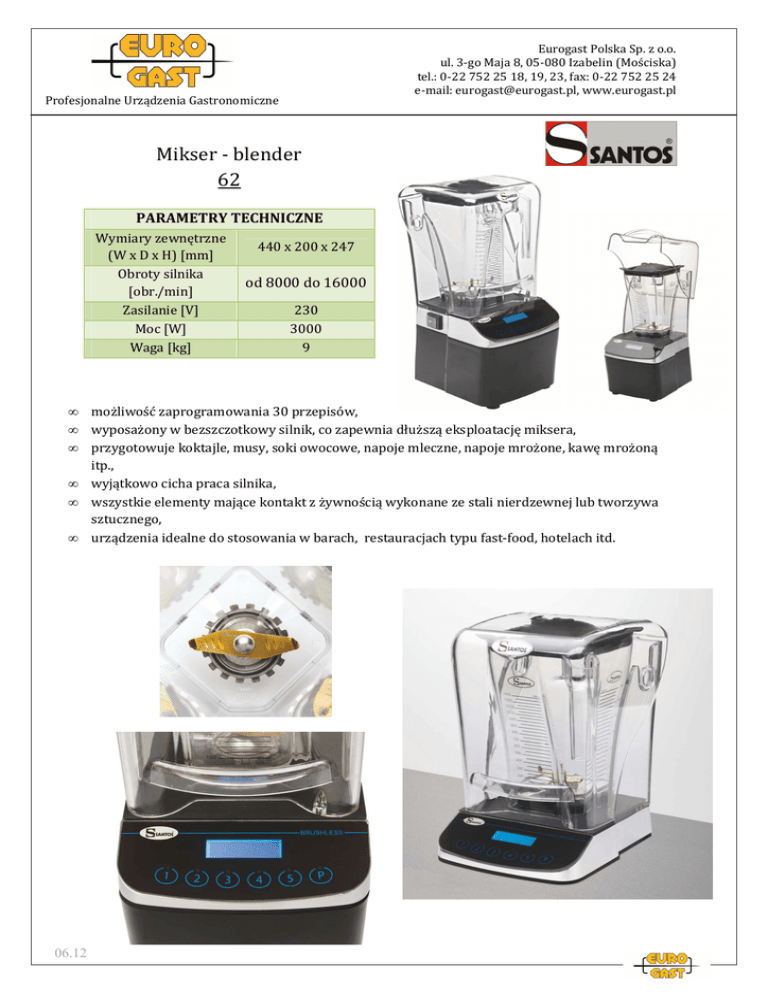Eurogast Polska Sp. z o.o. ul. 3-go Maja 8, 05-080 Izabelin (Mościska) tel.: 0-22 752 25 18, 19, 23, fax: 0-22 752 25 24 e-mail: [email protected], www.eurogast.pl Profesjonalne Urządzenia Gastronomiczne Mikser - blender 62 PARAMETRY TECHNICZNE Wymiary zewnętrzne (W x D x H) [mm] Obroty silnika [obr./min] Zasilanie [V] Moc [W] Waga [kg] • • • • • • 06.12 440 x 200 x 247 od 8000 do 16000 230 3000 9 możliwość zaprogramowania 30 przepisów, wyposażony w bezszczotkowy silnik, co zapewnia dłuższą eksploatację miksera, przygotowuje koktajle, musy, soki owocowe, napoje mleczne, napoje mrożone, kawę mrożoną itp., wyjątkowo cicha praca silnika, wszystkie elementy mające kontakt z żywnością wykonane ze stali nierdzewnej lub tworzywa sztucznego, urządzenia idealne do stosowania w barach, restauracjach typu fast-food, hotelach itd.