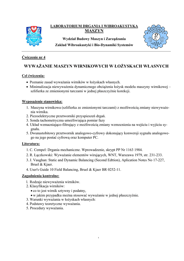 LABORATORIUM DRGANIA I WIBROAKUSTYKA MASZYN Wydział Budowy Maszyn i Zarządzania Zakład Wibroakustyki i Bio-Dynamiki Systemów Ćwiczenie nr 4 WYWAŻANIE MASZYN WIRNIKOWYCH W ŁOŻYSKACH WŁASNYCH Cel ćwiczenia: • Poznanie zasad wyważania wirników w łożyskach własnych. • Minimalizacja niewyważenia dynamicznego obciążenia łożysk modelu maszyny wirnikowej – szlifierka ze zmienionymi tarczami w jednej płaszczyźnie korekcji. Wyposażenie stanowiska: 1. Maszyna wirnikowa (szlifierka ze zmienionymi tarczami) z możliwością zmiany niewyważenia wirnika. 2. Piezoelektryczne przetworniki przyspieszeń drgań. 3. Sonda tachometryczna umożliwiająca pomiar fazy 4. Układ wzmacniająco-filtrujący z możliwością zmiany wzmocnienia na wejściu i wyjściu sygnału. 5. Dwunastobitowy przetwornik analogowo-cyfrowy dokonujący konwersji sygnału analogowego na jego postać cyfrową oraz komputer PC. Literatura: 1. C. Cempel: Drgania mechaniczne. Wprowadzenie, skrypt PP Nr 1163 1984. 2. R. Łączkowski: Wyważanie elementów wirujących, WNT, Warszawa 1979, str. 231-233. 3. J. Vaughan: Static and Dynamic Balancing (Second Edttion), Aplication Notes No 17-227, Bruel & Kjaer. 4. User's Guide 10 Field Balancing, Bruel & Kjaer BR 0252-11. Zagadnienia kontrolne: l. Rodzaje niewyważenia wirników. 2. Klasyfikacja wirników: • co to jest wirnik sztywny i podatny, • w jakim przypadku można stosować wyważanie w jednej płaszczyźnie. 3. Warunki wyważania w łożyskach własnych: 4. Podstawy teoretyczne wyważania. 5. Procedury wyważania. 1 1. WYWAŻANIE JEDNOPŁASZCZYZNOWE MASZYN WIRNIKOWYCH W ŁOŻYSKACH WŁASNYCH - metodą amplitudowo-fazową Metody wyważania maszyn wirnikowych za pomocą równoczesnego pomiaru amplitudy i fazy drgań znalazły szerokie zastosowanie w związku z rozpowszechnieniem elektronicznej aparatury do wyważania. Wyważanie w jednej płaszczyźnie korekcji, tą metodą, można wykonać tylko za pomocą dwukrotnego uruchomienia wirnika: ─ pierwszy raz bez masy próbnej, ─ drugi raz z masą próbną. Przy każdym uruchomieniu wirnika mierzy się w określonym kierunku amplitudę i względne zmiany kąta fazowego drgań łożyska znajdującego się najbliżej płaszczyzny korekcji. Metoda iteracyjna wyważania w łożyskach własnych zastosujemy może być stosowana tylko dla tych wirników, których płaszczyzny korekcji są położone blisko łożysk, ponieważ wtedy wzajemny wpływ płaszczyzn korekcji jest nieduży. Wyważanie metodą iteracyjną rozpoczyna się zawsze od wyważenia wirnika w tej płaszczyźnie korekcji I, która znajduje się w pobliżu łożyska A o największej amplitudzie drgań. Po zamocowaniu w płaszczyźnie I masy korekcyjnej drgania łożyska A znacznie się zmniejszą. Następnie wyważa się wirnik w płaszczyźnie II mierząc drgania łożyska B. Po zamocowaniu masy korekcyjnej w płaszczyźnie II następuje znaczne zmniejszenie amplitudy drgań łożyska B, natomiast zwiększają się drgania łożyska A, ale do wartości mniejszej od tej jaką miało ono przed wyważaniem (wpływ mas korekcyjnych zamocowanych w płaszczyźnie II). Dlatego wykonuje się ponowne wyważanie w płaszczyźnie I, co z kolei powoduje zwiększenie amplitudy drgań łożyska B. Aby temu przeciwdziałać wykonuje się drugi raz wyważanie w płaszczyźnie II. Kolejne wyważania w obu płaszczyznach korekcji powtarza się na przemian tak długo, aż osiągnie dopuszczalną wartość niewyważenia. Procedura postępowania Poniżej opisano procedurę określenia wartości masy korekcyjnej i jej położenia oraz sposób wypełnienia arkusza pomiarowego. 1. Wirnik bez masy próbnej rozpędza się do prędkości wyważania, której wartość w czasie wykonywania pomiarów musi być stała. Korzystając z pomocy programu komputerowego „Monitor r wyważania" należy odczytać amplitudę drgań łożyska A 0 i wartość kąta α0 Wyniki zapisuje się w formularzu pomiarowym. 2. Wartość masy próbnej mp, w g, oblicza się za pomocą wzoru: m ⋅A mp = w 0 r gdzie: mw − masa wirnika w kg, r − promień zamocowania masy próbnej w mm, A0 − amplituda drgań łożyska w μm. (1) Masę próbną mocuje się w płaszczyźnie korekcji pod kątem 0° i uruchamia się wirnik po raz drugi do takiej samej prędkości obrotowej jak za pierwszym uruchomieniem. Przy ustalonej prędkości wyważania odczytujemy amplitudę łożyska A1 i kąt α1 . r r r r Jeżeli 0.2 ⋅ A 0 ≤ A 0 - A1 ≤ 2 ⋅ A 0 , to masę próbną mp przyjęto prawidłowo; w przeciwnym przypadku masę próbną trzeba zmienić. 2 3. Wektory A0 i A1 rysuje się (korzystając z arkusza pomiarowego) w odpowiedniej skali od por r r czątku układu biegunowego. Ich geometryczną różnicą jest wektor R = A 0 - A1 , który równor legle przesunięto do środka układu. Odczytane na rysunku wartości R i ϕ zapisuje się w formularzu pomiarowym. 4. Wartość masy korekcyjnej mk, oblicza się za pomocą wzoru: A mk = m p 0 R a kąt β, pod jakim tę masę należy umieścić, wg wzoru β = α p + α0 − ϕ (2) (3) Ponieważ masę próbną mocuje się pod kątem pod 0°, więc β = α 0 − ϕ 5. Jeżeli po zamocowaniu masy korekcyjnej mk amplituda drgań łożyska nie zmniejszy się co najmniej dziesięciokrotnie, to trzeba wykonać dodatkowe wyważanie. W tym celu po raz trzeci uruchamia się wirnik z zamocowaną masą korekcyjną mk i przy ustalonej prędkości wyważania od- r czytuje się amplitudę łożyska A1d i kąt α1d. W tym przypadku masa korekcyjna mk spełnia rolę masy próbnej, dla której również są słuszne zależności (1) i (2). Wartość poprawionej masy korekcyjnej można obliczyć za pomocą wzoru: A (4) mkd = mk 0 Rd a kąt jej zamocowania w płaszczyźnie korekcji wyznacza się z zależności: (5) βd = β + α 0 − ϕ Wyważanie kończy się umieszczeniem w płaszczyźnie korekcji masy korekcyjnej mkd pod kątem βd, przy czym masę mk. trzeba usunąć z wirnika. 2