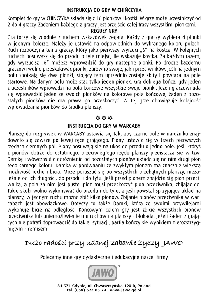 INSTRUKCJA DO GRY W CHI¡CZYKA Komplet do gry w CHI¡CZYKA sk∏ada si´ z 16 pionków i kostki. W grze mo˝e uczestniczyç od 2 do 4 graczy. Zadaniem ka˝dego z graczy jest przejÊcie ca∏ej trasy wszystkimi pionkami. REGU¸Y GRY Gra toczy si´ zgodnie z ruchem wskazówek zegara. Ka˝dy z graczy wybiera 4 pionki w jednym kolorze. Nale˝y je ustawiç na odpowiednich do wybranego koloru polach. Ruch rozpoczyna ten z graczy, który jako pierwszy wyrzuci „6“ na kostce. W kolejnych ruchach posuwasz si´ do przodu o tyle miejsc, ile wskazuje kostka. Za ka˝dym razem, gdy wyrzucisz „6“ mo˝esz wprowadziç do gry nast´pne pionki. Po drodze ka˝demu graczowi wolno przeskakiwaç pionki, zarówno swoje, jak i przeciwników. JeÊli na jednym polu spotkajà si´ dwa pionki, stojàcy tam uprzednio zostaje zbity i powraca na pole startowe. Na danym polu mo˝e staç tylko jeden pionek. Gra dobiega koƒca, gdy jeden z uczestników wprowadzi na pola koƒcowe wszystkie swoje pionki. Je˝eli graczowi uda si´ wprowadziç jeden ze swoich pionków na kolorowe pola koƒcowe, ˝aden z pozosta∏ych pionków nie ma prawa go przeskoczyç. W tej grze obowiàzuje kolejnoÊç wprowadzania pionków do Êrodka planszy. ✽✽✽ INSTRUKCJA DO GRY W WARCABY Plansz´ do rozgrywek w WARCABY ustawia si´ tak, aby czarne pole w naro˝niku znajdowa∏o si´ zawsze po lewej r´ce grajàcego. Piony ustawia si´ w trzech pierwszych rz´dach ciemnych pól. Piony posuwajà si´ na ukos do przodu o jedno pole. JeÊli któryÊ z pionów dotrze do ostatniego, przeciwleg∏ego rz´du planszy przeistacza si´ w tzw. Damk´ i wówczas dla odró˝nienia od pozosta∏ych pionów uk∏ada si´ na nim drugi pion tego samego koloru. Damka w porównaniu ze zwyk∏ym pionem ma znacznie wi´kszà mo˝liwoÊç ruchu i bicia. Mo˝e poruszaç si´ po wszystkich przekàtnych planszy, niezale˝nie od ich d∏ugoÊci, do przodu i do ty∏u. JeÊli przed pionem znajdzie si´ pion przeciwnika, a pola za nim jest puste, pion musi przeskoczyç pion przeciwnika, zbijajàc go. Takie skoki wolno wykonywaç do przodu i do ty∏u, a jeÊli powsta∏ sprzyjajàcy uk∏ad na planszy, w jednym ruchu mo˝na zbiç kilka pionów. Zbijanie pionów przeciwnika w warcabach jest obowiàzkowe. Dotyczy to tak˝e Damki, która ze swoimi przywilejami wykonuje bicie na odleg∏oÊç. Koƒcowym celem gry jest zbicie wszystkich pionów przeciwnika lub uniemo˝liwienie mu ruchów na planszy - blokada. Je˝eli ˝aden z grajàcych nie potrafi doprowadziç do takiej sytuacji, partia koƒczy si´ wynikiem nierozstrzygni´tym - remisem. Du˝o radoÊci przy udanej zabawie ˝yczy JAWO Polecamy inne gry dydaktyczne i edukacyjne naszej firmy 81-571 Gdynia, ul. Chwaszczyƒska 190 D, Poland tel. (058) 624 05 29 www.jawo.gd.pl