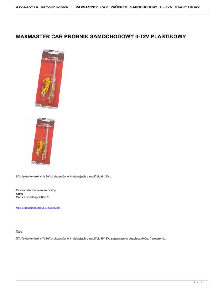 Akcesoria samochodowe : MAXMASTER CAR PRÓBNIK SAMOCHODOWY 6-12V PLASTIKOWY MAXMASTER CAR PRÓBNIK SAMOCHODOWY 6-12V PLASTIKOWY S?u?y do kontroli ci?g?o?ci obwodów w instalacjach o napi?ciu 6-12V... Ocena: Nie ma jeszcze oceny Cena Cena sprzeda?y 2,66 z? Ask a question about this product Opis S?u?y do kontroli ci?g?o?ci obwodów w instalacjach o napi?ciu 6-12V, sprawdzania bezpieczników, ?arówek itp. 1 / 2 Akcesoria samochodowe : MAXMASTER CAR PRÓBNIK SAMOCHODOWY 6-12V PLASTIKOWY Opinie Nikt jeszcze nie recenzowa? tego produktu. 2 / 2 Powered by TCPDF (www.tcpdf.org)