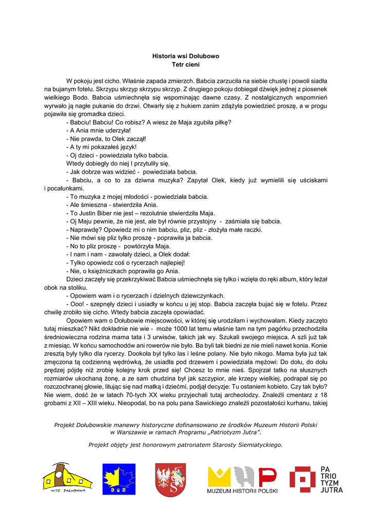 Historia wsi Dołubowo Tetr cieni W pokoju jest cicho. Właśnie zapada zmierzch. Babcia zarzuciła na siebie chustę i powoli siadła na bujanym fotelu. Skrzypu skrzyp skrzypu skrzyp. Z drugiego pokoju dobiegał dźwięk jednej z piosenek wielkiego Bodo. Babcia uśmiechnęła się wspominając dawne czasy. Z nostalgicznych wspomnień wyrwało ją nagłe pukanie do drzwi. Otwarły się z hukiem zanim zdążyła powiedzieć proszę, a w progu pojawiła się gromadka dzieci. - Babciu! Babciu! Co robisz? A wiesz że Maja zgubiła piłkę? - A Ania mnie uderzyła! - Nie prawda, to Olek zaczął! - A ty mi pokazałeś język! - Oj dzieci - powiedziała tylko babcia. Wtedy dobiegły do niej I przytuliły się. - Jak dobrze was widzieć - powiedziała babcia. - Babciu, a co to za dziwna muzyka? Zapytał Olek, kiedy już wymielili się uściskami i pocałunkami. - To muzyka z mojej młodości - powiedziała babcia. - Ale śmieszna - stwierdziła Ania. - To Justin Biber nie jest – rezolutnie stwierdziła Maja. - Oj Maju pewnie, że nie jest, ale był równie przystojny - zaśmiała się babcia. - Naprawdę? Opowiedz mi o nim babciu, pliz, pliz - złożyła małe raczki. - Nie mówi się pliz tylko proszę - poprawiła ja babcia. - No to pliz proszę - powtórzyła Maja. - I nam i nam - zawołały dzieci, a Olek dodał: - Tylko opowiedz coś o rycerzach najlepiej! - Nie, o księżniczkach poprawiła go Ania. Dzieci zaczęły się przekrzykiwać Babcia uśmiechnęła się tylko i wzięła do ręki album, który leżał obok na stoliku. - Opowiem wam i o rycerzach i dzielnych dziewczynkach. - Ooo! - szepnęły dzieci i usiadły w końcu u jej stop. Babcia zaczęła bujać się w fotelu. Przez chwilę zrobiło się cicho. Wtedy babcia zaczęła opowiadać. Opowiem wam o Dołubowie miejscowości, w której się urodziłam i wychowałam. Kiedy zaczęto tutaj mieszkać? Nikt dokładnie nie wie - może 1000 lat temu właśnie tam na tym pagórku przechodziła średniowieczna rodzina mama tata i 3 urwisów, takich jak wy. Szukali swojego miejsca. A szli już tak z miesiąc. W końcu samochodów ani rowerów nie było. Ba byli tak biedni ze nie mieli nawet konia. Konie zresztą były tylko dla rycerzy. Dookoła był tylko las i leśne polany. Nie było nikogo. Mama była już tak zmęczona tą codzienną wędrówką, że usiadła pod drzewem i powiedziała mężowi: Do dołu, do dołu prędzej pójdę niż zrobię kolejny krok przed się! Chcesz to mnie nieś. Spojrzał tatko na słusznych rozmiarów ukochaną żonę, a ze sam chudzina był jak szczypior, ale krzepy wielkiej, podrapał się po rozczochranej głowie, litując się nad matką i dziećmi, podjął decyzje: Tu ostaniem kobieto. Czy tak było? Nie wiem, dość że w latach 70-tych XX wieku przyjechali tutaj archeolodzy. Znaleźli cmentarz z 18 grobami z XII – XIII wieku. Nieopodal, bo na polu pana Sawickiego znaleźli pozostałości kurhanu, takiej Projekt Dołubowskie manewry historyczne dofinansowano ze środków Muzeum Historii Polski w Warszawie w ramach Programu „Patriotyzm Jutra”. Projekt objęty jest honorowym patronatem Starosty Siemiatyckiego. mogiły z podobnego okresu jak ten stary cmentarz. Może tam właśnie została pochowana nasza rodzina? O Dołubowie nie wiemy nic aż do roku 1465 roku. Wtedy to w Dołubowie pojawiają się Wit i Dorota Raczyński, którzy w wiosce fundują pierwszy kościół. W wielu miejscach przeczytacie, ze Wita zwano Łyczko – skąd się to wzięło nikt nie wie, bo w dokumentach Wit mówił o sobie Raczyński albo z Dołubowa. Jaki był Wit? Może duży, może mały, a może okrąglutki? A może był to przystojny pan? Wiadomo, ze Dołubowo ukochał, bo właśnie tutaj razem z żoną Dorotą postawili pierwszy dwór i uformowali przestrzeń wsi. Wit był znanym sędzią, jednak nie nacieszyli się długo byciem razem w Dołubowie. Dorota została wdową. Opłakując męża ufundowała przy kościele altarię, dodatkowy ołtarz. Tu wam powiem w tajemnicy, ze altarią zajmował się ksiądz, którego obowiązkiem było odprawianie 3 mszy w tygodniu, w tym dwóch za zmarłych i jednej za odpuszczenie grzechów i raz do roku egzekwii, odprawianej za zmarłego. W tym czasie na polskim tronie zasiadał Aleksander Jagiellończyk. On to po śmierci Doroty w roku 1501 przekazał Dołubowo Janowi Steczce, kuzynowi Doroty. Oj wielki był to pan, pochodził z litewskiego rodu Talwoszów, a zaradny był i operatywny. Poszerzył majątek i sam piął się po szczeblach kariery urzędniczej, by zostać nadwornym marszałkiem wielkoksiężcy i starostą mińskim. Na potrzeby wojenne miał dostarczać aż 20 koni. A po jego śmierci… No Dołubowo musiało być ważne, skoro sama królowa Bona miała je otrzymać w darze. A ze leżało na terenie Wielkiego Księstwa Litewskiego łatwiej było je przejąć niż w Koronie Polskiej. Podobno Jan Steczko w testamencie zapisał Dołubowo królowej, nawet wieli król Zygmunt I w roku 1528 na sejmie wileńskim „nadał swojej najmilszej żonie Bonie na wieczność dobra Dołubowo w dzierżawie brańskiej wraz ze wsiami Widźgowo, Chrościanka i Filipy ze wszystkimi i każdemi pożytkami do tych dóbr należących”. Dlaczego ostatecznie królowa Bona nie została właścicielką Dołubowa? Nie wiadomo. Ostatecznie majątek trafił w ręce Harynków. Jan, tak mu było na imię, oj wziął się do roboty. Ot taki menager. Dbał o produkcje rolną, wybudował na swoich dobrach młyn – a na ówczesne czasy to był taki ważny zakład przemysłowy na Podlasiu. Młyn powstał w Widźgowie na rzece Czarnej tuż obok Holonek. Okres średniowiecza się kończy, a wkracza na ziemie polskie renesans. I w tym duchu Jan rozmierzył siedzibę dworską. Kontynuował tez prace swojego poprzednika i dzięki ich staraniom w Dołubowie powstał kwaterowy ogród włoski. Musiało być tu pięknie, bo taki ogród oparty jest na ustalaniu harmonijnych proporcji budowli oraz przestrzen