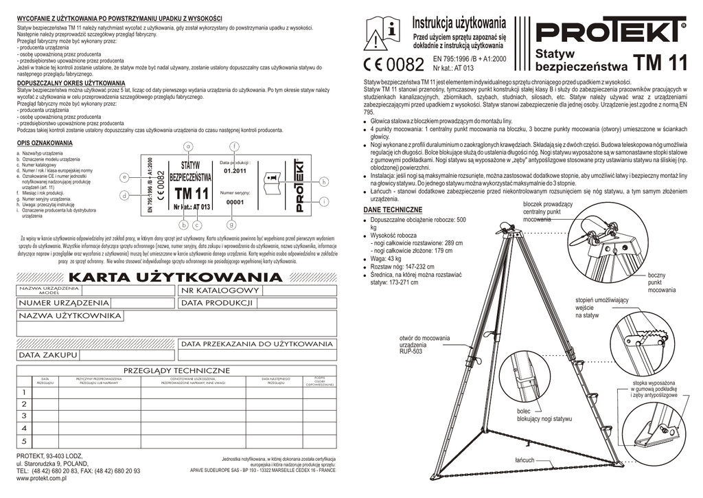 Instrukcja użytkowania WYCOFANIE Z UŻYTKOWANIA PO POWSTRZYMANIU UPADKU Z WYSOKOŚCI Statyw bezpieczeństwa TM 11 należy natychmiast wycofać z użytkowania, gdy został wykorzystany do powstrzymania upadku z wysokości. Następnie należy przeprowadzić szczegółowy przegląd fabryczny. Przegląd fabryczny może być wykonany przez: - producenta urządzenia - osobę upoważnioną przez producenta - przedsiębiorstwo upoważnione przez producenta Jeżeli w trakcie tej kontroli zostanie ustalone, że statyw może być nadal używany, zostanie ustalony dopuszczalny czas użytkowania statywu do następnego przeglądu fabrycznego. Przed użyciem sprzętu zapoznać się dokładnie z instrukcją użytkowania DOPUSZCZALNY OKRES UŻYTKOWANIA Statyw bezpieczeństwa można użytkować przez 5 lat, licząc od daty pierwszego wydania urządzenia do użytkowania. Po tym okresie statyw należy wycofać z użytkowania w celu przeprowadzenia szczegółowego przeglądu fabrycznego. Przegląd fabryczny może być wykonany przez: - producenta urządzenia - osobę upoważnioną przez producenta - przedsiębiorstwo upoważnione przez producenta Podczas takiej kontroli zostanie ustalony dopuszczalny czas użytkowania urządzenia do czasu następnej kontroli producenta. OPIS OZNAKOWANIA f. g. h. i. a Nazwa/typ urządzenia Oznaczenie modelu urządzenia Numer katalogowy Numer / rok / klasa europejskiej normy Oznakowanie CE i numer jednostki notyfikowanej nadzorującej produkcję urządzeń (art. 11) Miesiąc i rok produkcji. Numer seryjny urządzenia. Uwaga: przeczytaj instrukcję Oznaczenie producenta lub dystrybutora urządzenia e d EN 795:1996 /B + A1:2000 a. b. c. d. e. f STATYW BEZPIECZEŃSTWA TM 11 Data produkcji : 01.2011 h Numer seryjny: Nr kat.: AT 013 b c i 00001 g Za wpisy w karcie u¿ytkowania odpowiedzialny jest zak³ad pracy, w którym dany sprzêt jest u¿ytkowany. Karta u¿ytkowania powinna byæ wype³niona przed pierwszym wydaniem sprzêtu do u¿ytkowania. Wszystkie informacje dotycz¹ce sprzêtu ochronnego (nazwa, numer seryjny, data zakupu i wprowadzenia do u¿ytkowania, nazwa u¿ytkownika, informacje dotycz¹ce napraw i przegl¹dów oraz wycofania z u¿ytkowania) musz¹ byæ umieszczone w karcie u¿ytkowania danego urz¹dzenia. Kartê wype³nia osoba odpowiedzialna w zak³adzie pracy za sprzêt ochronny. Nie wolno stosowaæ indywidualnego sprzêtu ochronnego nie posiadaj¹cego wype³nionej karty u¿ytkowania. KARTA U¯YTKOWANIA NAZWA URZ¥DZENIA MODEL NR KATALOGOWY NUMER URZ¥DZENIA DATA PRODUKCJI Statyw bezpieczeństwa EN 795:1996 /B + A1:2000 Nr kat.: AT 013 NAZWA U¯YTKOWNIKA DATA PRZEKAZANIA DO U¯YTKOWANIA DATA ZAKUPU TM 11 Statyw bezpieczeństwa TM 11 jest elementem indywidualnego sprzętu chroniącego przed upadkiem z wysokości. Statyw TM 11 stanowi przenośny, tymczasowy punkt konstrukcji stałej klasy B i służy do zabezpieczenia pracowników pracujących w studzienkach kanalizacyjnych, zbiornikach, szybach, studniach, silosach, etc. Statyw należy używać wraz z urządzeniami zabezpieczającymi przed upadkiem z wysokości. Statyw stanowi zabezpieczenie dla jednej osoby. Urządzenie jest zgodne z normą EN 795. ! Głowica stalowa z bloczkiem prowadzącym do montażu liny. ! 4 punkty mocowania: 1 centralny punkt mocowania na bloczku, 3 boczne punkty mocowania (otwory) umieszczone w ściankach głowicy. ! Nogi wykonane z profili duraluminium o zaokrąglonych krawędziach. Składają się z dwóch części. Budowa teleskopowa nóg umożliwia regulację ich długości. Bolce blokujące służą do ustalenia długości nóg. Nogi statywu wyposażone są w samonastawne stopki stalowe z gumowymi podkładkami. Nogi statywu są wyposażone w „zęby" antypoślizgowe stosowane przy ustawianiu statywu na śliskiej (np. oblodzonej) powierzchni. ! Instalacja: jeśli nogi są maksymalnie rozsunięte, można zastosować dodatkowe stopnie, aby umożliwić łatwy i bezpieczny montaż liny na głowicy statywu. Do jednego statywu można wykorzystać maksymalnie do 3 stopnie. ! Łańcuch - stanowi dodatkowe zabezpieczenie przed niekontrolowanym rozsunięciem się nóg statywu, a tym samym złożeniem urządzenia. bloczek prowadzący DANE TECHNICZNE centralny punkt mocowania ! Dopuszczalne obciążenie robocze: 500 kg ! Wysokość robocza - nogi całkowicie rozstawione: 289 cm - nogi całkowicie złożone: 179 cm ! Waga: 43 kg ! Rozstaw nóg: 147-232 cm ! Średnica, na której można rozstawiać boczny statyw: 173-271 cm punkt mocowania stopień umożliwiający wejście na statyw otwór do mocowania urządzenia RUP-503 PRZEGL¥DY TECHNICZNE DATA PRZEGL¥DU PRZYCZYNY PRZEPROWADZENIA PRZEGL¥DU LUB NAPRAWY ODNOTOWANE USZKODZENIA, PRZEPROWADZONE NAPRAWY, INNE UWAGI DATA NASTÊPNEGO PRZEGL¥DU PODPIS OSOBY ODPOWIEDZIALNEJ stopka wyposażona w gumową podkładkę i zęby antypoślizgowe 1 2 3 bolec blokujący nogi statywu 4 5 PROTEKT, 93-403 LODZ, ul. Starorudzka 9, POLAND, TEL: (48 42) 680 20 83, FAX: (48 42) 680 20 93 www.protekt.com.pl Jednostka notyfikowana, w której dokonana została certyfikacja europejska i która nadzoruje produkcję sprzętu: APAVE SUDEUROPE SAS - BP 193 - 13322 MARSEILLE CEDEX 16 - FRANCE łańcuch INSTALACJA STATYWU ! Wyjmij bolce blokujące z bloczka prowadzącego. ! Umieść linkę urządzenia podnoszącego na bloczku. Przełóż koniec linki przez otwór w głowicy. ! Położyć statyw na płaskiej, stabilnej i twardej powierzchni. Wyciągnąć nogi statywu na żądaną długość i zablokować bolcami blokującymi. ! Ustawić statyw w pozycji pionowej i rozstawić nogi na zewnątrz. ! Upewnić się, że stopki znajdują się na twardym podłożu i mogą wytrzymać obciążenie. ! Wyregulować długość nóg tak, aby głowica znajdowała się w płaszczyźnie poziomej. ! Nogi muszą mieć zawsze tą samą długość. ! Statyw należy ustawić nad otworem, tak by linka robocza znajdowała się mniej więcej w środku otworu. ! Statyw może być stosowany z urządzeniem w