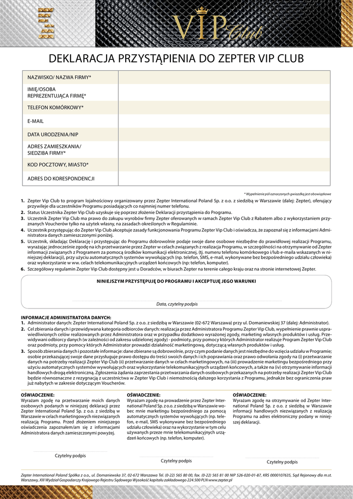 DEKLARACJA PRZYSTĄPIENIA DO ZEPTER VIP CLUB NAZWISKO/ NAZWA FIRMY* IMIĘ/OSOBA REPREZENTUJĄCA FIRMĘ* TELEFON KOMÓRKOWY* E-MAIL DATA URODZENIA/NIP ADRES ZAMIESZKANIA/ SIEDZIBA FIRMY* KOD POCZTOWY, MIASTO* ADRES DO KORESPONDENCJI * Wypełnienie pól oznaczonych gwiazdką jest obowiązkowe 1.Zepter Vip Club to program lojalnościowy organizowany przez Zepter International Poland Sp. z o.o. z siedzibą w Warszawie (dalej: Zepter), oferujący przywileje dla uczestników Programu posiadających co najmniej numer telefonu. 2.Status Uczestnika Zepter Vip Club uzyskuje się poprzez złożenie Deklaracji przystąpienia do Programu. 3. Uczestnik Zepter Vip Club ma prawo do zakupu wyrobów firmy Zepter oferowanych w ramach Zepter Vip Club z Rabatem albo z wykorzystaniem przyznanych Voucherów tylko na użytek własny, na zasadach określonych w Regulaminie. 4. Uczestnik przystępując do Zepter Vip Club akceptuje zasady funkcjonowania Programu Zepter Vip Club i oświadcza, że zapoznał się z informacjami Administratora danych zamieszczonymi poniżej. 5. Uczestnik, składając Deklarację i przystępując do Programu dobrowolnie podaje swoje dane osobowe niezbędne do prawidłowej realizacji Programu, wyrażając jednocześnie zgodę na ich przetwarzanie przez Zepter w celach związanych z realizacja Programu, w szczególności na otrzymywanie od Zepter informacji związanych z Programem za pomocą środków komunikacji elektronicznej, (tj. numeru telefonu komórkowego i/lub e-maila wskazanych w niniejszej deklaracji), przy użyciu automatycznych systemów wywołujących (np. telefon, SMS, e-mail, wykonywane bez bezpośredniego udziału człowieka) oraz wykorzystanie w ww. celach telekomunikacyjnych urządzeń końcowych (np: telefon, komputer). 6.Szczegółowy regulamin Zepter Vip Club dostępny jest u Doradców, w biurach Zepter na terenie całego kraju oraz na stronie internetowej Zepter. NINIEJSZYM PRZYSTĘPUJĘ DO PROGRAMU I AKCEPTUJĘ JEGO WARUNKI Data, czytelny podpis INFORMACJE ADMINISTRATORA DANYCH: 1.Administrator danych: Zepter International Poland Sp. z o.o. z siedzibą w Warszawie (02-672 Warszawa) przy ul. Domaniewskiej 37 (dalej: Administrator). 2.Cel zbierania danych i przewidywana kategoria odbiorców danych: realizacja przez Administratora Programu Zepter Vip Club, wypełnienie prawnie usprawiedliwionych celów realizowanych przez Administratora oraz w przypadku dodatkowo wyrażonej zgody, marketing własnych produktów i usług. Przewidywani odbiorcy danych (w zależności od zakresu udzielonej zgody) - podmioty, przy pomocy których Administrator realizuje Program Zepter Vip Club oraz podmioty, przy pomocy których Administrator prowadzi działalność marketingową, dotyczącą własnych produktów i usług. 3.Sposób zbierania danych i pozostałe informacje: dane zbierane są dobrowolnie, przy czym podanie danych jest niezbędne do wzięcia udziału w Programie; osobie przekazującej swoje dane przysługuje prawo dostępu do treści swoich danych i ich poprawiania oraz prawo odwołania zgody na (i) przetwarzanie danych na potrzeby realizacji Zepter Vip Club (ii) przetwarzanie danych w celach marketingowych, na (iii) prowadzenie marketingu bezpośredniego przy użyciu automatycznych systemów wywołujących oraz wykorzystanie telekomunikacyjnych urządzeń końcowych, a także na (iv) otrzymywanie informacji handlowych drogą elektroniczną. Zgłoszenia żądania zaprzestania przetwarzania danych osobowych przekazanych na potrzeby realizacji Zepter Vip Club będzie równoznaczne z rezygnacją z uczestnictwa w Zepter Vip Club i niemożnością dalszego korzystania z Programu, jednakże bez ograniczenia praw już nabytych w zakresie dotyczącym Voucherów. OŚWIADCZENIE: Wyrażam zgodę na przetwarzanie moich danych osobowych podanych w niniejszej deklaracji przez Zepter International Poland Sp. z o.o. z siedzibą w Warszawie w celach marketingowych niezwiązanych realizacją Programu. Przed złożeniem niniejszego oświadczenia zapoznałem/am się z informacjami Administratora danych zamieszczonymi powyżej. Czytelny podpis OŚWIADCZENIE: Wyrażam zgodę na prowadzenie przez Zepter International Poland Sp. z o.o. z siedzibą w Warszawie wobec mnie marketingu bezpośredniego za pomocą automatycznych systemów wywołujących (np. telefon, e-mail, SMS wykonywane bez bezpośredniego udziału człowieka) oraz na wykorzystanie w tym celu używanych przeze mnie telekomunikacyjnych urządzeń końcowych (np. telefon, komputer). OŚWIADCZENIE: Wyrażam zgodę na otrzymywanie od Zepter International Poland Sp. z o.o. z siedzibą w Warszawie informacji handlowych niezwiązanych z realizacją Programu na adres elektroniczny podany w niniejszej deklaracji. Czytelny podpis Czytelny podpis Zepter International Poland Spółka z o.o., ul. Domaniewska 37, 02-672 Warszawa Tel. (0-22) 565 80 00, fax. (0-22) 565 81 00 NIP 526-020-01-87, KRS 0000107635, Sąd Rejonowy dla m.st. Warszawy, XIII Wydział Gospodarczy Krajowego Rejestru Sądowego Wysokość kapitału zakładowego 224.500 PLN www.zepter.pl
