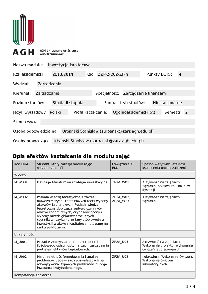 Nazwa modułu: Inwestycje kapitałowe Rok akademicki: Wydział: Kierunek: 2013/2014 Kod: ZZP-2-202-ZF-n Punkty ECTS: 4 Zarządzania Zarządzanie Poziom studiów: Specjalność: Studia II stopnia Język wykładowy: Polski Zarządzanie finansami Forma i tryb studiów: Profil kształcenia: Niestacjonarne Ogólnoakademicki (A) Semestr: 2 Strona www: Osoba odpowiedzialna: Urbański Stanisław ([email protected]) Osoby prowadzące: Urbański Stanisław ([email protected]) Opis efektów kształcenia dla modułu zajęć Kod EKM Student, który zaliczył moduł zajęć wie/umie/potrafi Powiązania z EKK Sposób weryfikacji efektów kształcenia (forma zaliczeń) M_W001 Definiuje literaturowe strategie inwestycyjne. ZP2A_W01 Aktywność na zajęciach, Egzamin, Kolokwium, Udział w dyskusji M_W002 Posiada wiedzę teoretyczną z zakresu najważniejszych literaturowych teorii wyceny aktywów kapitałowych. Posiada wiedzę teoretyczną dotyczącą wpływu czynników makroekonomicznych, czynników oceny i wyceny przedsiębiorstw oraz innych czynników ryzyka na zmiany stóp zwrotu z inwestycji w aktywa kapitałowe notowane na rynku publicznym. ZP2A_W02, ZP2A_W13 Aktywność na zajęciach, Egzamin M_U001 Potrafi wykorzystać aparat ekonometrii do ilościowego opisu i optymalizacji zarządzania portfelem aktywów kapitałowych. ZP2A_U05 Aktywność na zajęciach, Wykonanie projektu, Wykonanie ćwiczeń laboratoryjnych M_U002 Ma umiejętność formułowania i analizy problemów badawczych pozwalających na rozwiązywanie typowych problemów dużego inwestora instytucjonalnego. ZP2A_U02 Kolokwium, Wykonanie ćwiczeń, Wykonanie ćwiczeń laboratoryjnych Wiedza Umiejętności Kompetencje społeczne 1/4 Karta modułu - Inwestycje kapitałowe M_K001 Potrafi uczestniczyć w budowie projektów zadaniowych, objaśniając aspekty finansowe dużego inwestora instytucjonalnego. ZP2A_K02 Wykonanie projektu M_K002 Potrafi samodzielnie uzupełniać wiedzę wykorzystując różne źródła informacji. ZP2A_K09 Prezentacja Matryca efektów kształcenia w odniesieniu do form zajęć Zajęcia praktyczne + - - - - - - - - - M_W002 Posiada wiedzę teoretyczną z zakresu najważniejszych literaturowych teorii wyceny aktywów kapitałowych. Posiada wiedzę teoretyczną dotyczącą wpływu czynników makroekonomicznych, czynników oceny i wyceny przedsiębiorstw oraz innych czynników ryzyka na zmiany stóp zwrotu z inwestycji w aktywa kapitałowe notowane na rynku publicznym. + + - - - - - - - - - M_U001 Potrafi wykorzystać aparat ekonometrii do ilościowego opisu i optymalizacji zarządzania portfelem aktywów kapitałowych. - - - + - - - - - - - M_U002 Ma umiejętność formułowania i analizy problemów badawczych pozwalających na rozwiązywanie typowych problemów dużego inwestora instytucjonalnego. - + - + - - - - - - - E-learning Zajęcia seminaryjne + Zajęcia Konwersatori um Definiuje literaturowe strategie inwestycyjne. Zajęcia terenowe Ćwiczenia projektowe M_W001 Inne Ćwiczenia laboratoryjne Forma zajęć Ćwiczenia audytoryjne Student, który zaliczył moduł zajęć wie/umie/potrafi Wykład Kod EKM Wiedza Umiejętności Kompetencje społeczne M_K001 Potrafi uczestniczyć w budowie projektów zadaniowych, objaśniając aspekty finansowe dużego inwestora instytucjonalnego. - + - + - - - - - - - M_K002 Potrafi samodzielnie uzupełniać wiedzę wykorzystując różne źródła informacji. - + - + - - - - - - - 2/4 Karta modułu - Inwestycje kapitałowe Treść modułu zajęć (program wykładów i pozostałych zajęć) Wykład 1.Podstawowe metody zarządzania portfelem papierów wartościowych, stosowane głównie przez dużych inwestorów instytucjonalnych, literaturowe strategie inwestycyjne. 2.Wybrane zagadnienia modelowania równowagi na międzynarodowym rynku kapitałowym, teorie CAPM, ICAPM i APT. 3.Przedstawienie wyników badań, prowadzonych na rozwiniętych rynkach kapitałowych i publikowanych w wiodących czasopismach o zasięgu międzynarodowym. Ćwiczenia audytoryjne Rozszerzenie wiedzy zasygnalizowanej na wykładach opartej na studiach literaturowych studentów, dotyczących przykładowo poniższych zagadnień, modyfiko 1.Fundamentalny model inwestycji giełdowych, zaproponowany przez Urbańskiego (2002) w świetle innych procedur literaturowych. 2.Trójczynnikowa aplikacja teorii ICAPM, opracowana przez Famę i Frencha (1993). 3.Aplikacja teorii ICAPM, opracowana przez Petkovą (2006). 4.Dwu i trójczynnikowa aplikacja teorii ICAPM, zaproponowana przez Urbańskiego (2011), porównanie z modelami Petkovej, Famy i Frencha i innymi warunkowymi i bezwarunkowymi modelami wyceny. 5.Literaturowe aplikacje teorii CCAPM i APT. Ćwiczenia projektowe Studenci wykonują dwa projekty dotyczące symulacji komputerowej następujących zagadnień: 1.Optymalizacja udziałów portfela i budowa portfeli minimalnego ryzyka (dla założonych warunków brzegowych) wykorzystując model Markowitza. 2.Wpływ wybranych czynników makroekonomicznych na stopy zwrotu i wyniki finansowe spółek notowanych na GPW w Warszawie. Sposób obliczania oceny końcowej Ocena z egzaminu + ocena z kolokwium zaliczeniowego z ćwiczeń + ocena z wykonania projektów na zajęciach laboratoryjnych Wymagania wstępne i dodatkowe Wiedza z analizy matematycznej i ekonometrii z zakresu studiów 1 stopnia Zalecana literatura i pomoce naukowe Fama E.F., French K.R., 1993, Common Risk Factors in the Returns on Stock and Bonds, Journal of Financial Economics, 33, 1, 3-56 (dostępny u wykładowcy). Haugen R.A., 1996, Teoria nowoczesnego inwestowania, WIG-Press, Warszawa. Haugen R. A. 1999, Nowa nauka o finansach. Przeciw efektywności rynku, WIG-Press, Warszawa. Jajuga K., Jajuga T., 2006, Inwestycje. Instrumenty finansowe, ryzyko finansowe, inżynieria finansowa, Wydawnictwo Naukowe PWN, Warszawa. Petkova R., 2006, Do the Fama-French Factors Proxy for Innovations in Predictive Variables? Journal of Finance, 61, 2, 581-612 (dostępny u wykładowcy).